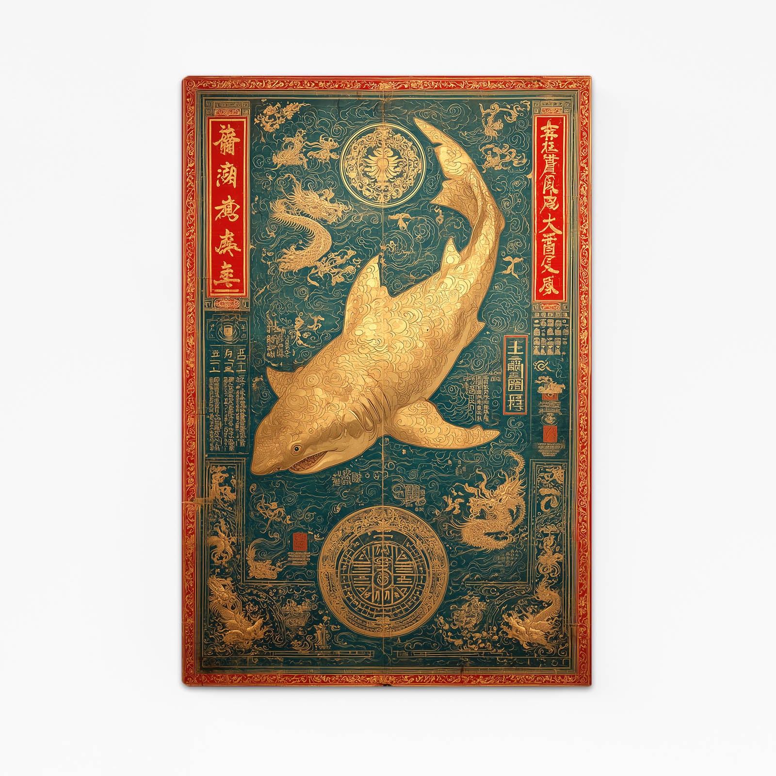This composition presents Chinese Shark Art through a powerful blend of tradition and symbolism, where marine energy meets refined cultural detail. The central figure feels intentional and commanding, immediately anchoring the viewer’s attention. Every element appears balanced, ceremonial, and meaningful. The overall presence is calm, confident, and deeply expressive.