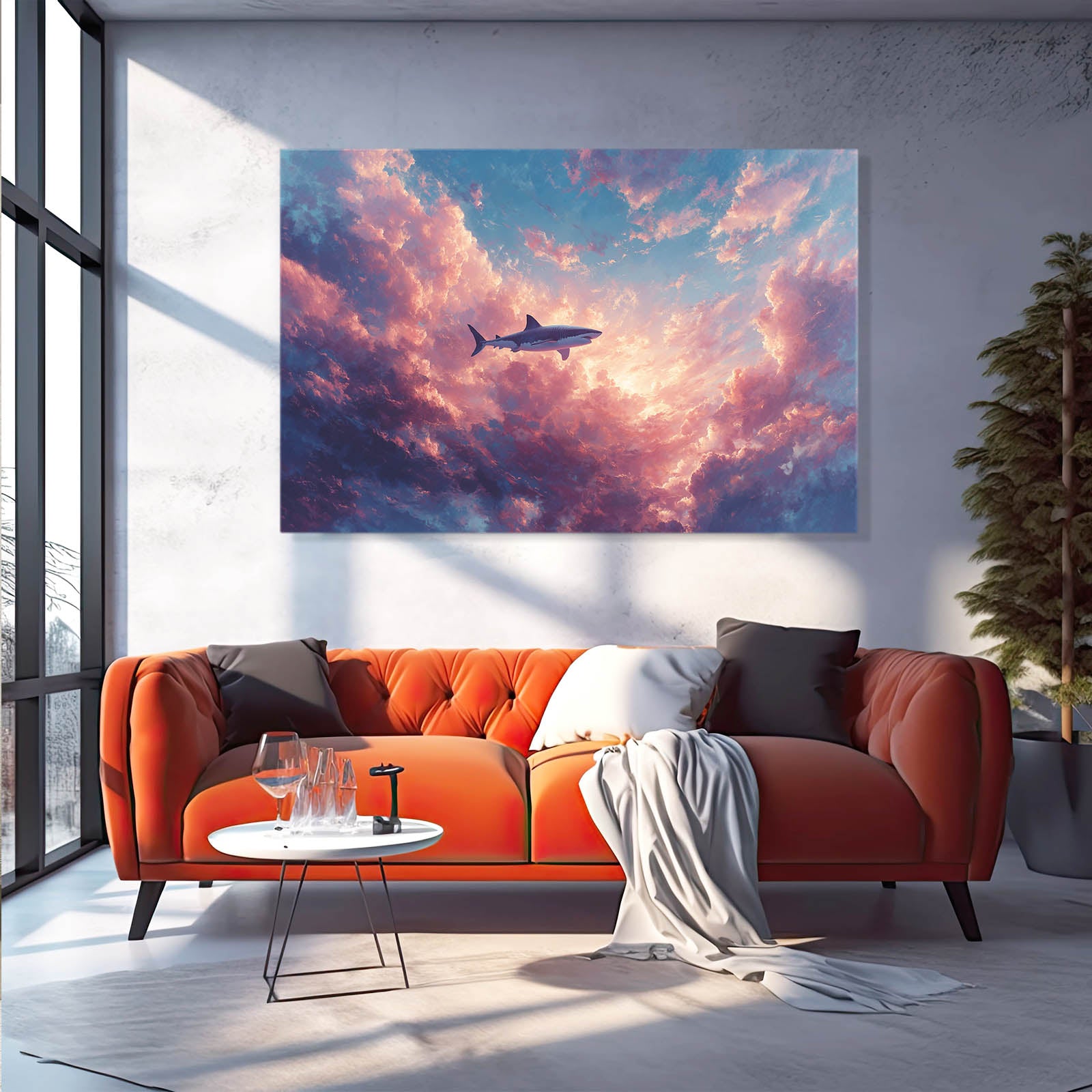 The surrounding clouds form a natural frame, giving the artwork a feeling of openness and infinite space. Light radiates gently from the center, enhancing the shark’s presence while maintaining a dreamlike balance that feels elegant and intentional. This visual harmony brings a subtle sense of wonder into the room.
