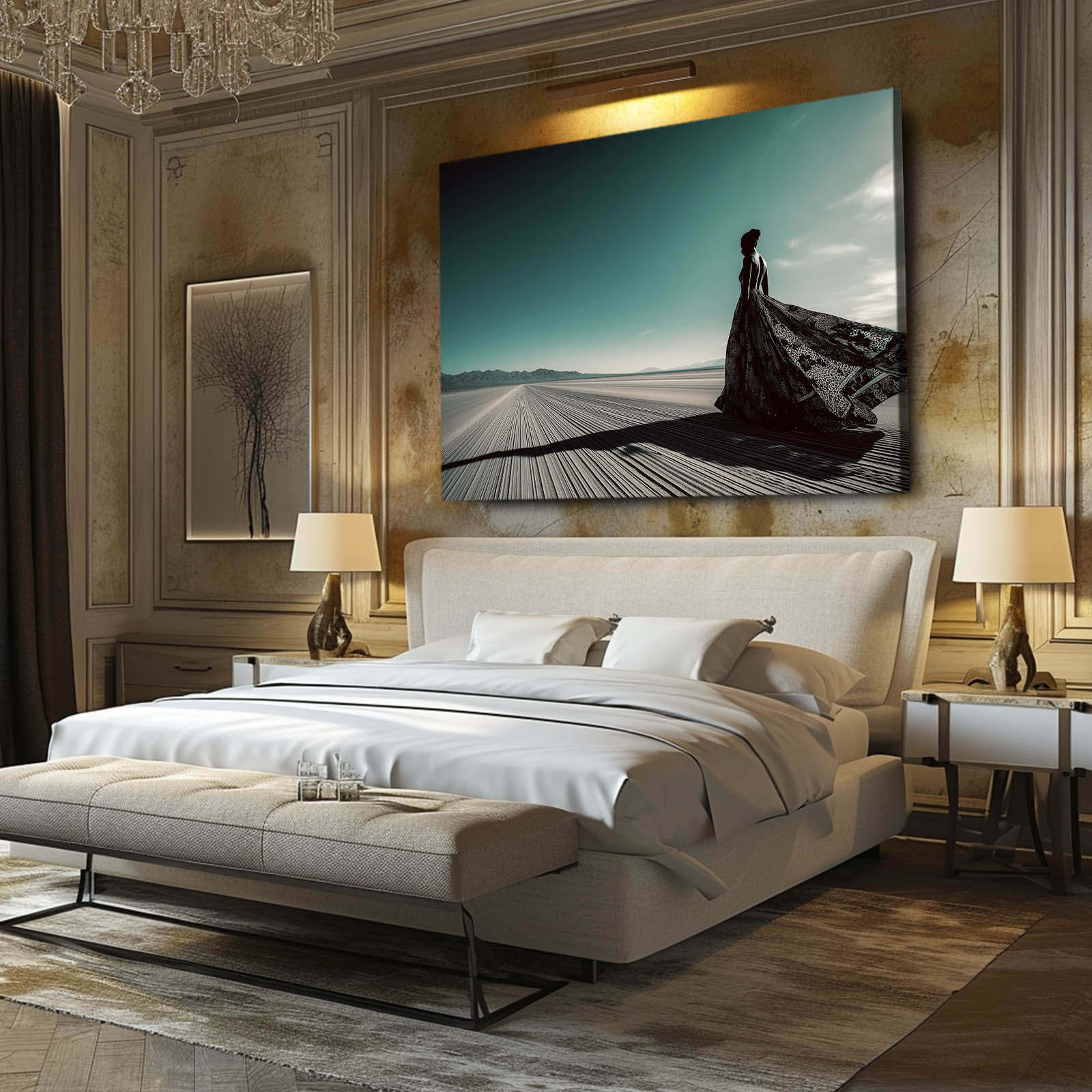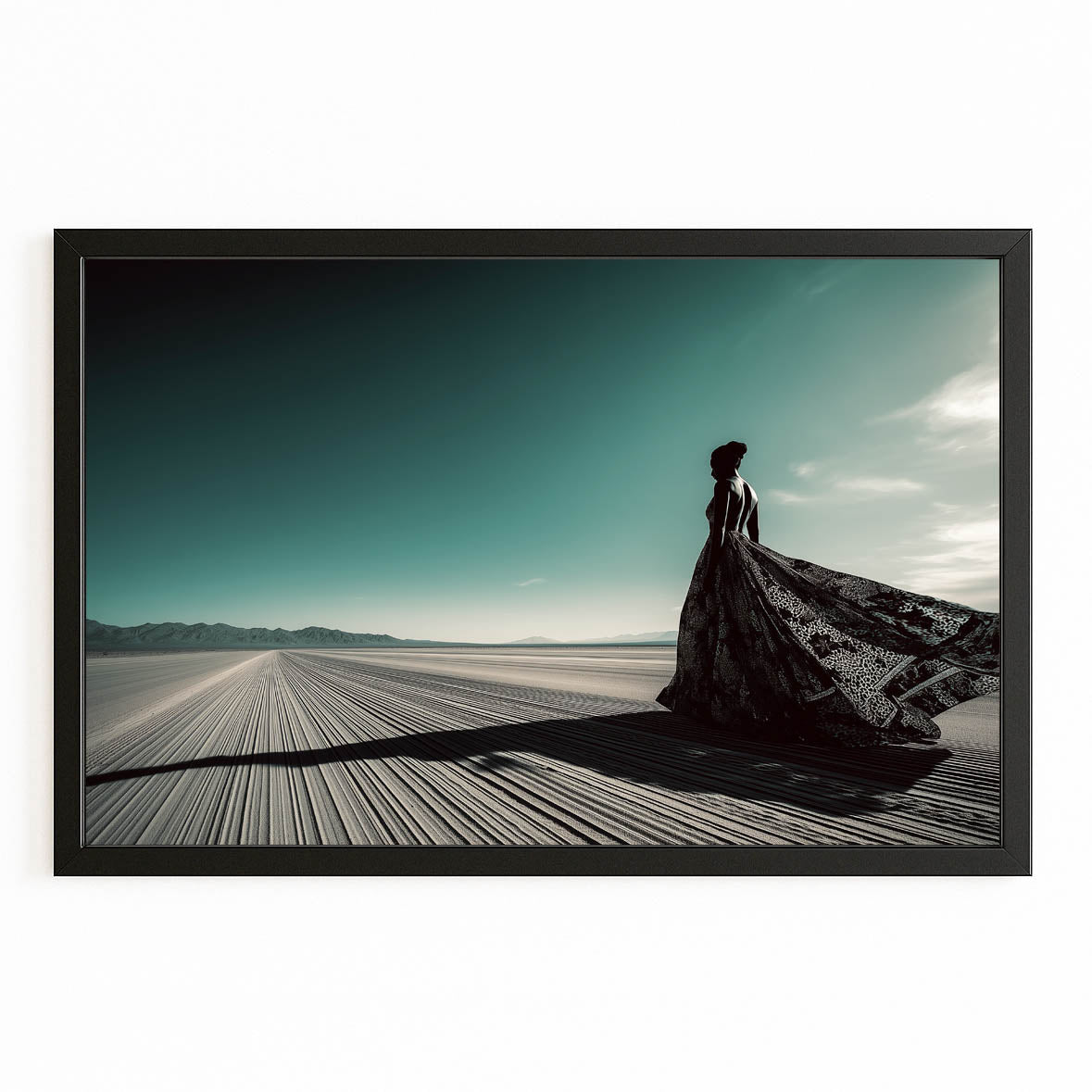 The figure standing gracefully against the endless sands embodies grace, resilience, and serenity. Every detail — from the wind-swept fabric to the vast, silent landscape — evokes a sense of infinite calm and empowerment. It is a celebration of beauty found in simplicity, and of art that speaks to the soul.