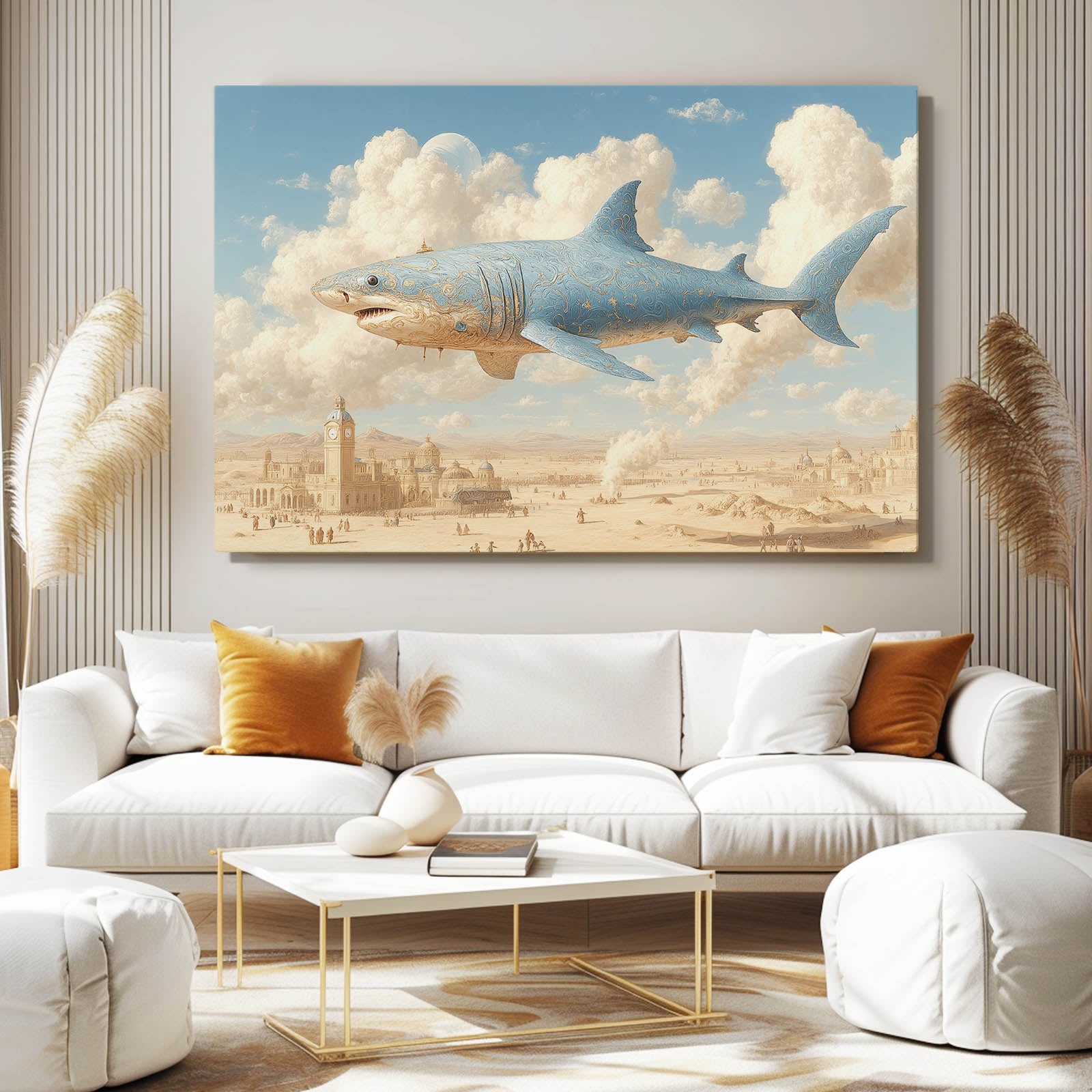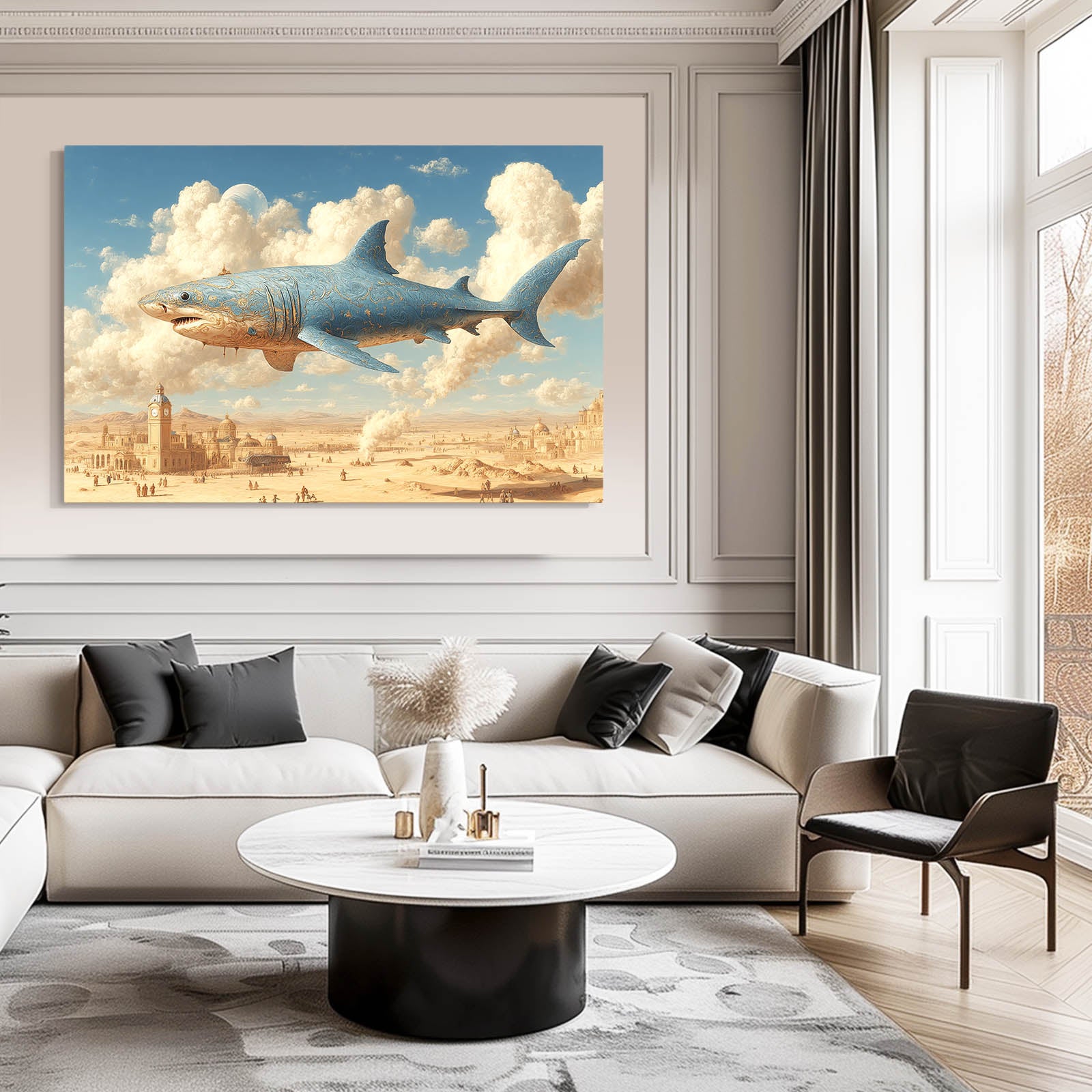 If this imaginative skyline vision resonates with your space, discover more expressive marine designs by exploring our Shark Art Collection.
