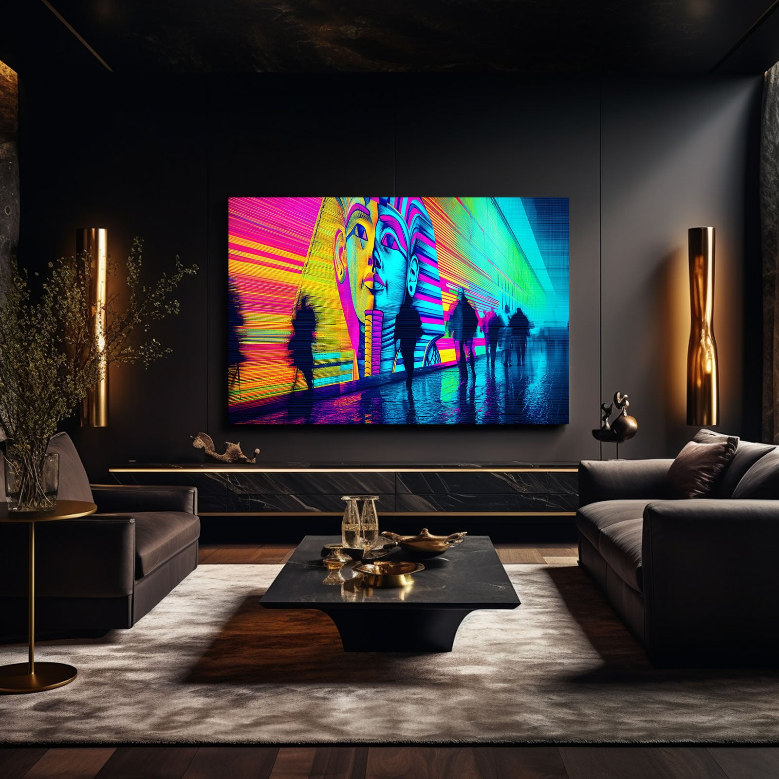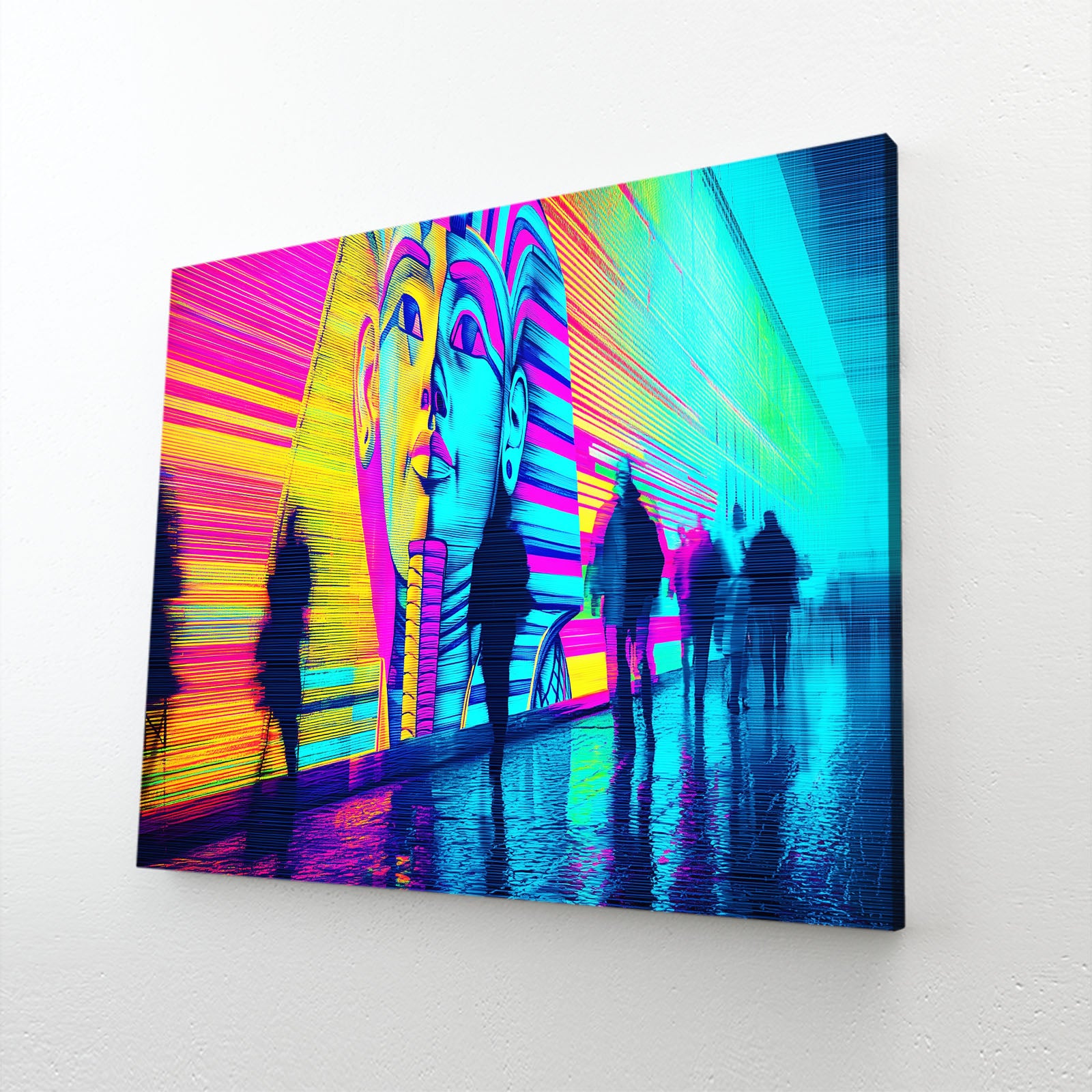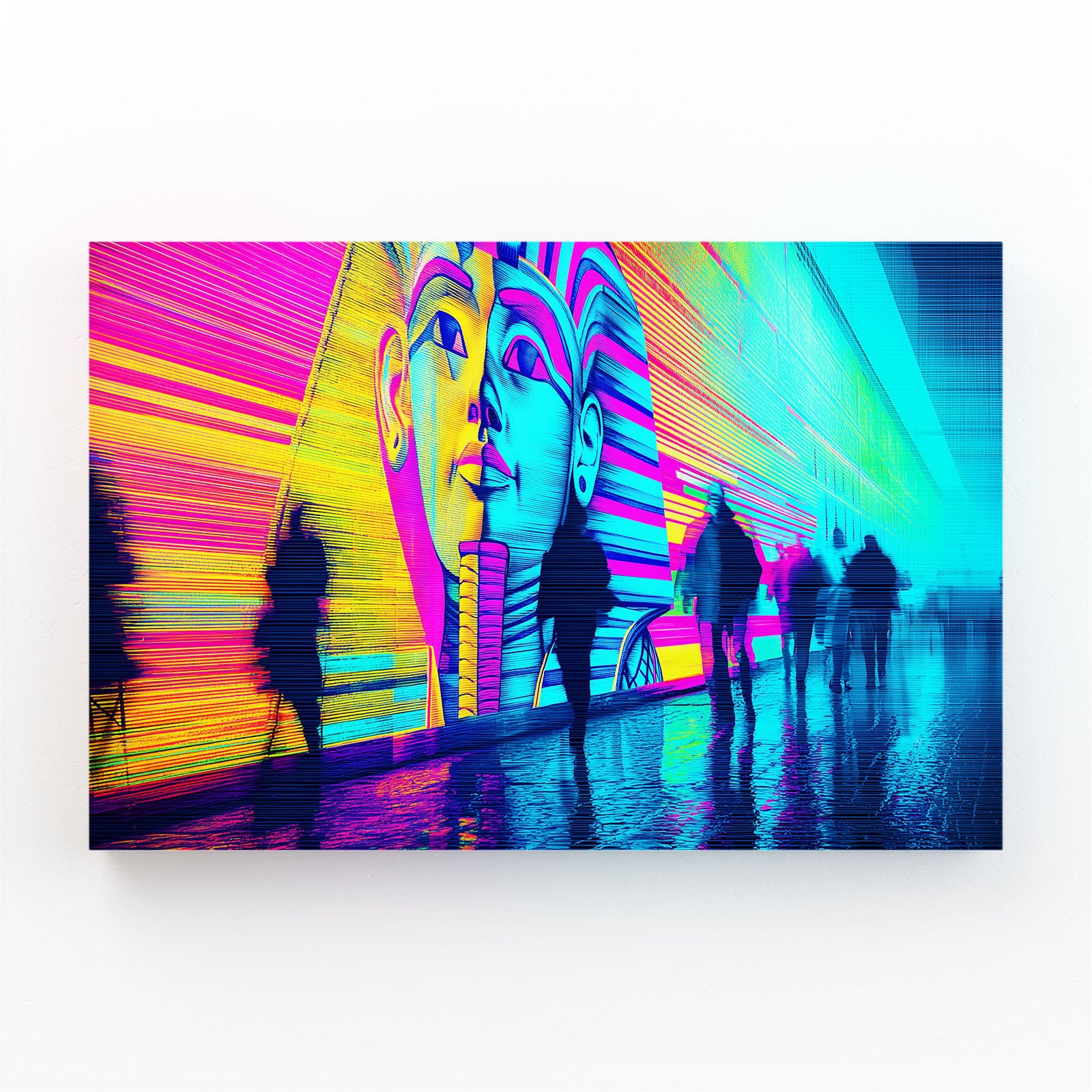 The striking contrast of neon blues, pinks, and yellows brings a sense of energy and movement, while the iconic Egyptian imagery adds a layer of history and depth. This piece is perfect for those who want to add a unique twist to their space, merging the past with the present.