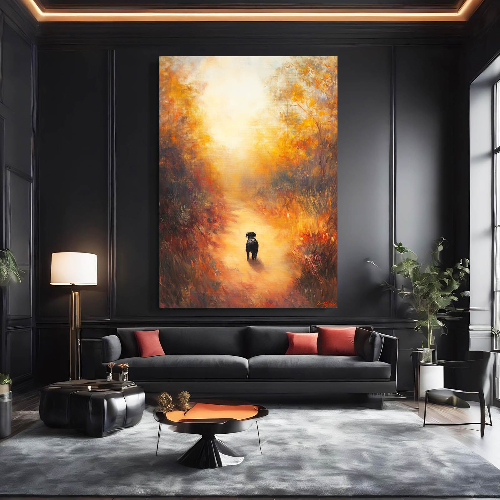 This Fall Dog Art is a beautiful reminder of the natural world, where every leaf and light creates a peaceful harmony. With its vibrant autumn hues, this piece offers a welcoming touch that brings nature’s rich colors indoors. It’s ideal for dog lovers and anyone who appreciates the gentle beauty of autumn.
