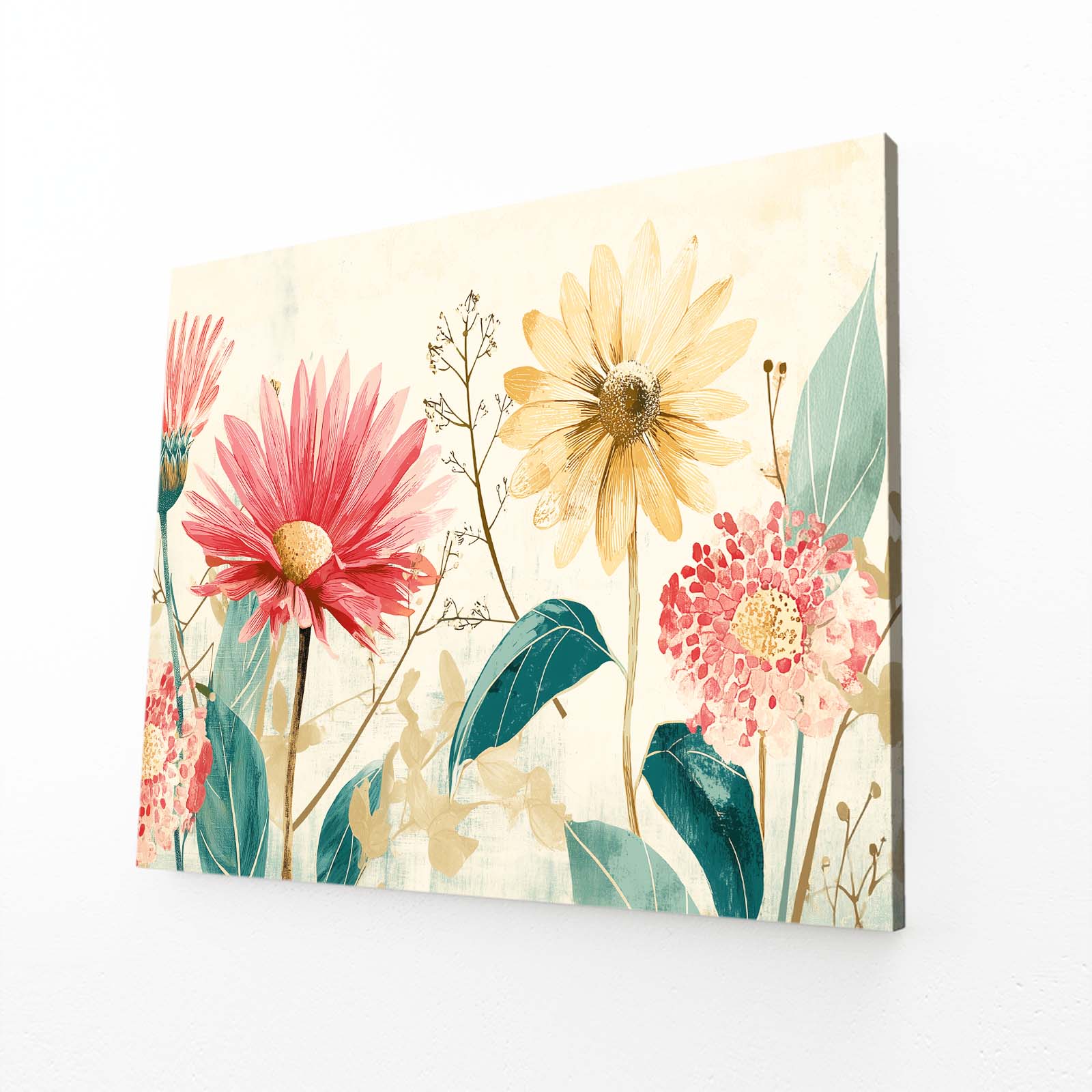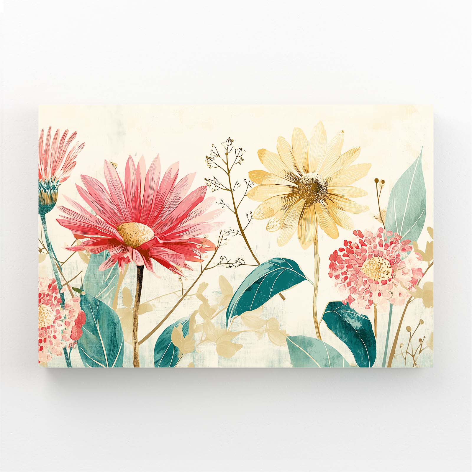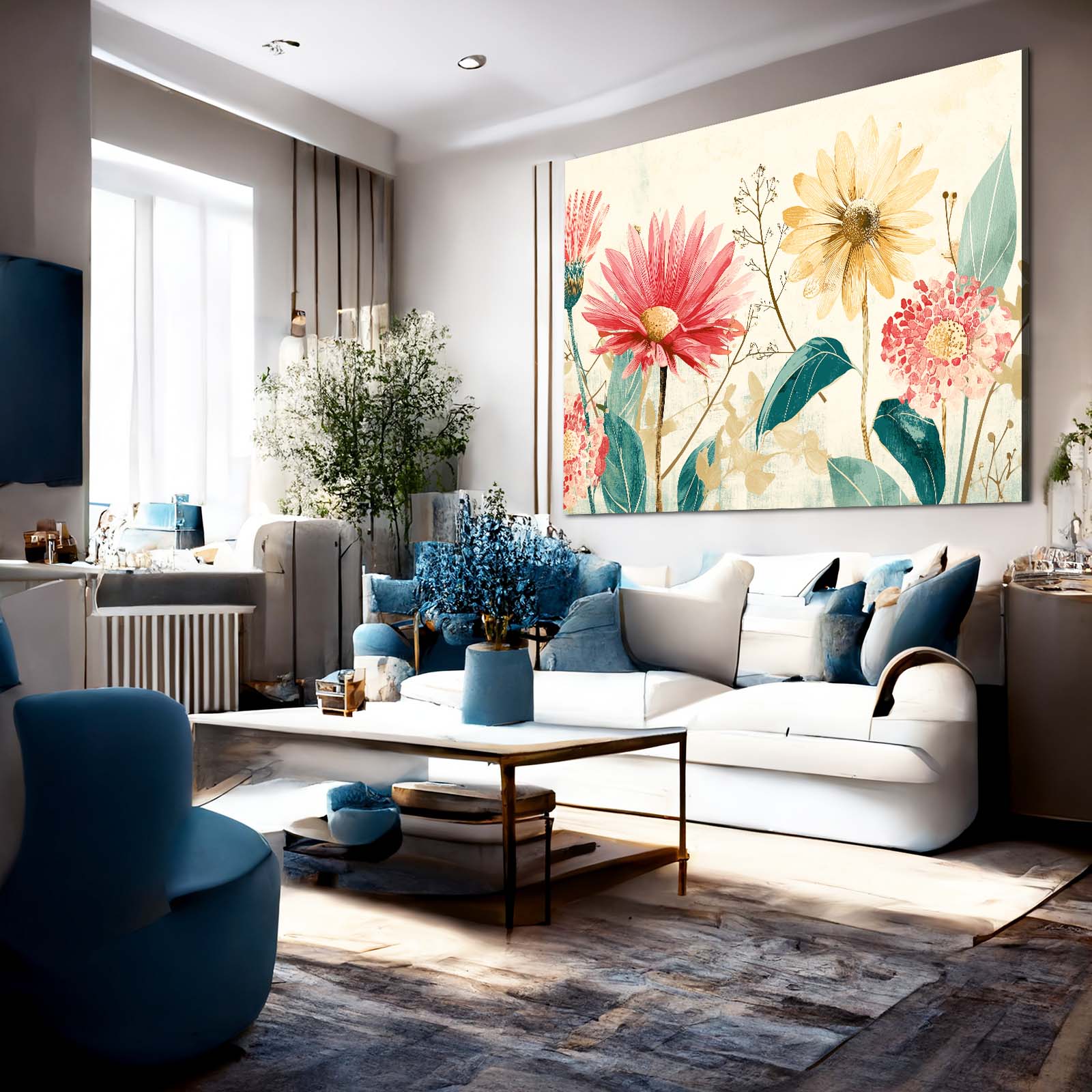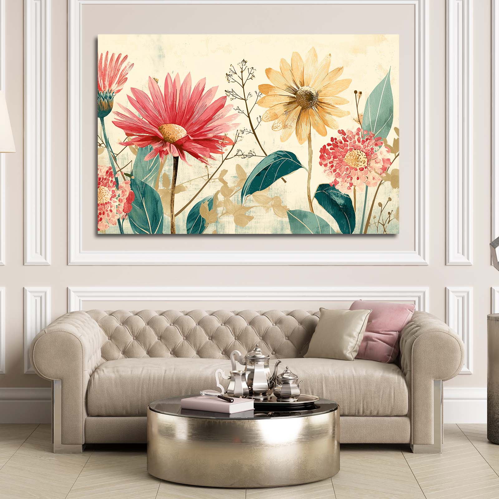 The bold daisies and charming wildflowers, combined with refreshing greens and soft neutral backgrounds, bring a balance of serenity and vitality. Every detail speaks of timeless farmhouse beauty, making this decor a perfect fit for both modern rustic and classic interiors.