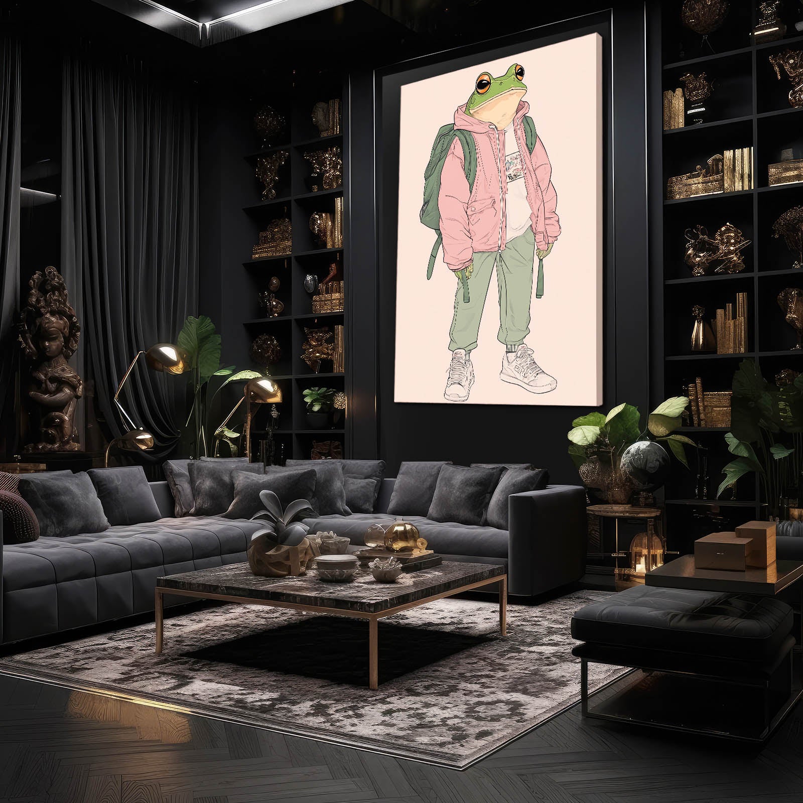 Introducing Frog Artwork, a captivating piece that brings a charming and quirky personality to any room. The vibrant colors and expressive character make it a perfect choice for both contemporary and casual settings. The frog, with its playful demeanor and trendy outfit, instantly draws attention and adds an element of fun to your decor.