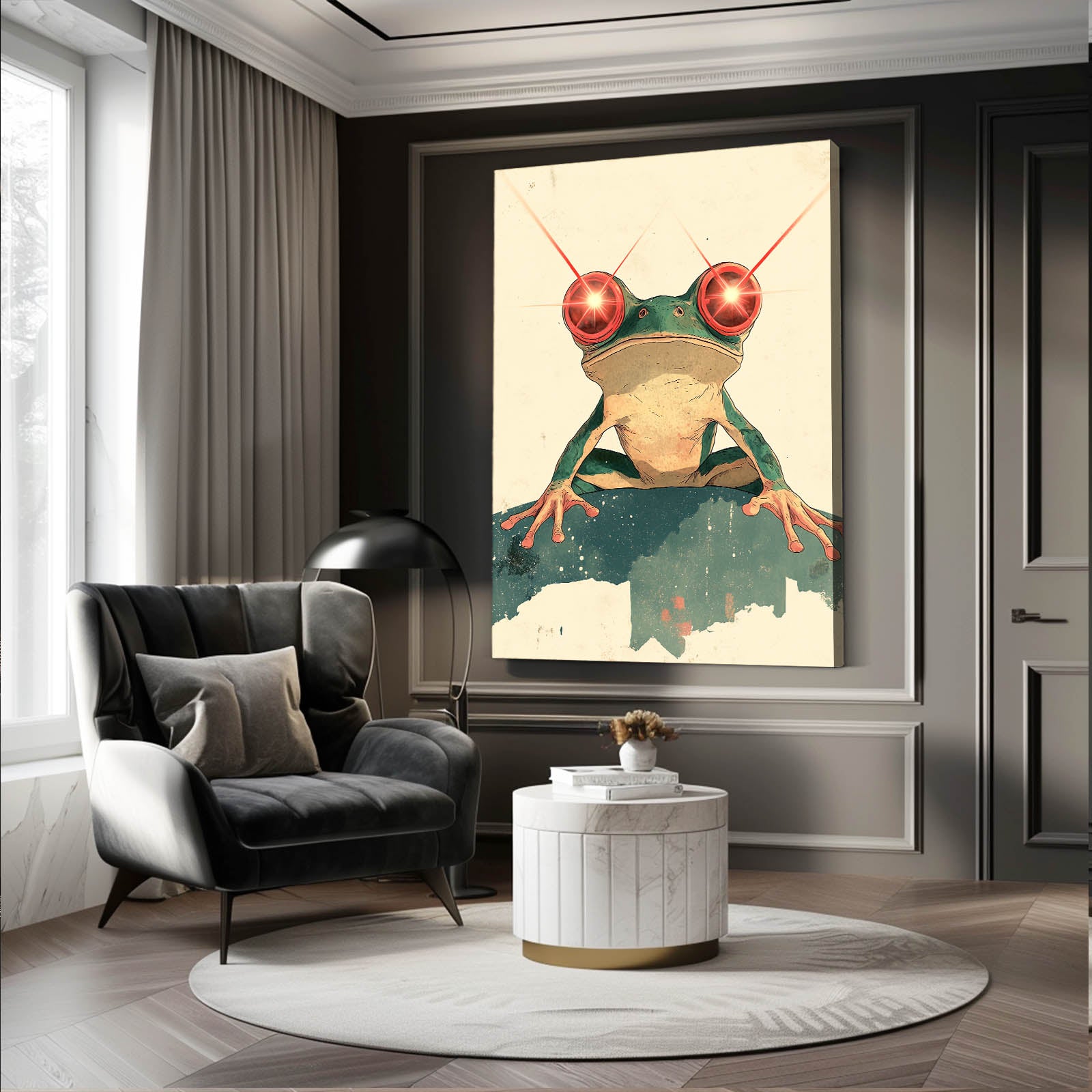 Introducing the captivating Traditional Japanese Frog Art, a striking piece that brings a unique blend of tradition and modern flair. The design features a frog with futuristic, laser-focused eyes, creating an intriguing contrast with the classic Japanese artistry. This artwork is sure to become the focal point of any living room, bedroom, or office, sparking conversation and admiration.