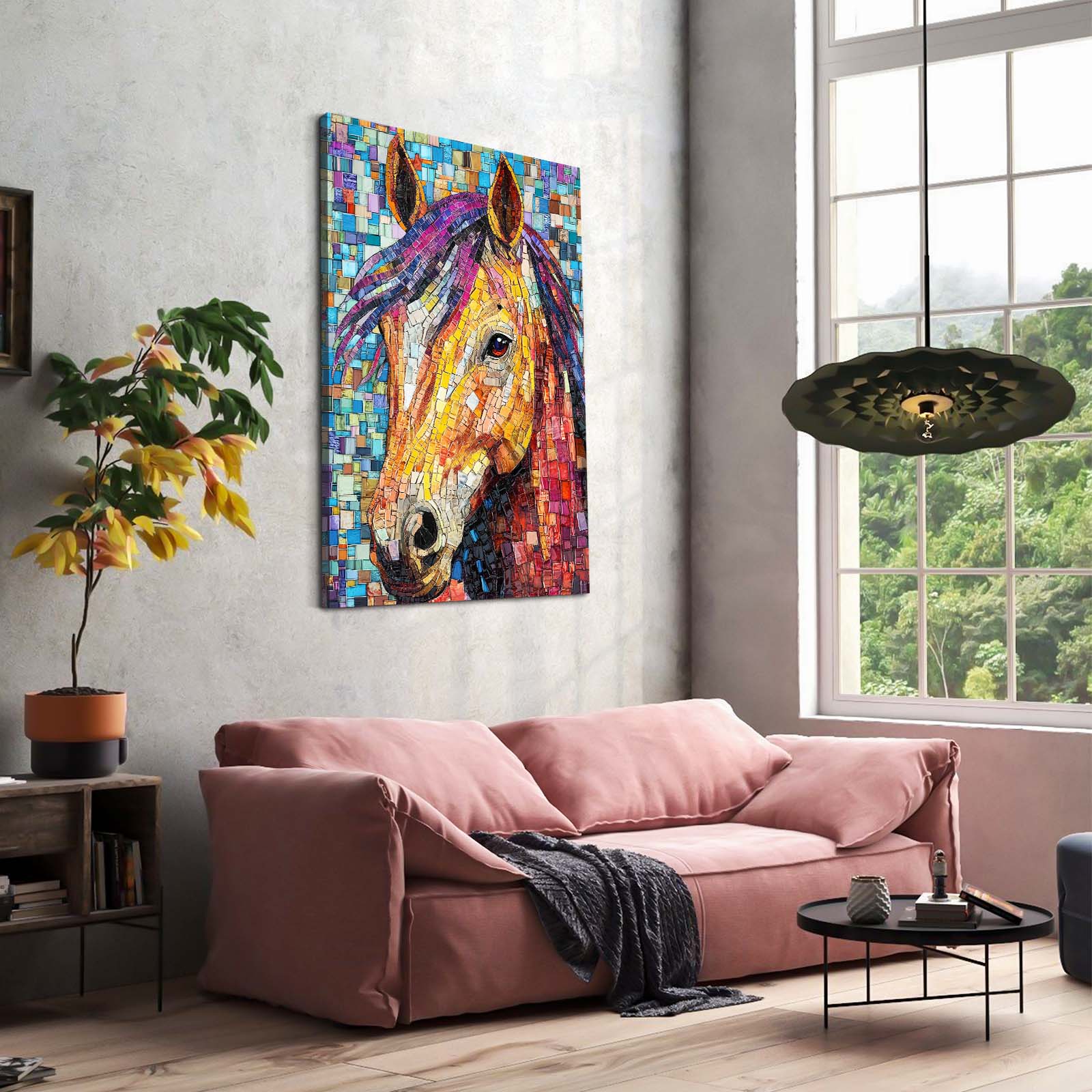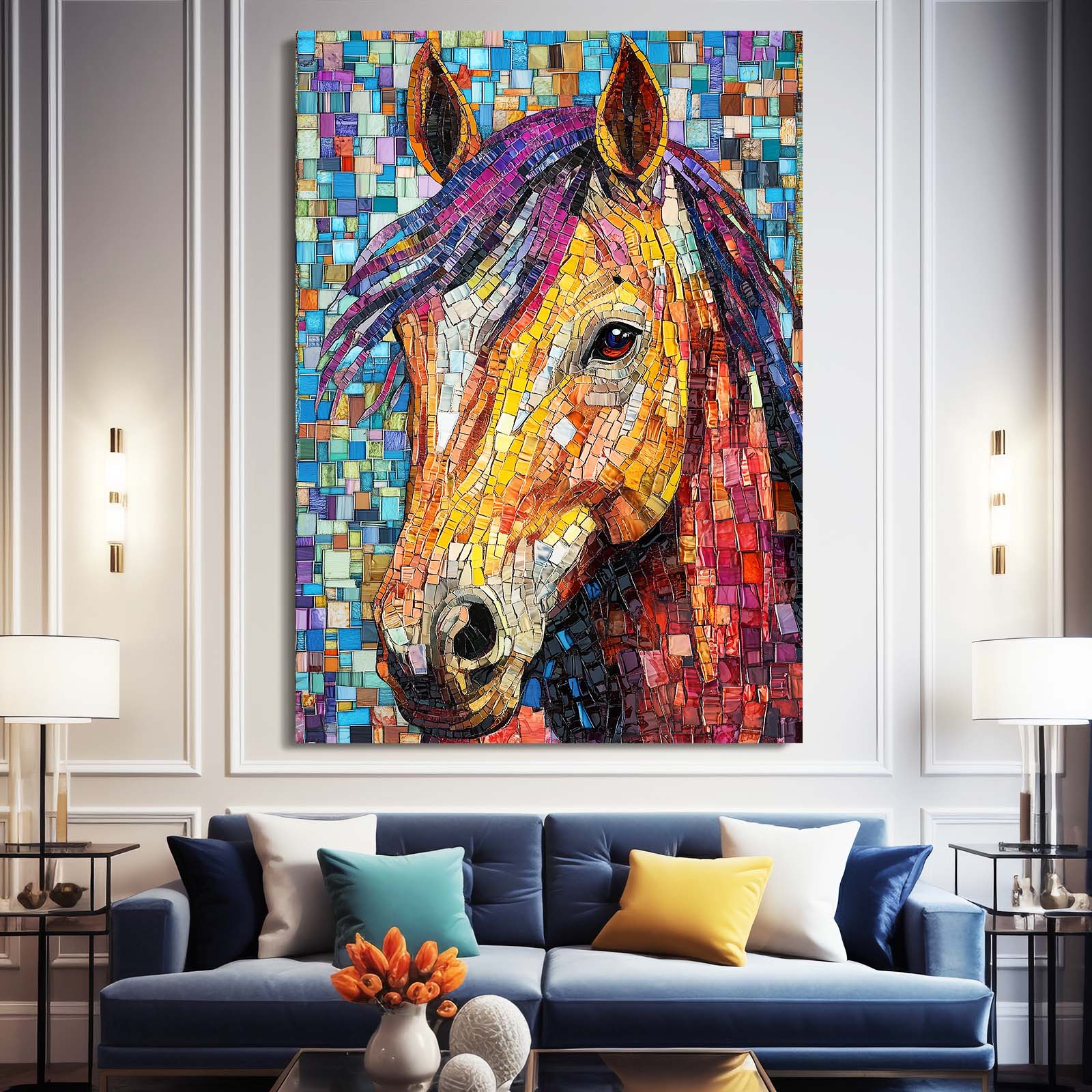 This mosaic horse art is perfect for adding a modern touch to your living room, office, or art collection. Its detailed composition and bold visual appeal make it a captivating conversation piece that will command attention and admiration from anyone who enters the room.