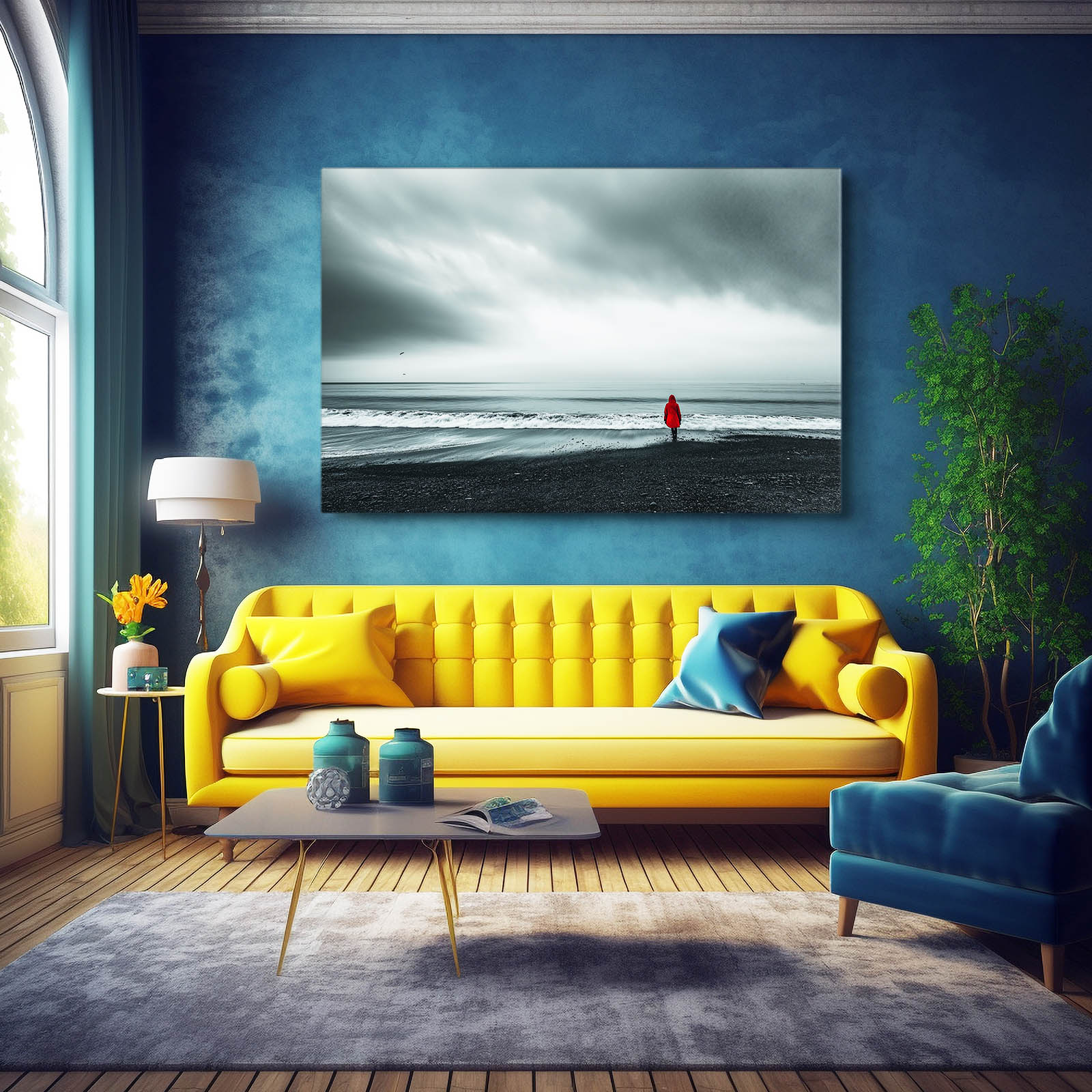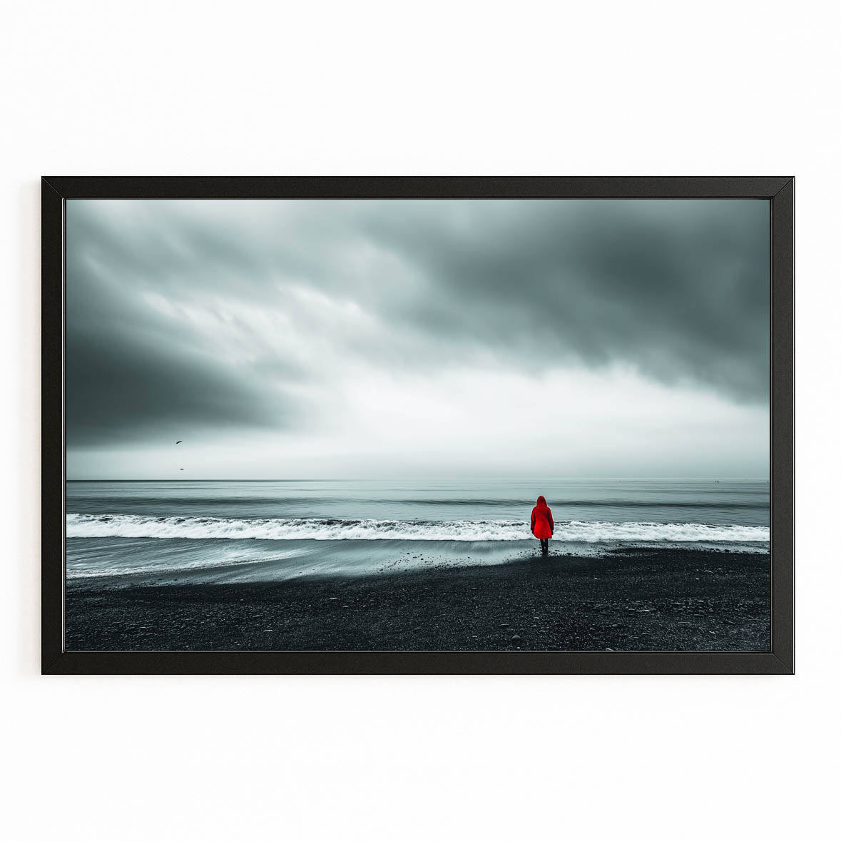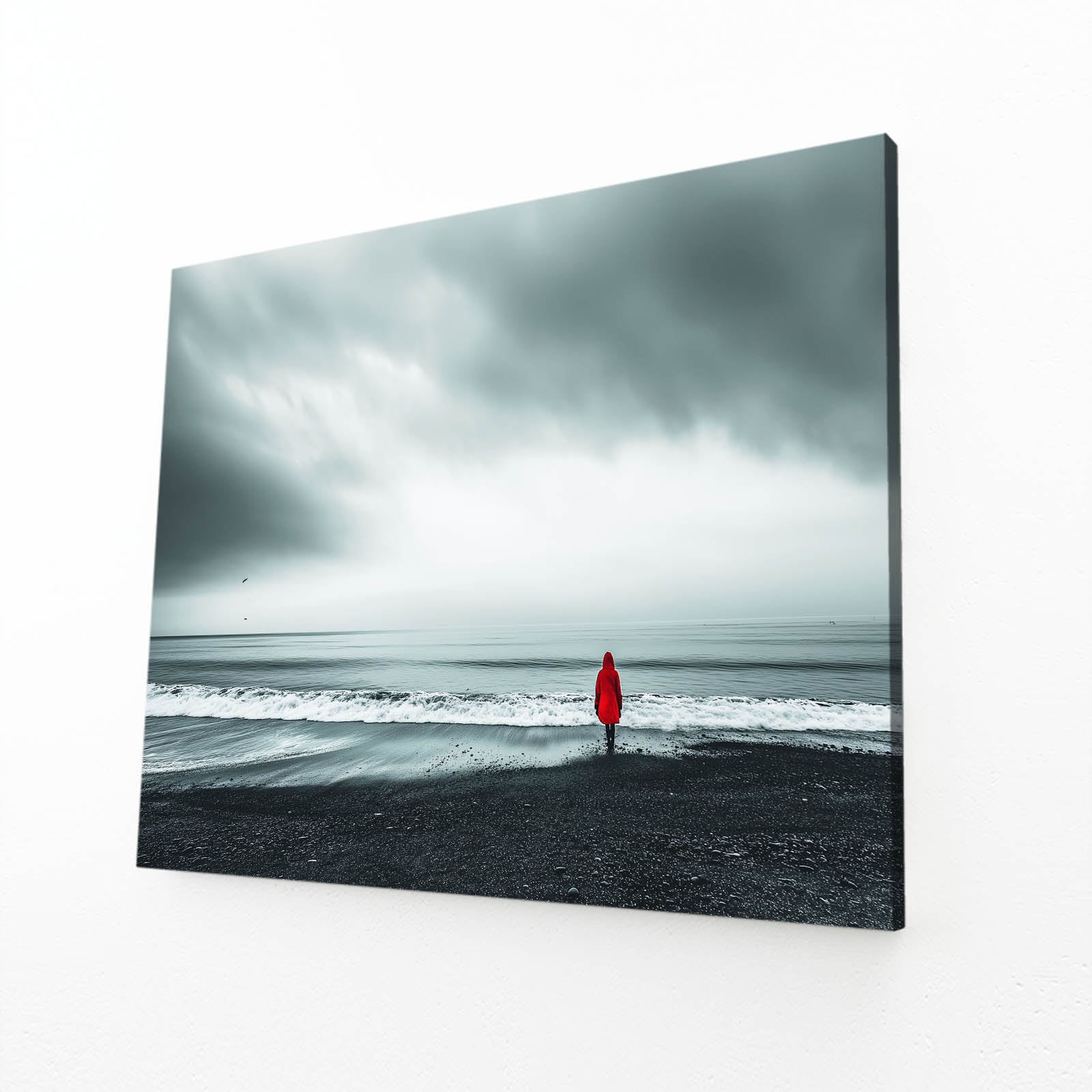At the center of the scene, a lone figure in vivid red contrasts beautifully against the serene grey landscape — symbolizing strength, individuality, and reflection. This striking composition evokes emotion and awakens your imagination, turning any wall into a gateway to peace and presence.