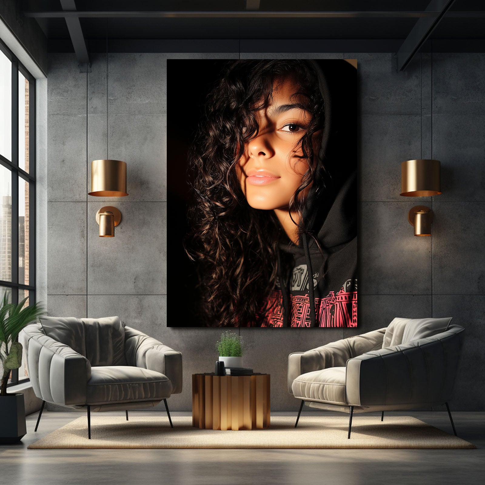The portrait’s play of warm tones and soft darkness embodies authentic emotion and natural beauty. Every detail — from the delicate curve of light on the skin to the soft texture of the fabric — is crafted to evoke depth and individuality. It’s a captivating artwork that radiates strength and sensitivity in one frame.