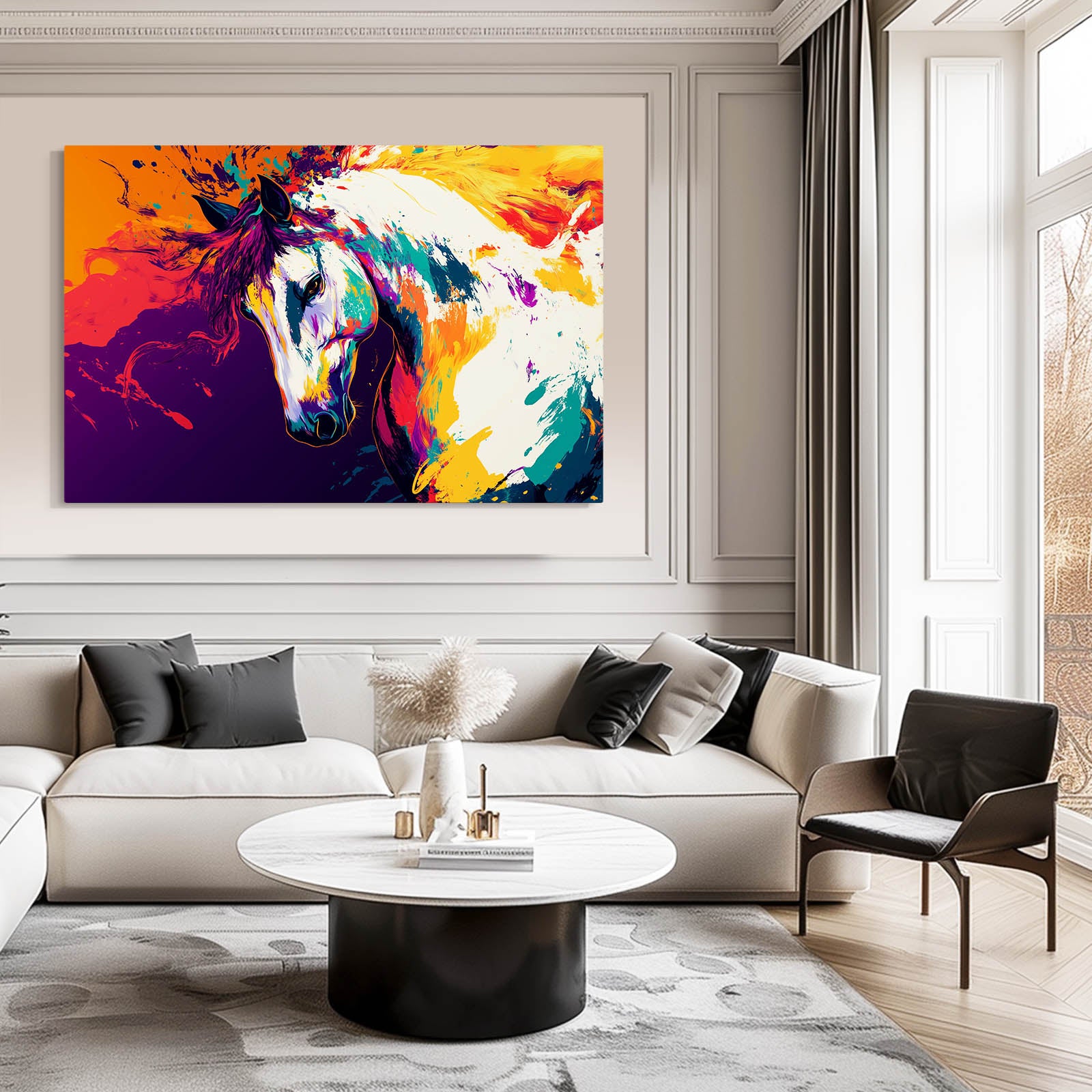 Step into a world of vibrant energy with the captivating Colors Horse Art. This stunning piece features a powerful and colorful depiction of a horse in motion, with bold splashes of bright hues and dynamic contrasts that bring life to any room. The vivid colors create a sense of freedom and movement, making it the perfect addition to your modern or eclectic space.