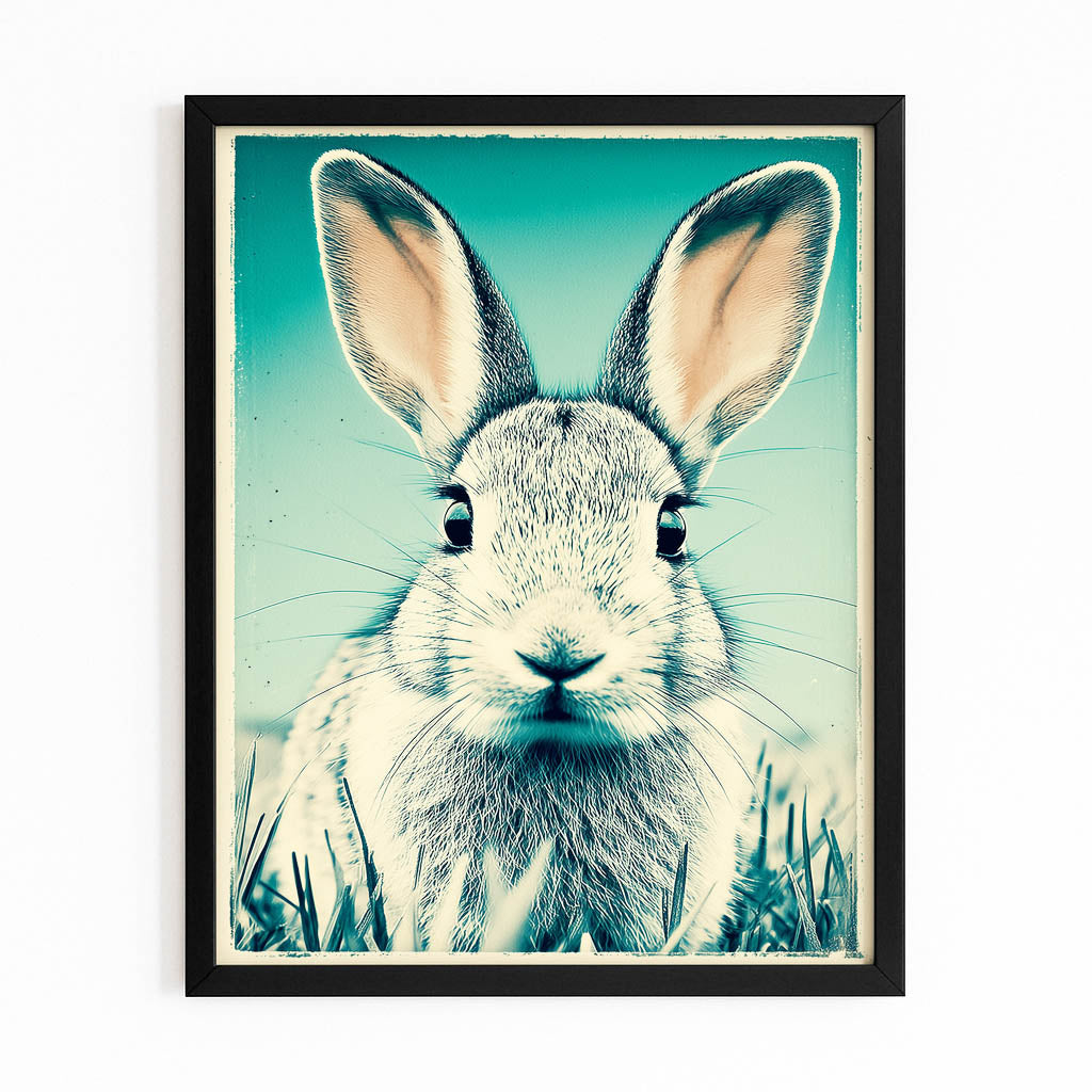 The rabbit’s expressive face and beautifully defined features create a captivating focal point filled with delicate charm and timeless appeal. Its bright eyes and alert ears add playful personality while the soft teal tones bring visual calm and balanced harmony. The gentle outdoor scene enhances a mood of peaceful simplicity.