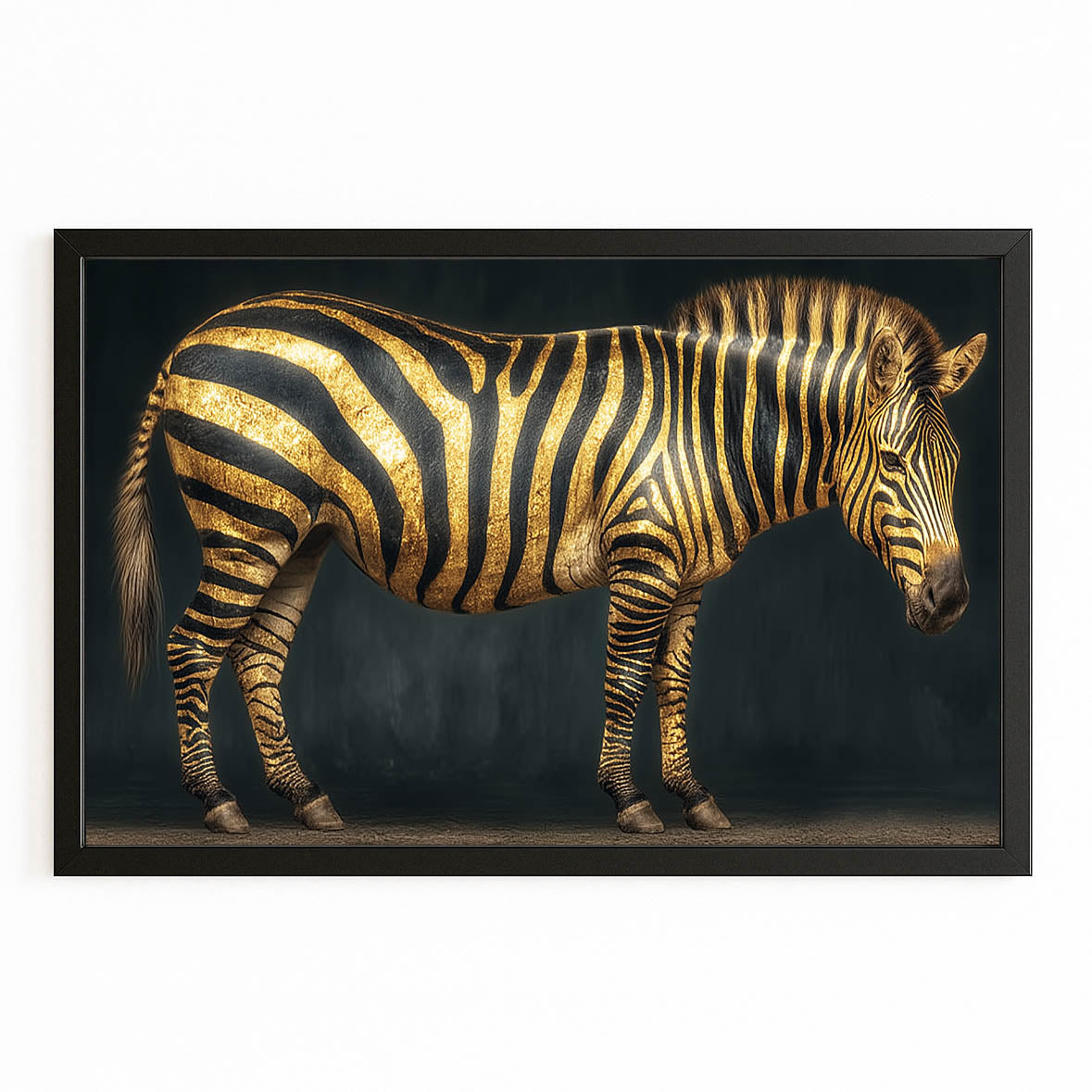 The interplay of gold accents against dark background delivers a dramatic yet balanced atmosphere. The zebra’s poised stance communicates elegance, authority, and timeless appeal. This harmony makes the artwork feel bold without being overwhelming.