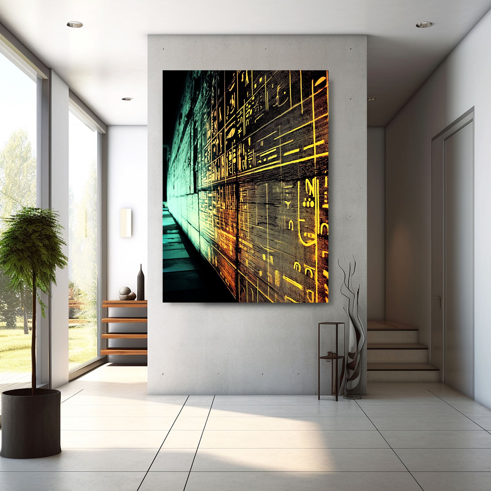 Immerse yourself in the captivating beauty of Futuristic Egyptian Art, where ancient Egyptian hieroglyphs are reimagined with a modern, digital twist. This striking artwork combines the mystique of Egyptian culture with vibrant neon colors, creating a harmonious blend of past and future. The illuminated yellow and green tones bring the ancient script to life, making this piece a stunning focal point for any space.