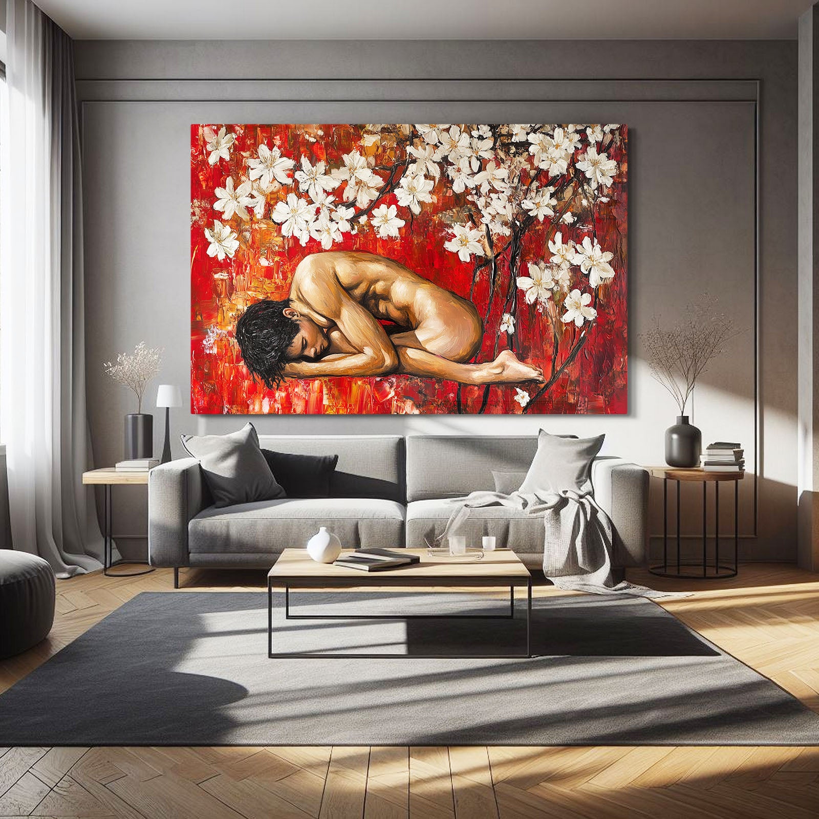 The man’s curled position exudes softness and surrender, surrounded by blooming white flowers that symbolize purity and awakening. The bold red background enhances the emotion, embodying both passion and rebirth. Every detail encourages the viewer to connect not just with the body, but with the silent language of emotion.