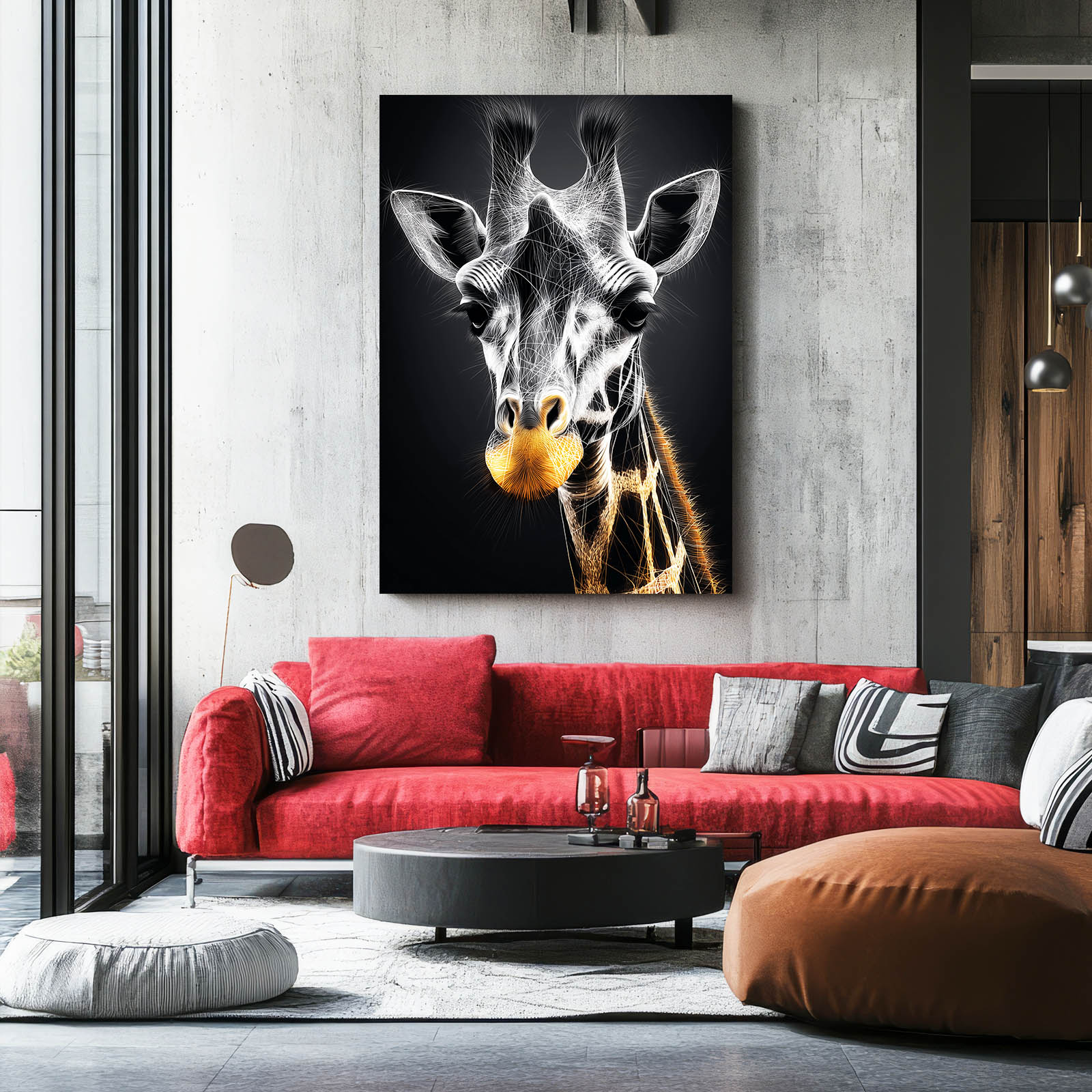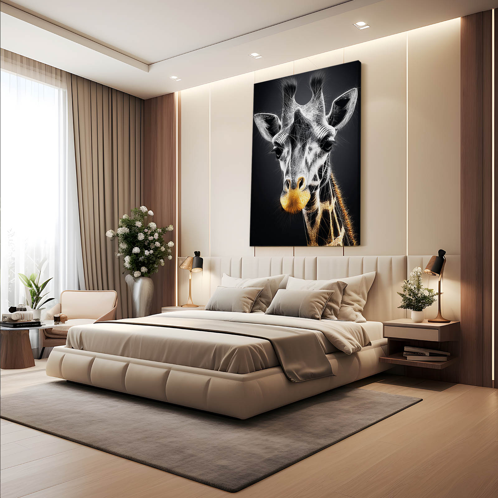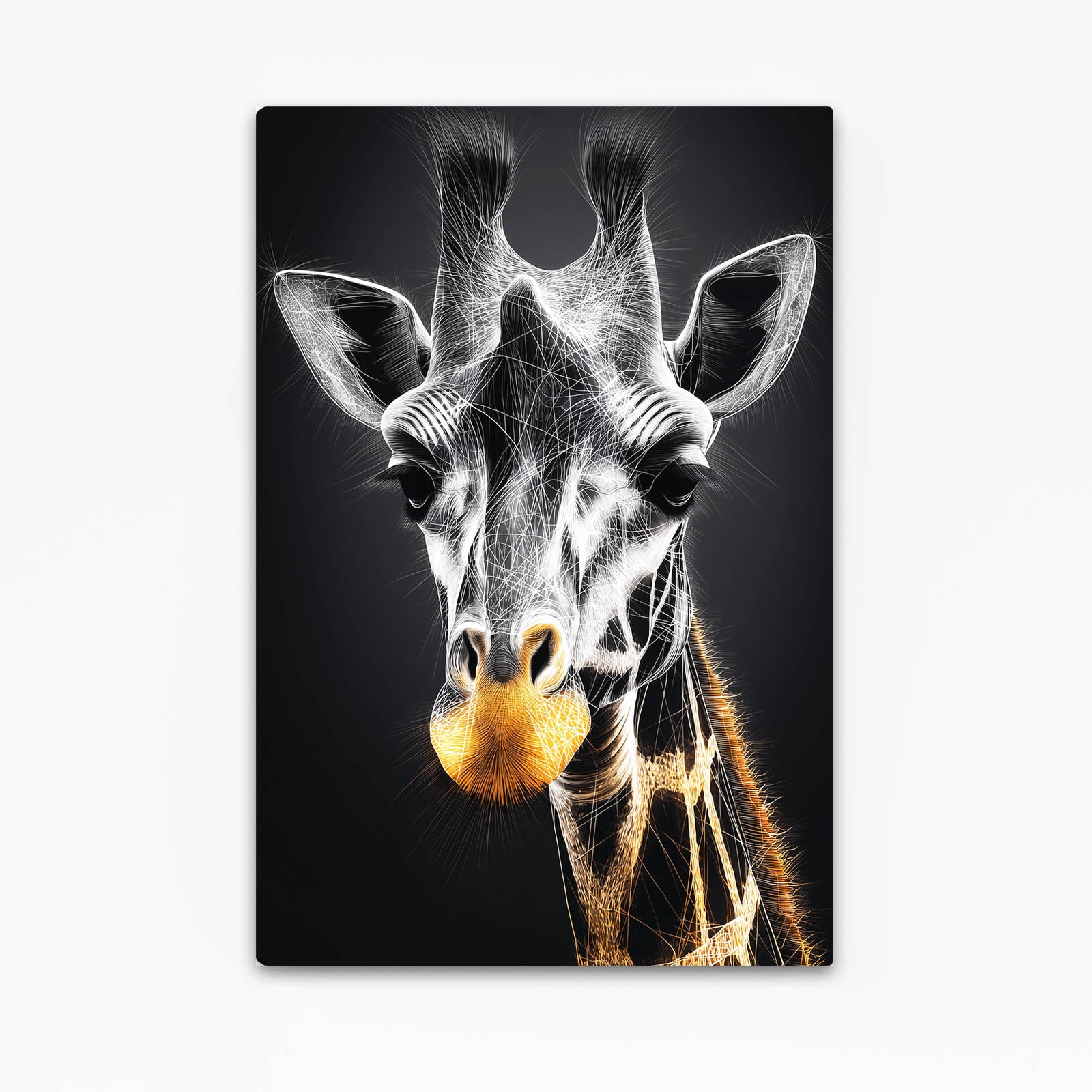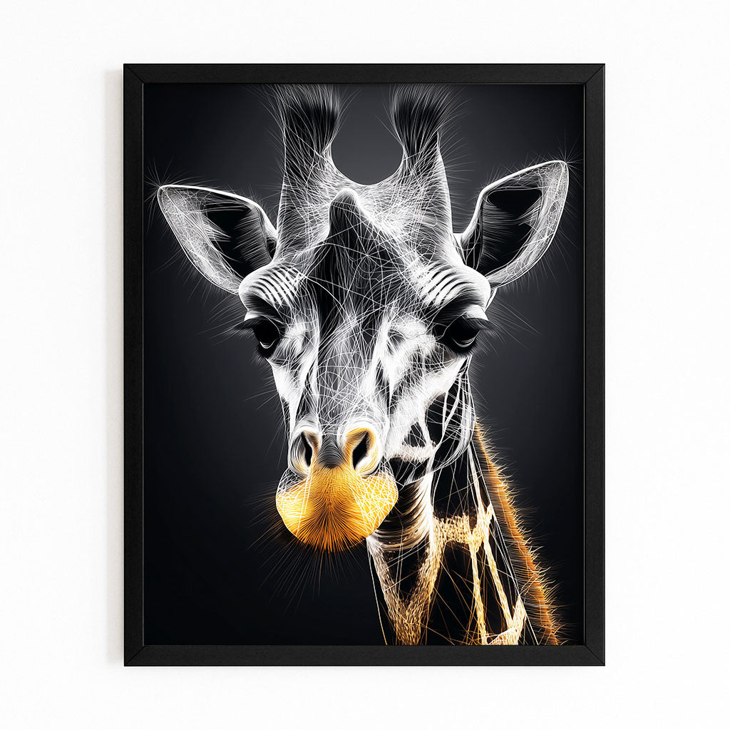The Giraffe Artwork Black And White combines bold monochrome tones with a radiant golden touch, creating a piece that is both modern and sophisticated. Its design commands attention and adds an unmistakable luxury feel to any room.