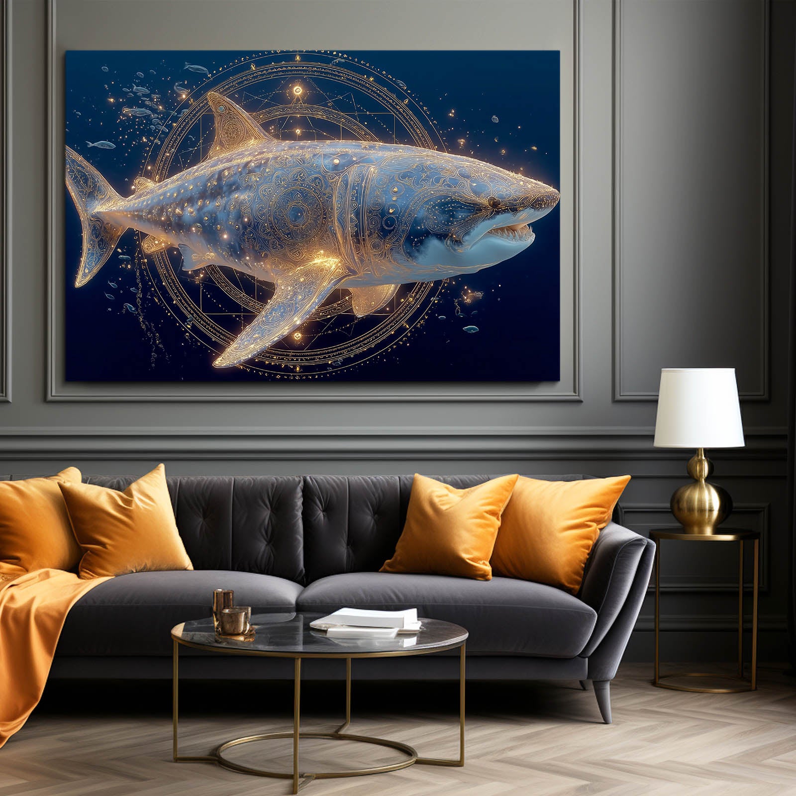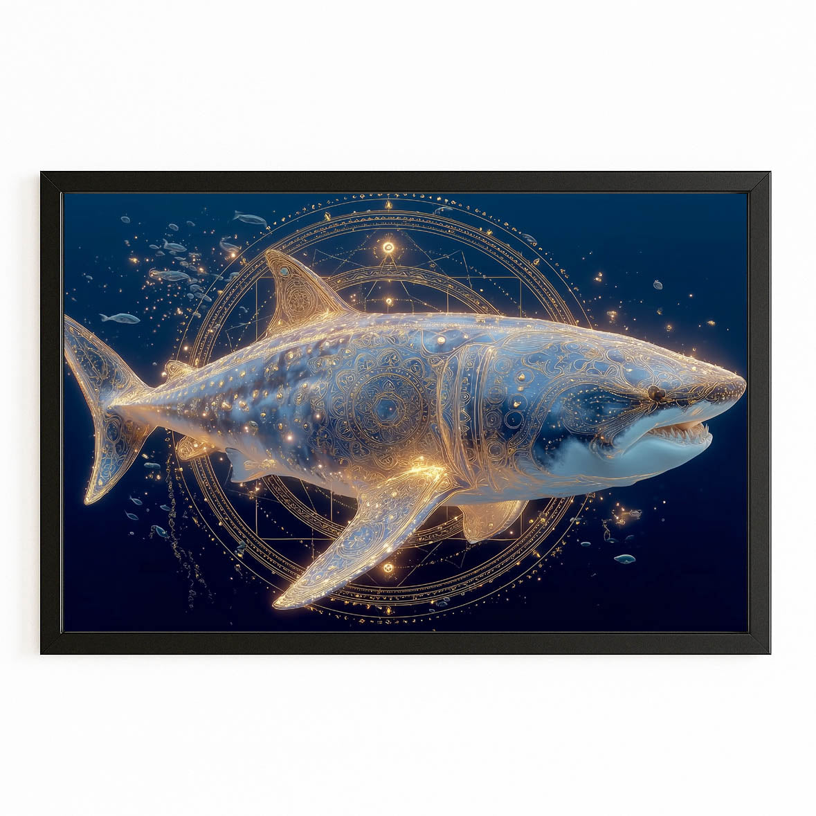 This artwork immediately evokes a sense of wonder, balance, and quiet power, inviting the viewer into a refined cosmic narrative. The Astral Shark Art appears suspended within luminous geometry, blending elegance with an almost otherworldly calm. Its presence feels intentional and majestic, creating an emotional pause that draws attention without force. The composition speaks softly yet confidently.