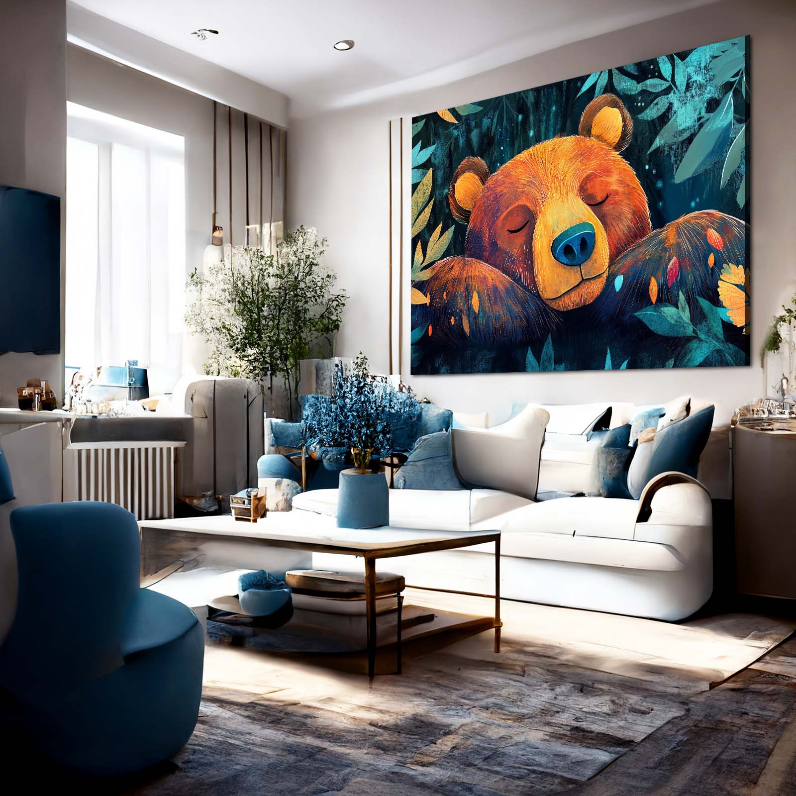 Experience the charm of nature with the Bear Wall Art Cute. This delightful artwork captures the peaceful and serene essence of a sleeping bear, surrounded by a lush forest. The warm colors of the bear's fur, paired with the vibrant floral details around it, create a comforting and cozy atmosphere in any room.