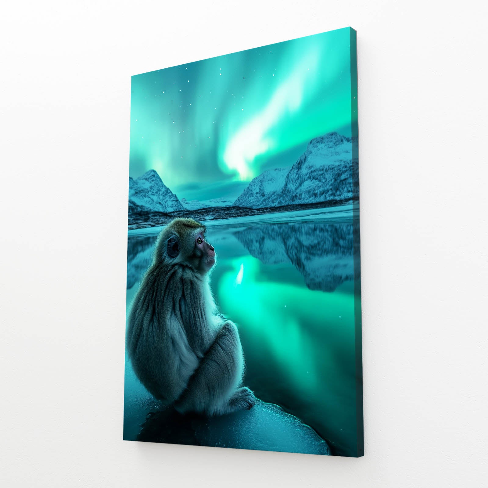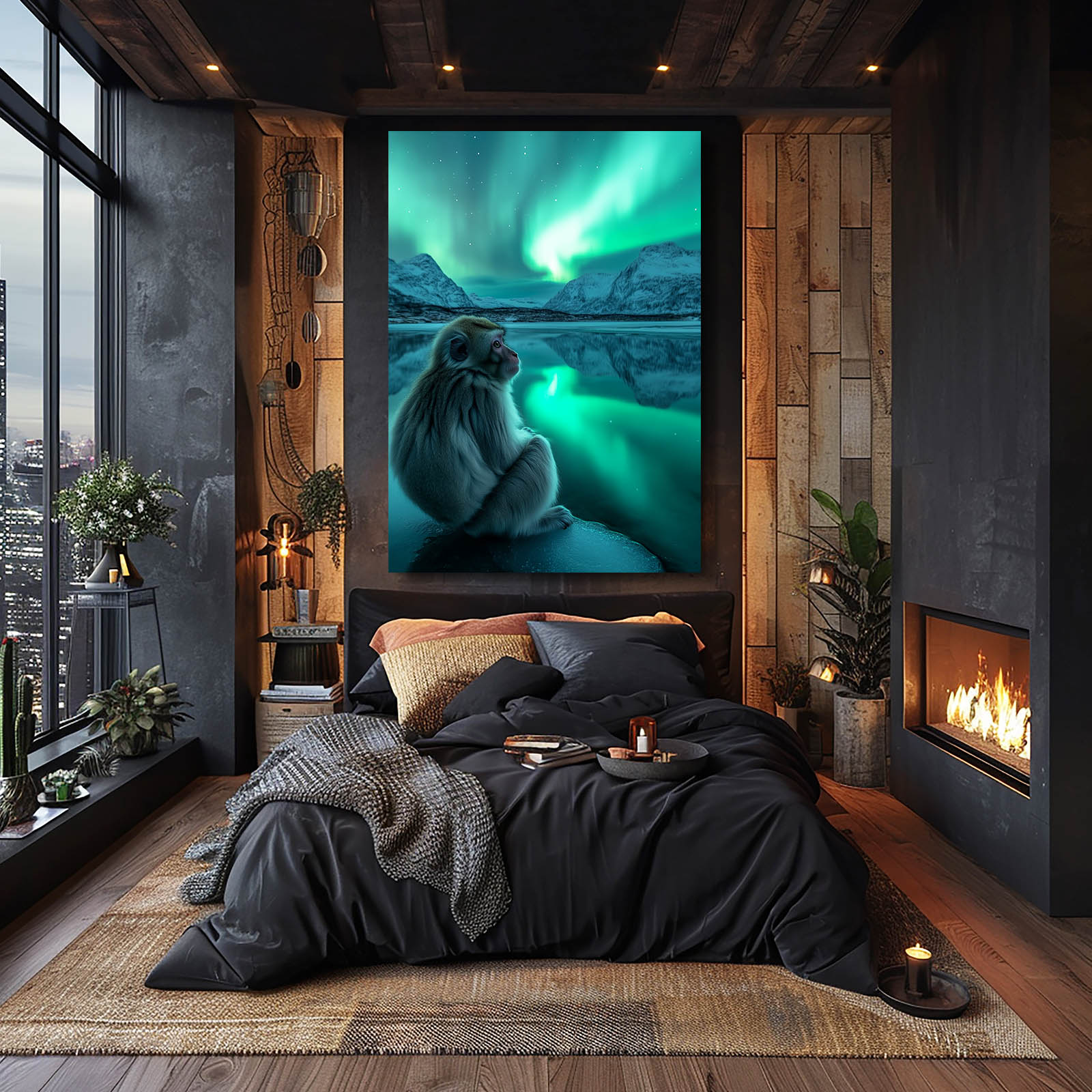 Let Deep Blue Monkey Art guide you into a dazzling realm beneath the northern lights, where the monkey’s calm presence and the serene reflection on icy waters create a peaceful aura that captivates your senses 😊.