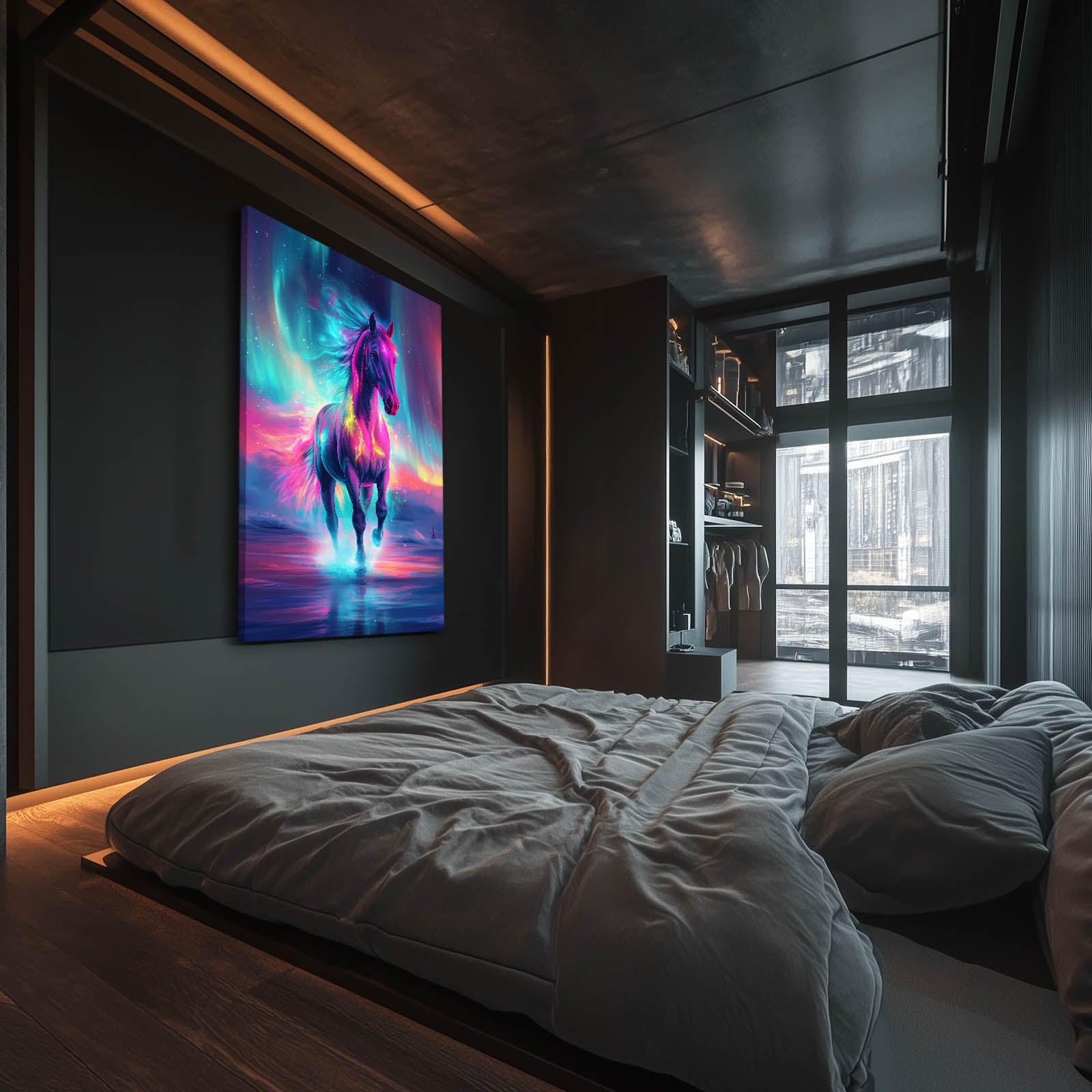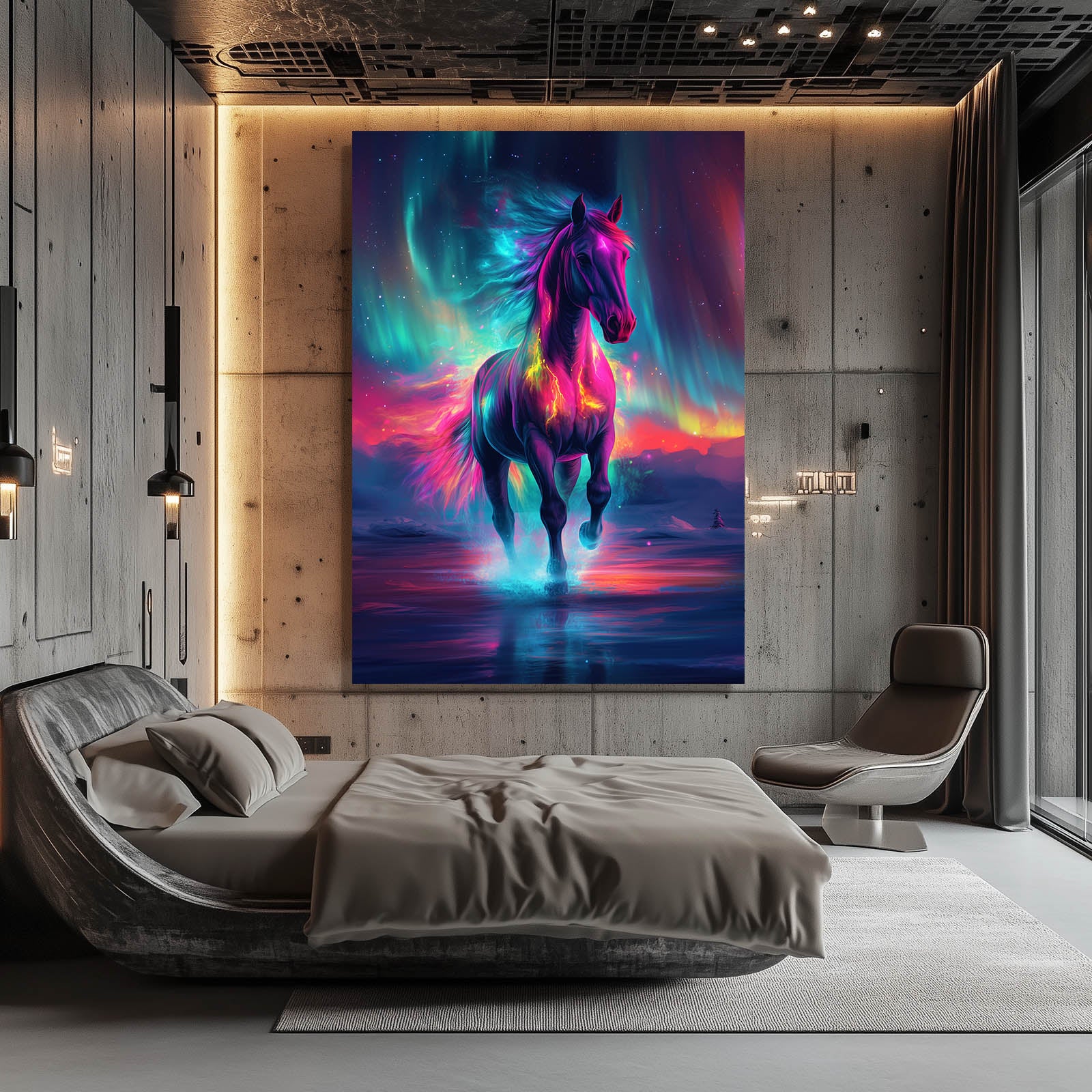 Fantasy Art Horse is an extraordinary blend of vibrant colors and magical energy that creates a breathtaking visual impact. The horse, glowing in shades of purple, pink, and blue, emerges from a cosmic landscape, embodying strength, grace, and mystical power. This art piece will captivate anyone who desires to add a touch of fantasy and magic to their home.