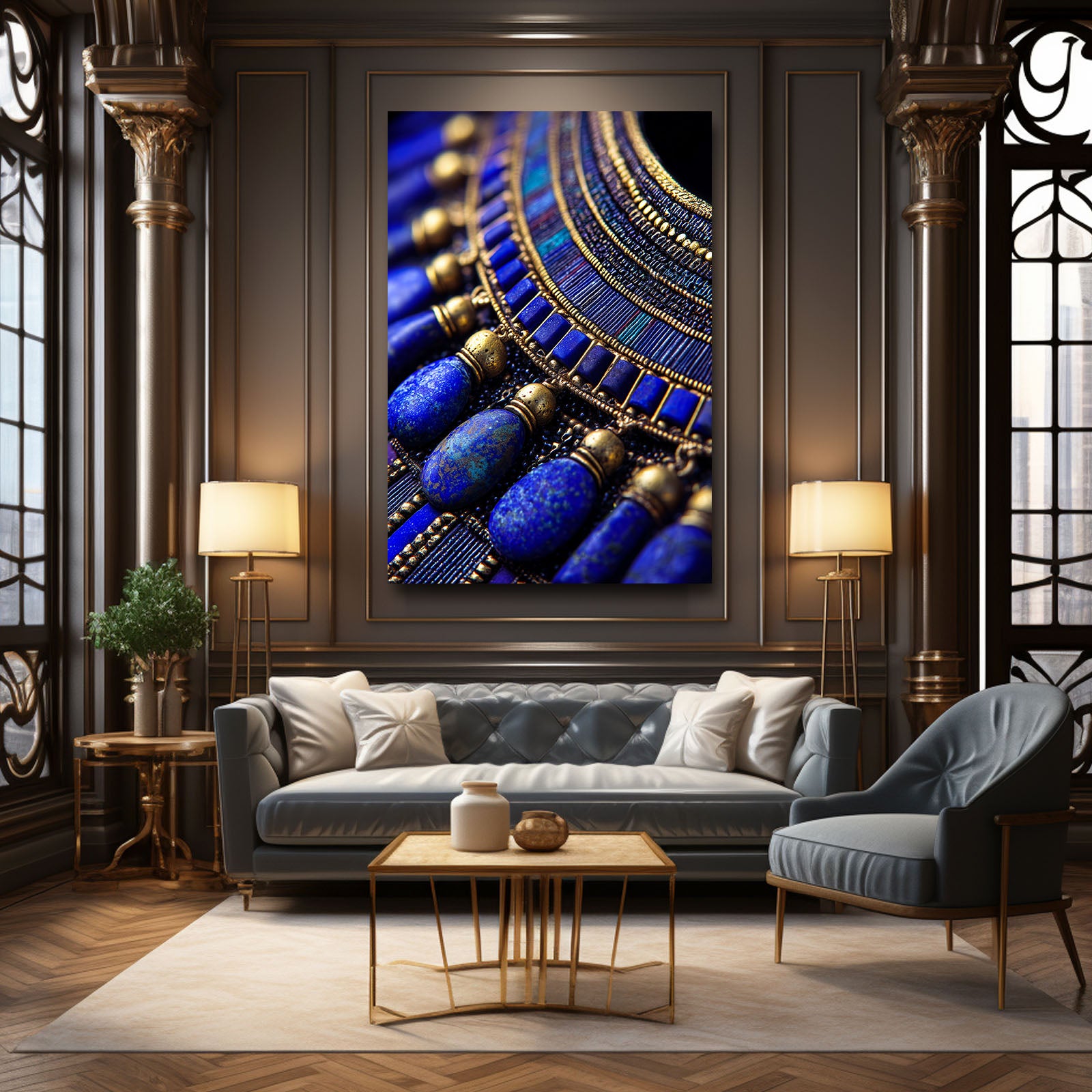 Discover the mesmerizing beauty of Fantasy Egyptian Art, where ancient symbolism meets modern artistic flair. This captivating piece showcases a stunning Egyptian necklace with intricate lapis lazuli stones and delicate gold accents, reflecting the regal elegance of Egypt's ancient royalty. The vibrant blue tones of the necklace are brought to life in vivid detail, giving a sense of both mysticism and grandeur.