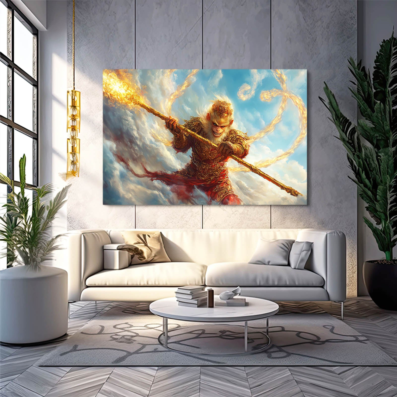 Step into a celestial realm where Fantasy Monkey Art wields a blazing staff and radiates a fiery aura 🔥. The majestic armor and bold colors create a dramatic scene that immediately draws the eye, offering a captivating centerpiece for any room.