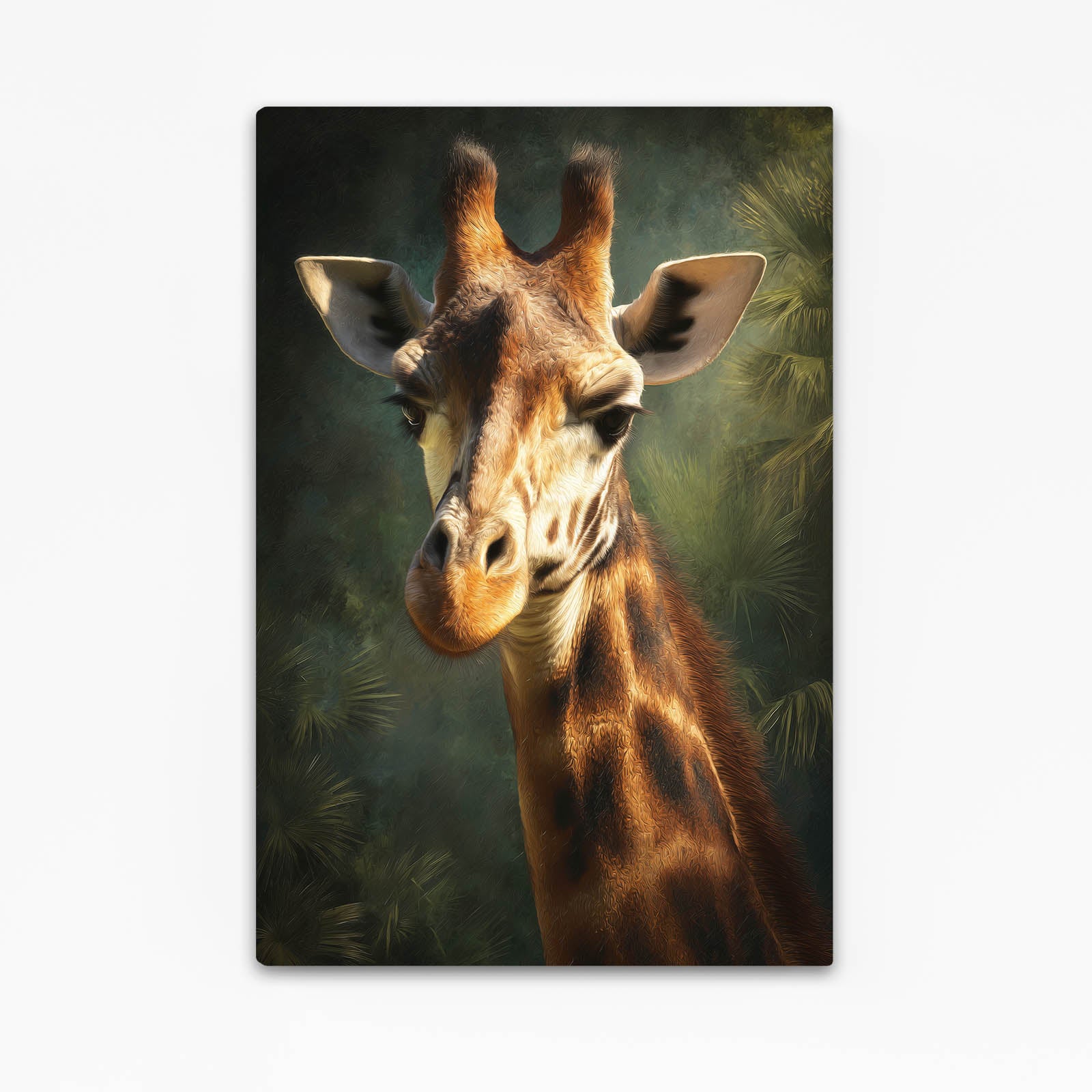 With the majestic presence of a giraffe emerging from lush forest greens, this artwork instantly draws the eye and fills your space with serenity and inspiration. Every look at this piece becomes a reminder of confidence and gentle power.