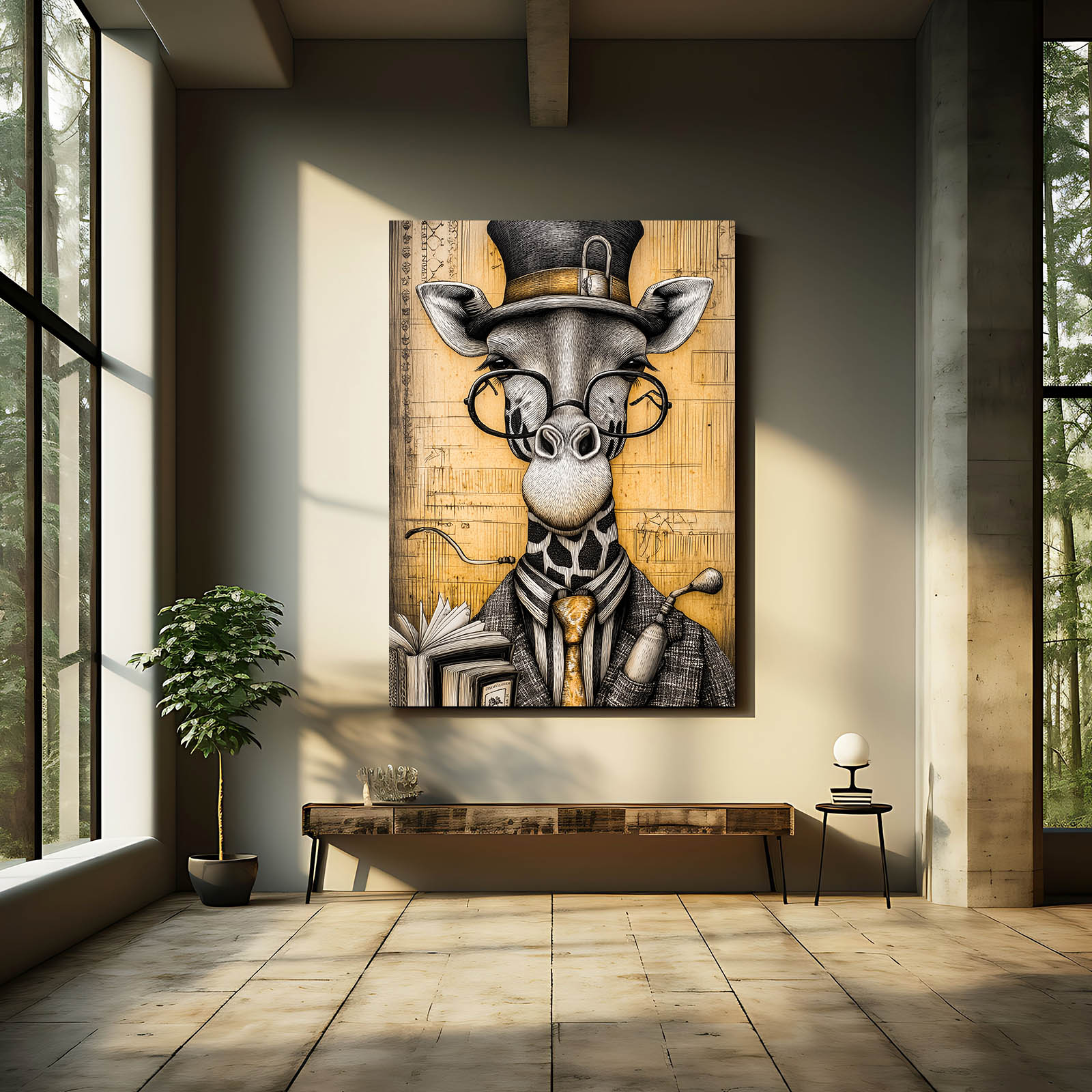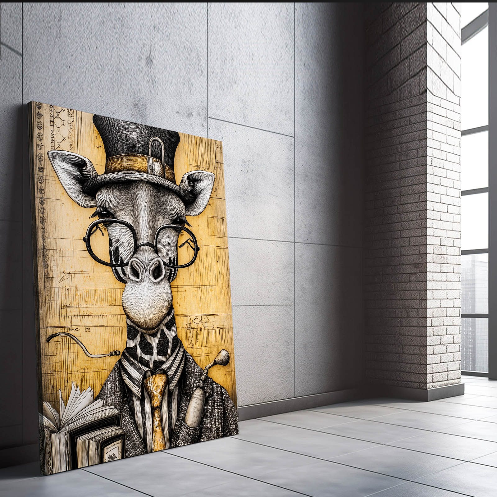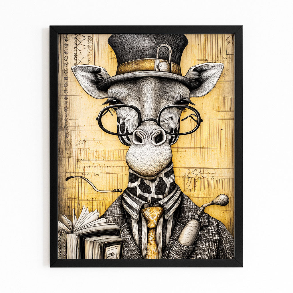 The Giraffe Print Cool is a masterpiece of charm, humor, and individuality. Featuring a giraffe dressed in classic sophistication with a top hat, glasses, and a book in hand, this artwork adds a playful yet refined touch to your decor.