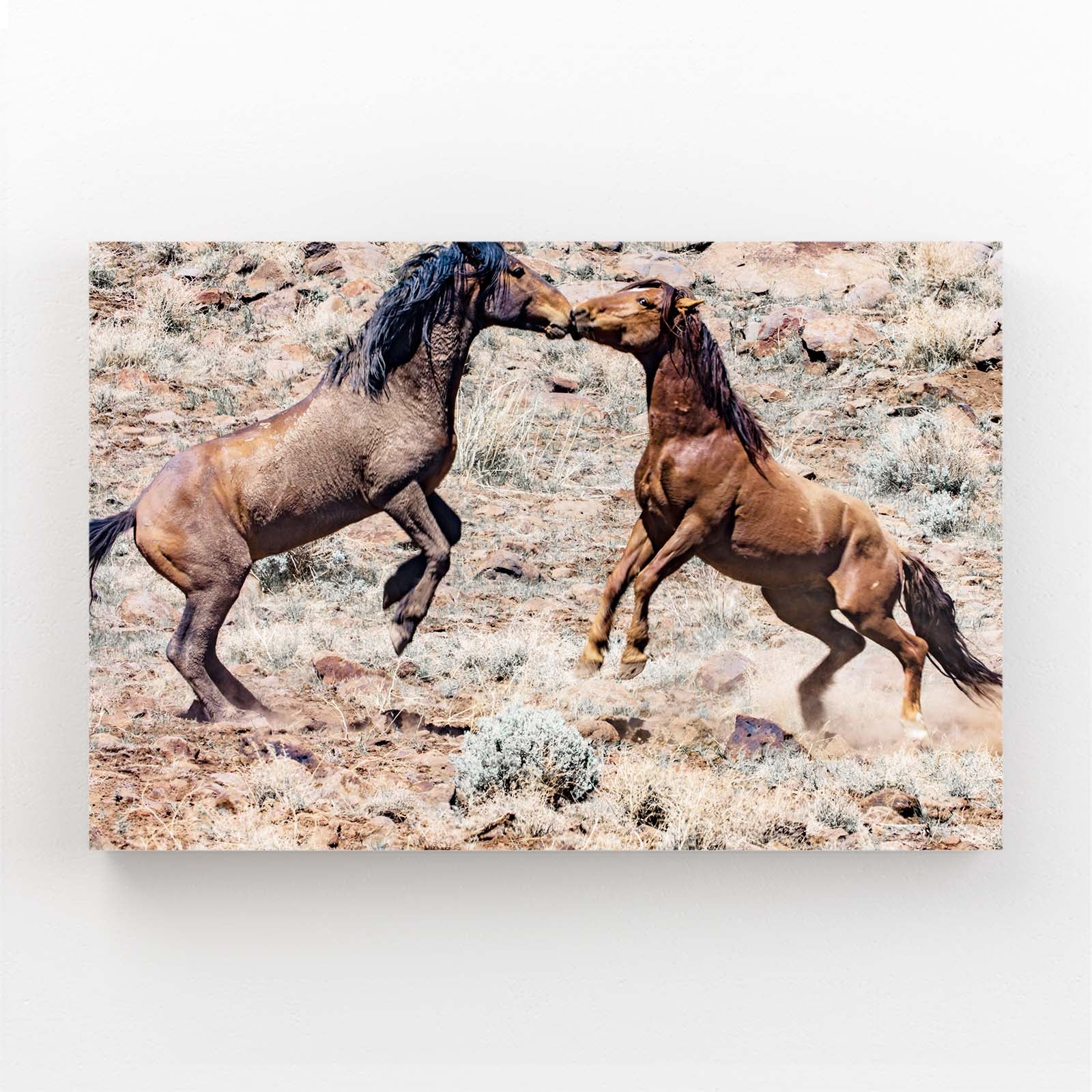 Horse Art Kissing captures the raw beauty of nature with a powerful depiction of two wild horses in motion. Their intense connection as they meet in the wild, embodies strength and passion, making this piece the perfect focal point for any room.