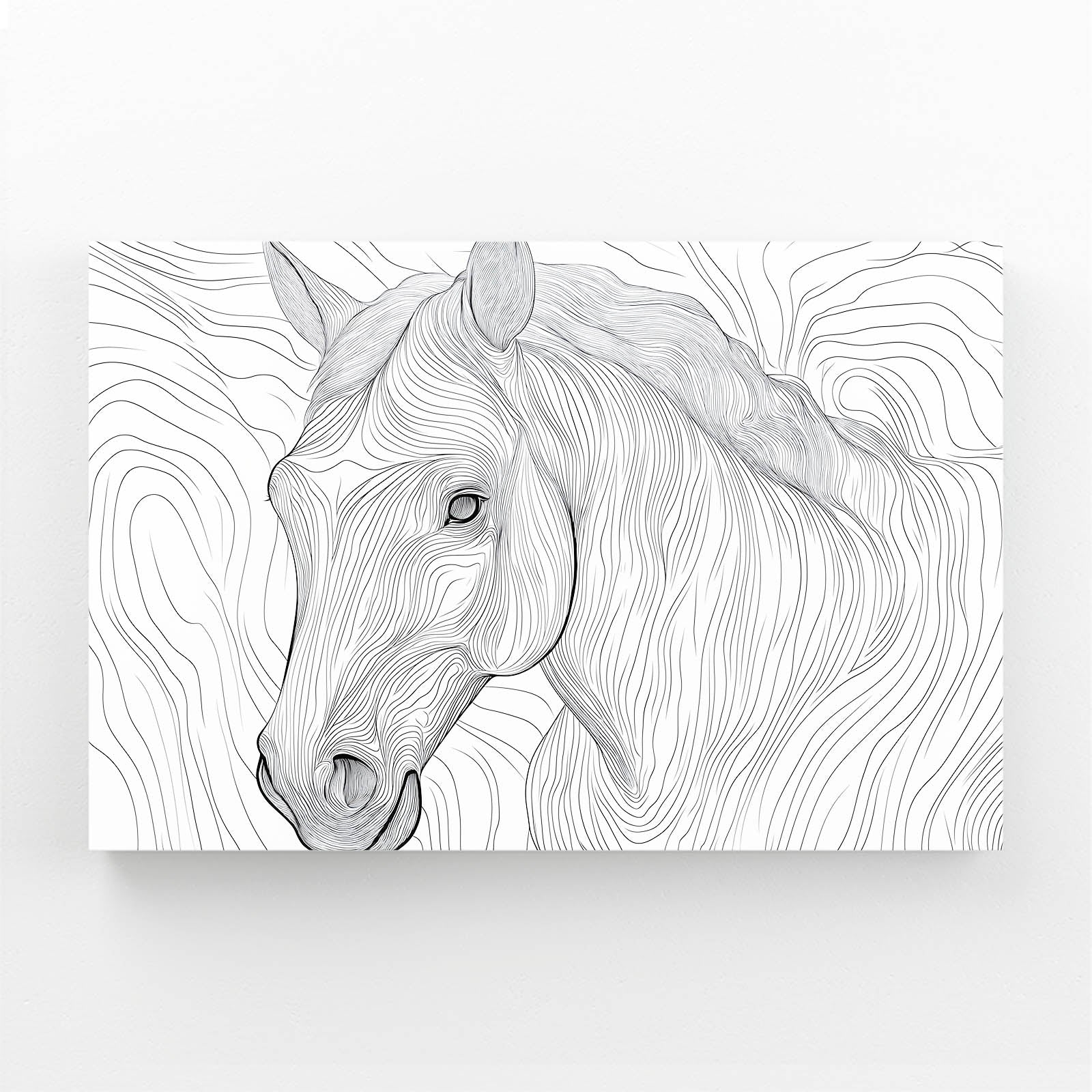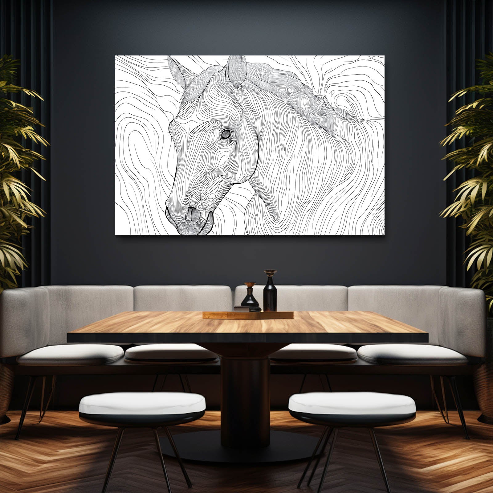The subtle contrast of the white background and bold lines brings out the fluidity of the horse's shape, capturing a sense of motion and elegance. This artwork is perfect for anyone who appreciates the harmony of art and nature, creating a calming yet powerful presence in any room.