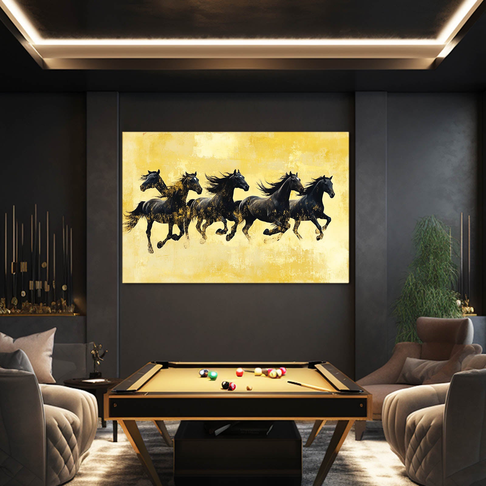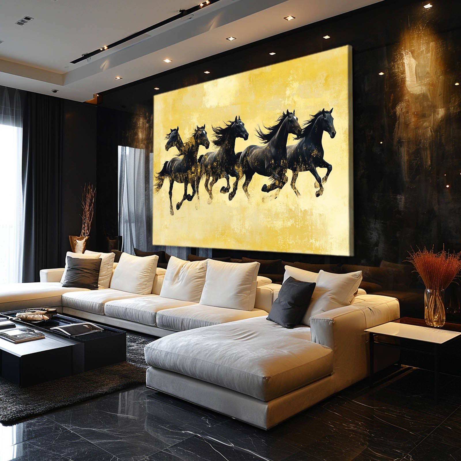Living Room Horse Art brings an essence of freedom and energy to your living space. The dynamic horses in motion against a vibrant yellow backdrop evoke a sense of power and elegance, capturing the strength and grace of these magnificent creatures. This artwork is designed to add life and sophistication to any room.