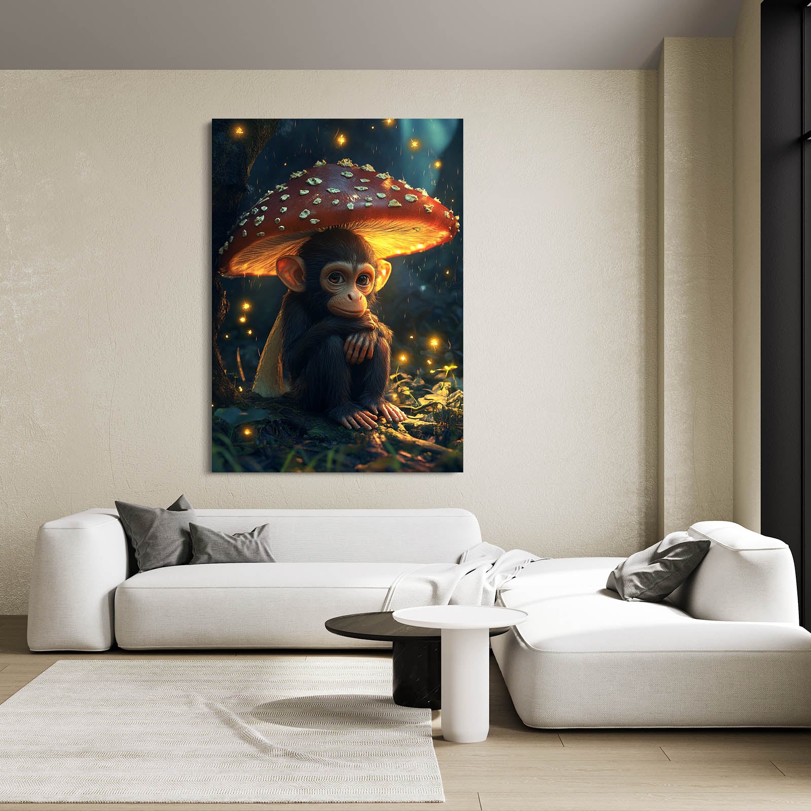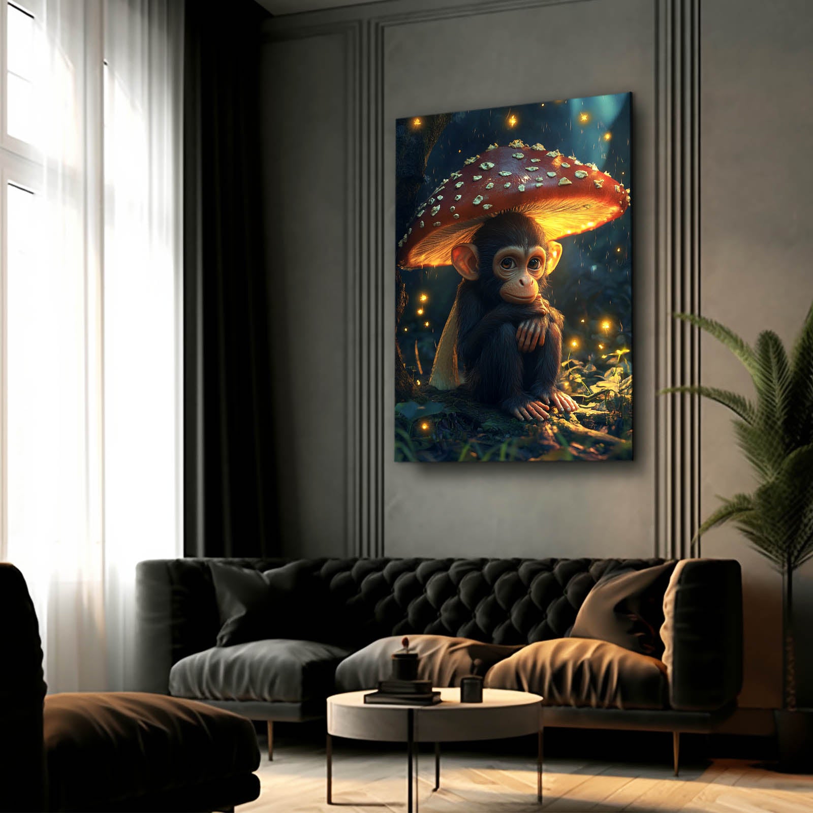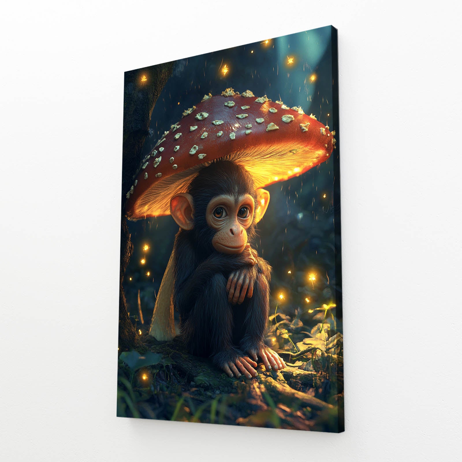 Immerse yourself in a hypnotic forest scene that beckons your attention from every angle. Notice the mesmerizing presence of Mushroom Monkey Art accompanied by glowing mushrooms to transport you into a dreamy moment.