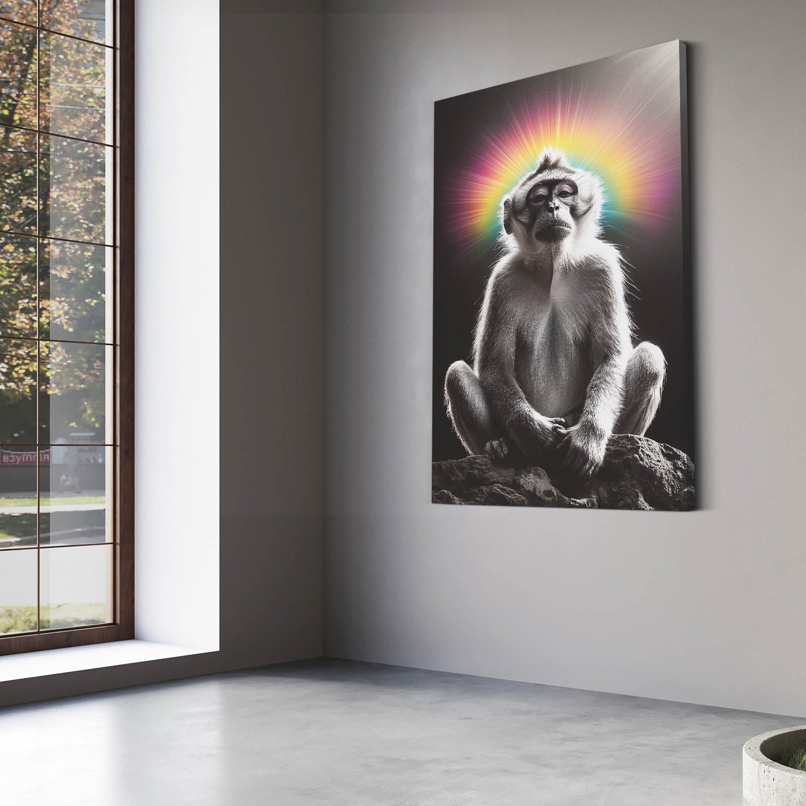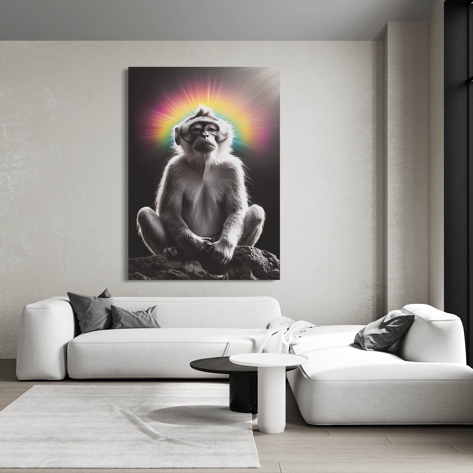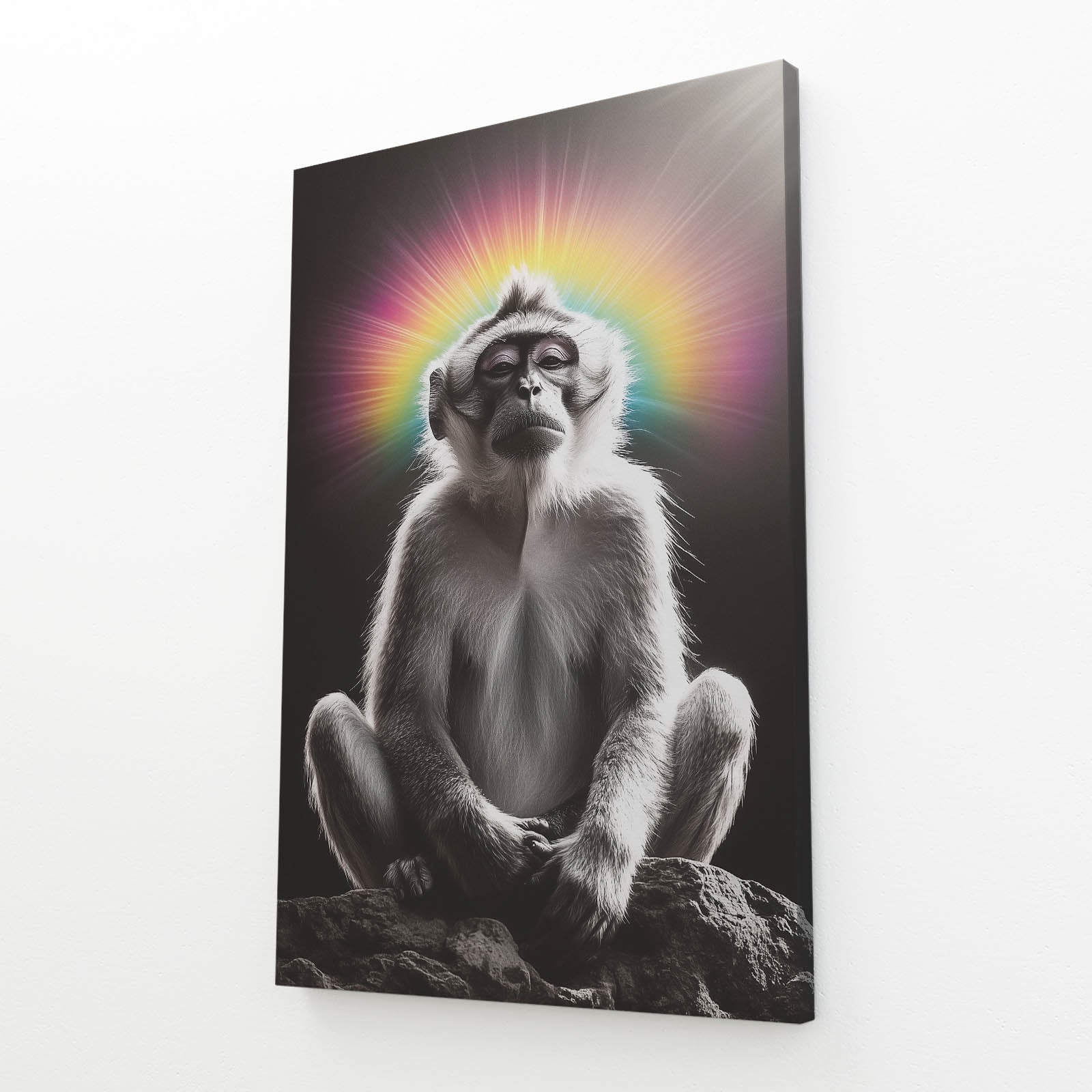 Immerse yourself in the luminous presence of Rainbow Monkey Canvas, unveiling a radiant halo that highlights its serene poise. Observe the tranquil energy emanating from the harmonious aura, inviting you to embrace a mindful ambiance that elevates any setting 🌀.