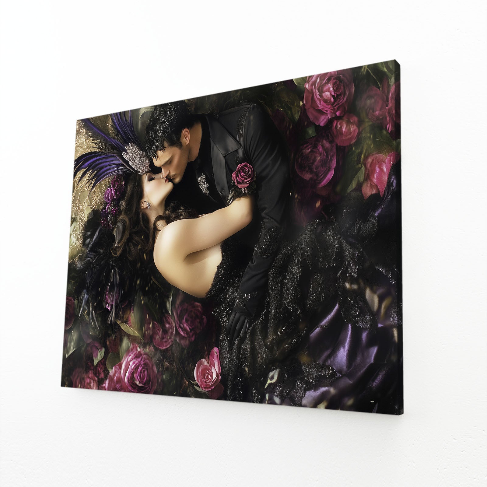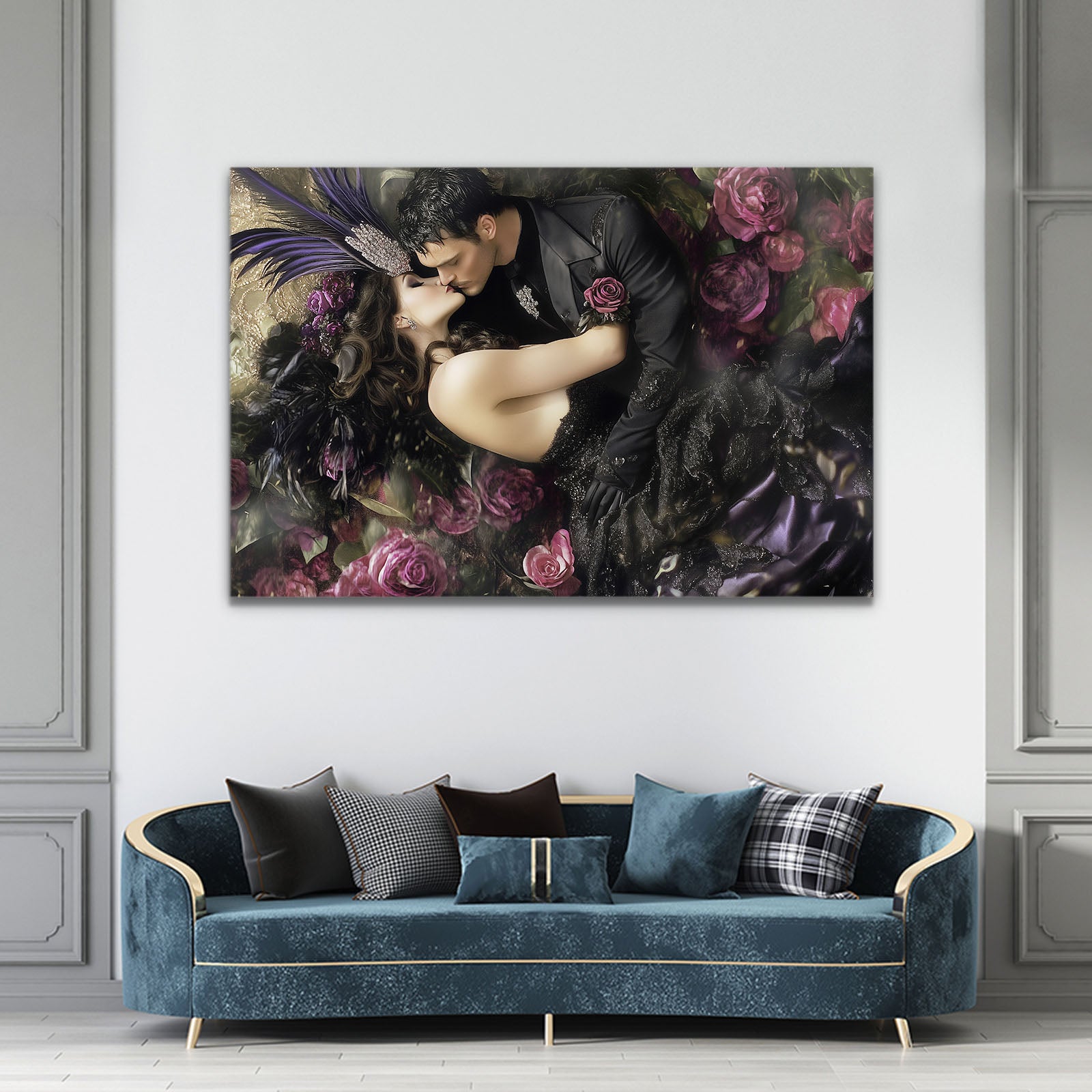 Unveil passion and drama through the Horizontal Erotic Artwork, a lavish expression of sensuality and mystery. This romantic composition captures a deep, emotional connection between two lovers surrounded by a sea of velvety roses and intricate details.