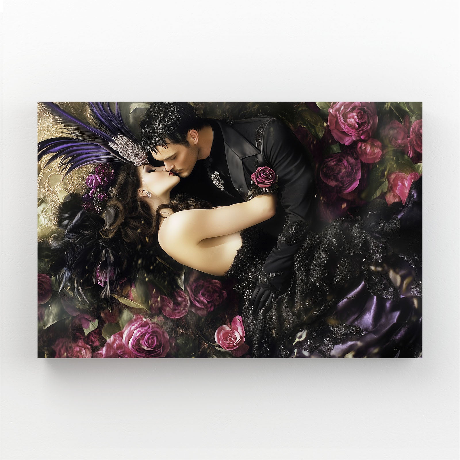 The couple’s embrace is wrapped in luxurious textures and vibrant colors, igniting feelings of desire and imagination. Her dramatic black dress and feathered headdress, paired with his refined attire, create an aura of timeless fantasy and regal passion.