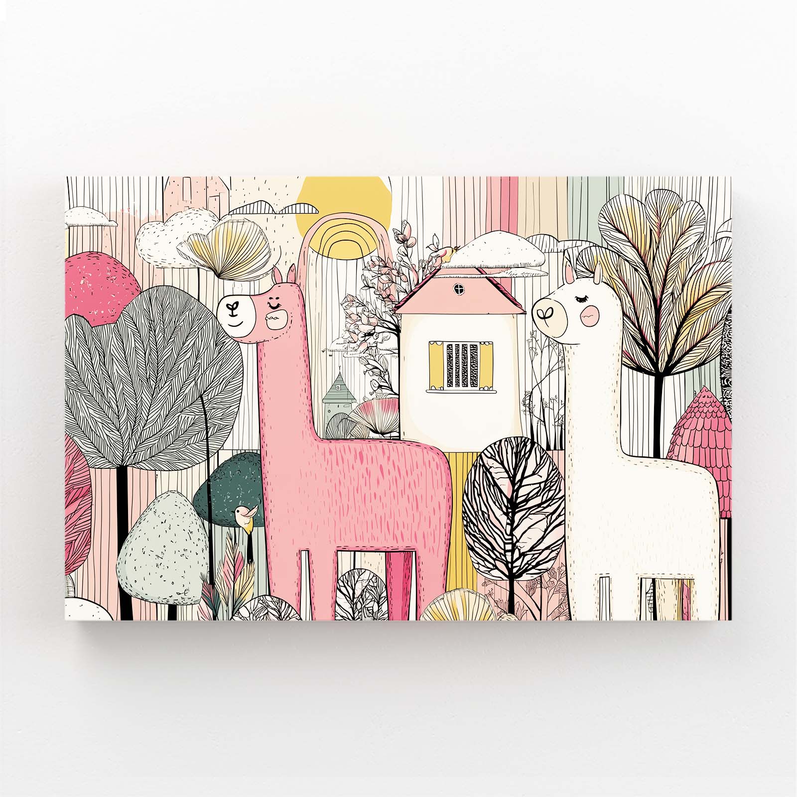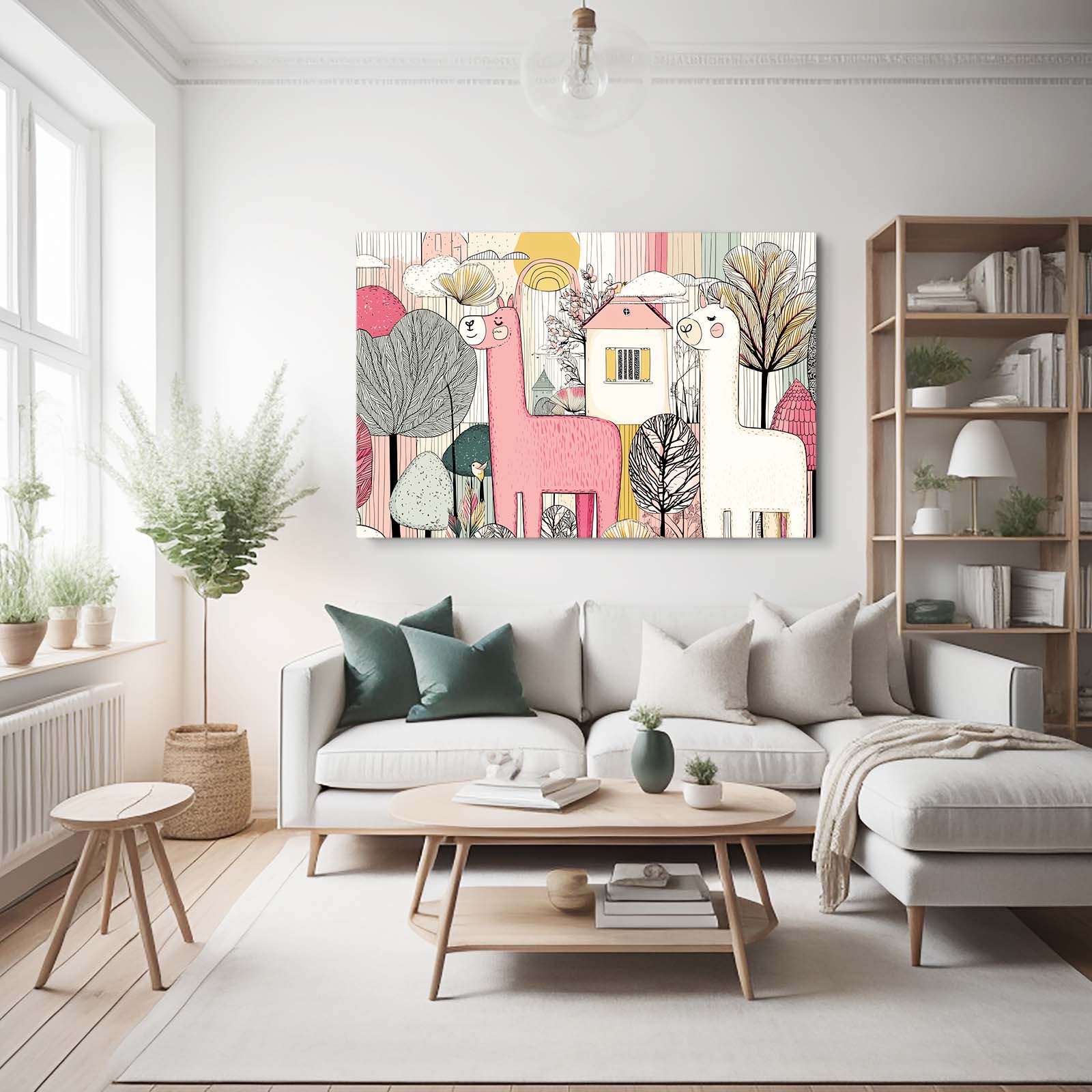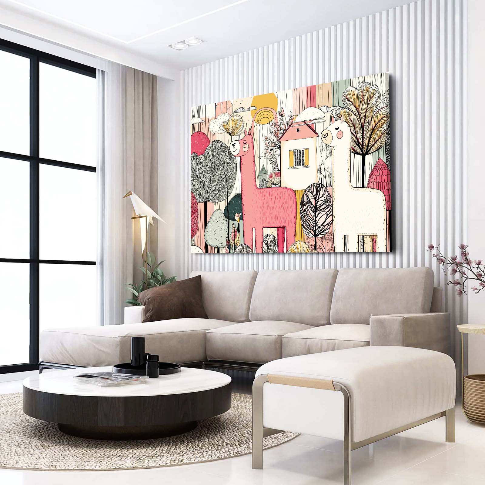 Bring the charm of the countryside into your bathroom with our Bathroom Farmhouse Wall Decor. This delightful piece combines playful illustrations with soft, pastel tones, creating a welcoming atmosphere in any space. Featuring adorable llamas surrounded by whimsical trees, a cozy house, and a touch of nature, it's the perfect way to introduce a refreshing and unique vibe into your home.