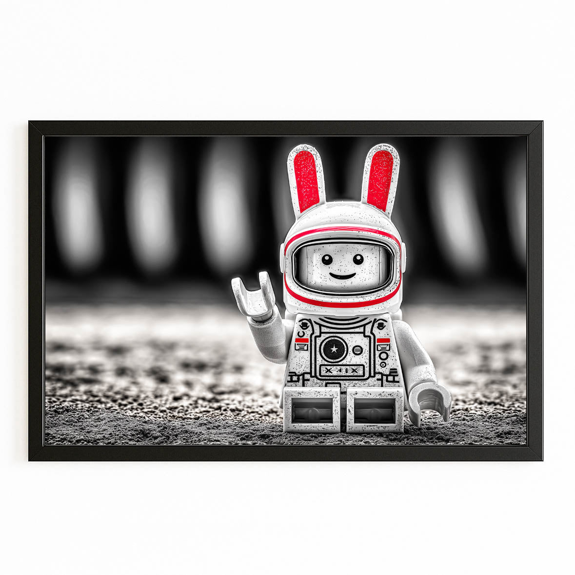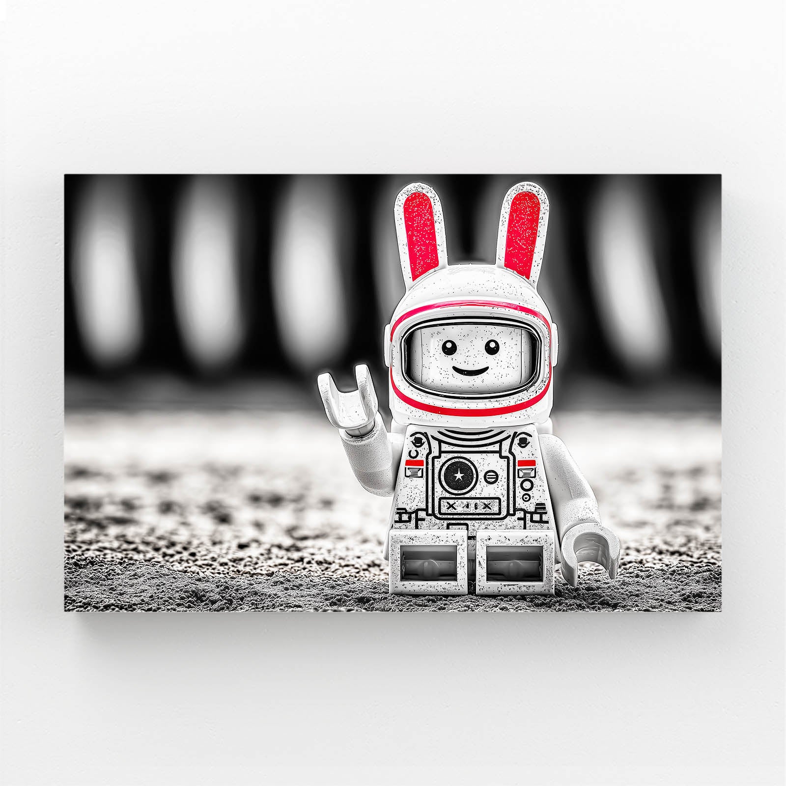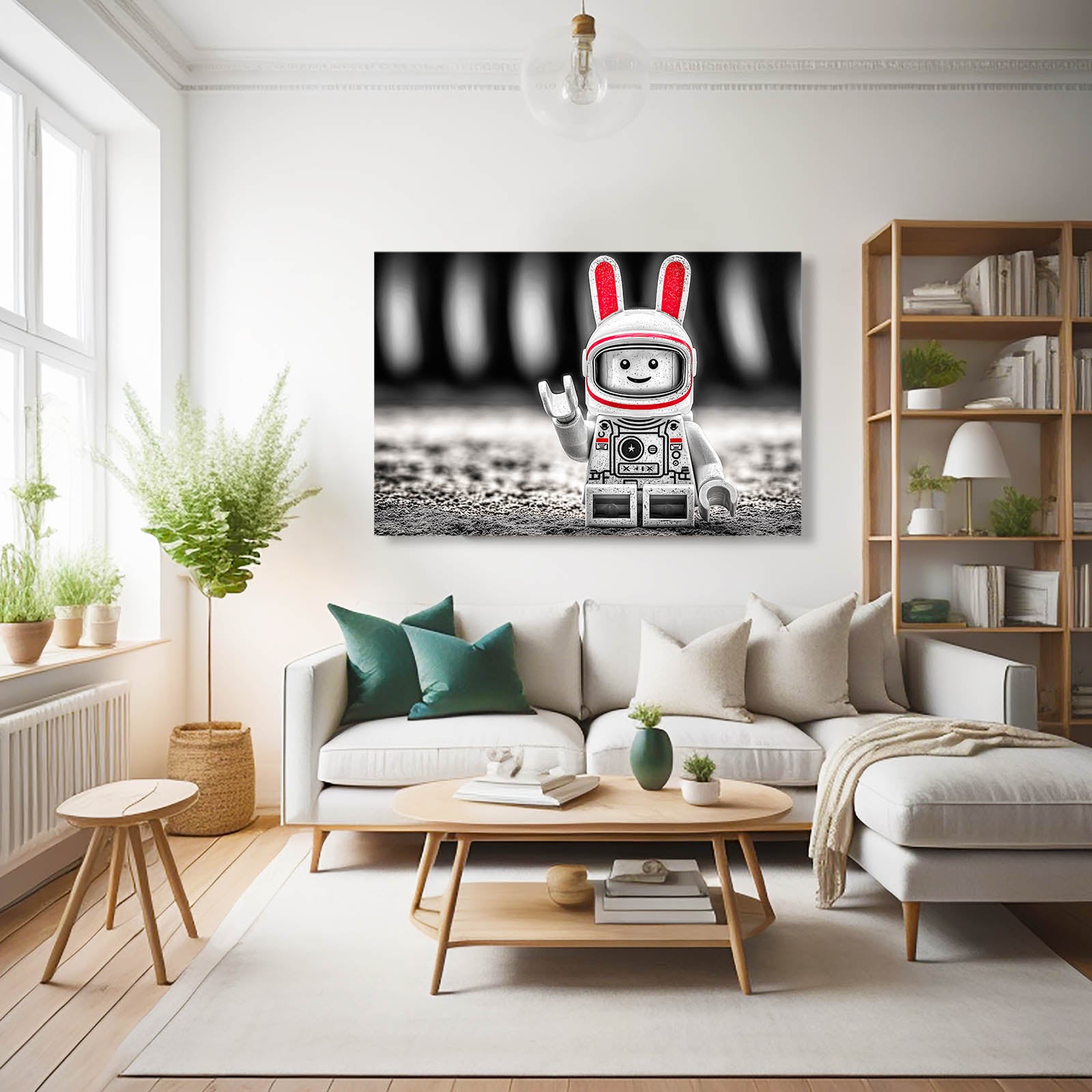 The soft grayscale background enhances the bunny figure, making it stand out with captivating clarity. Its futuristic suit brings a touch of imaginative adventure, perfect for rooms where little ones dream, explore, and grow.