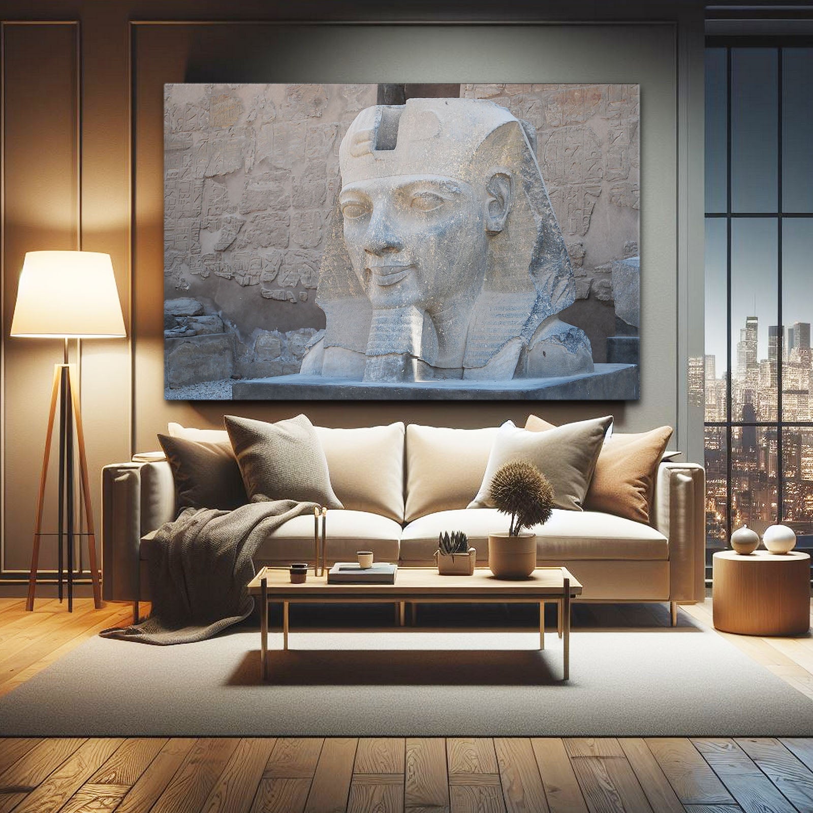 The Sphinx stands as a guardian of ancient knowledge, with its calm and wise expression invoking a sense of reverence for Egypt’s rich history. The light and shadows play across the stone, giving it an almost ethereal quality that brings the ancient world to life in your home.