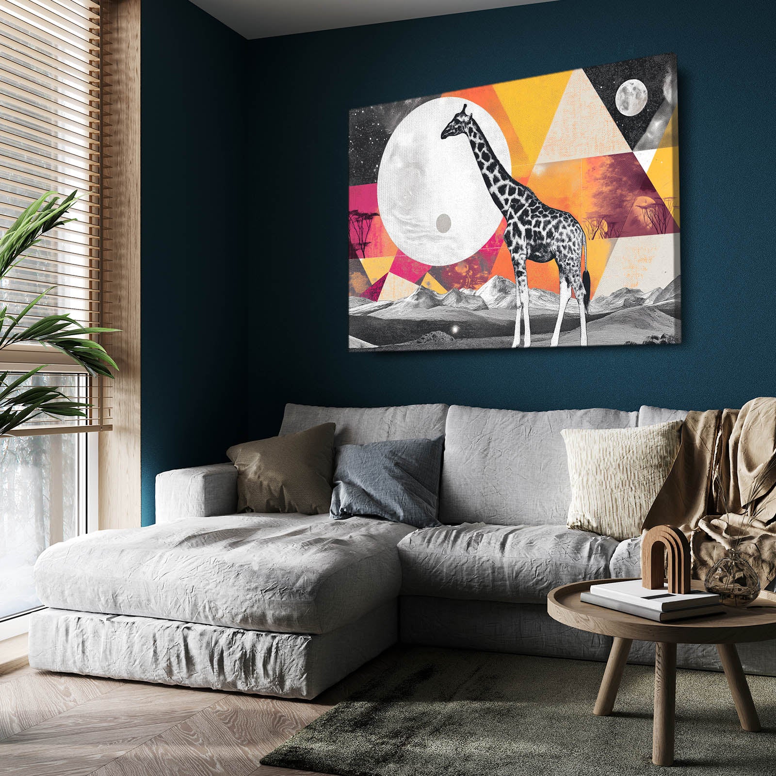 The monochrome elegance of the giraffe meets vibrant tones of yellow, orange, and pink, creating a design that feels both contemporary and timeless. Each detail adds depth, inviting you to see something new every time you look at it.