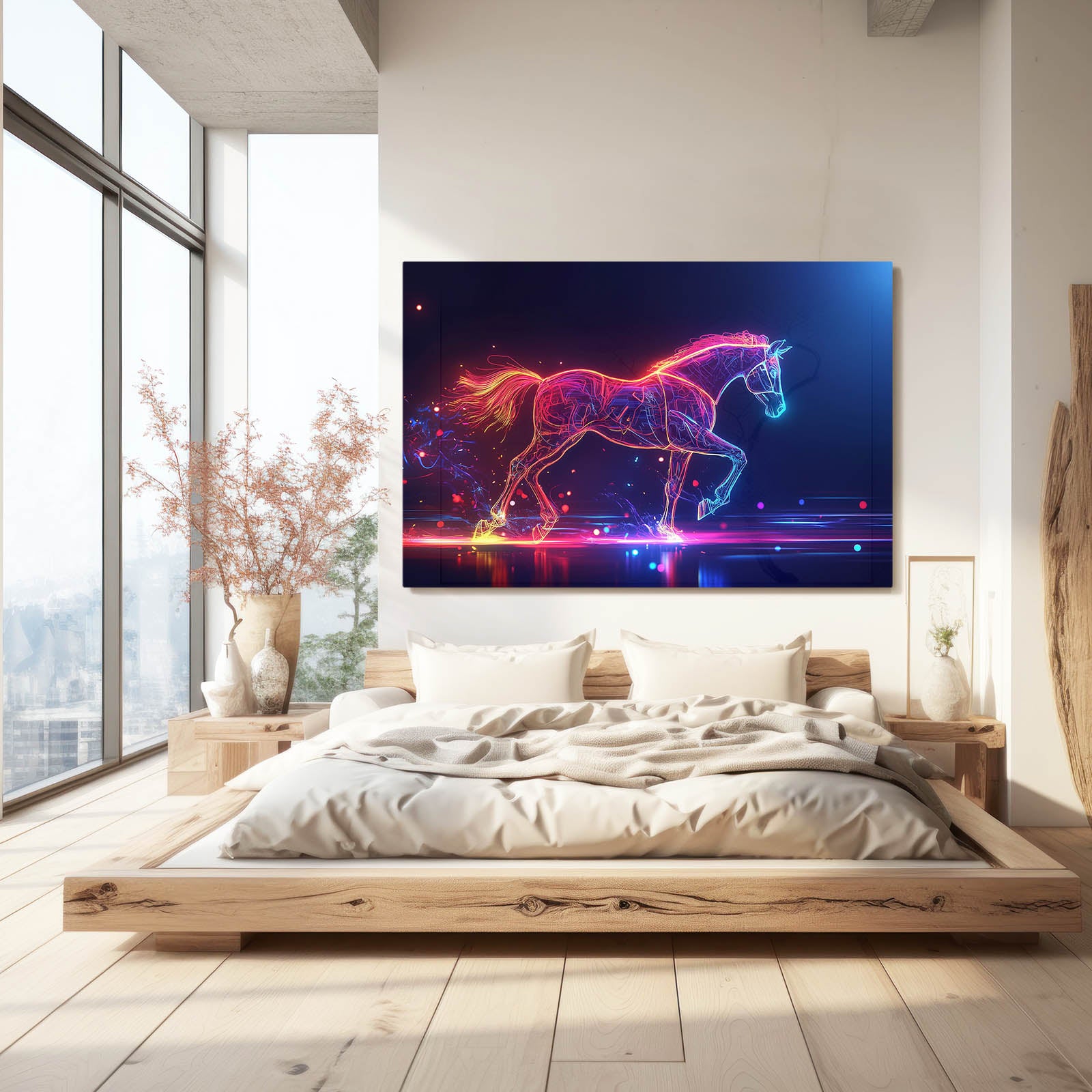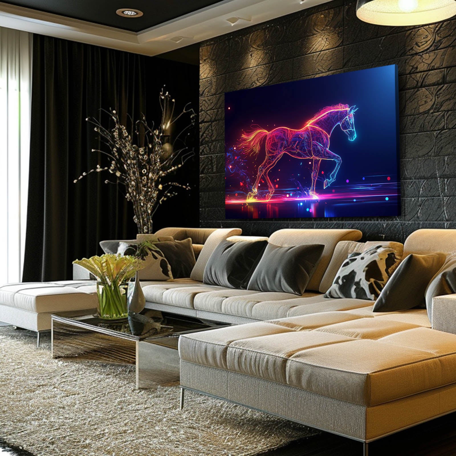 Bring electrifying energy to your space with the Glowing Horse Artwork. This captivating piece captures the power and grace of a horse, depicted in a stunning neon outline that radiates vibrant colors. Ideal for transforming any living room, office, or studio, this artwork exudes strength and vitality, evoking a sense of freedom and movement.