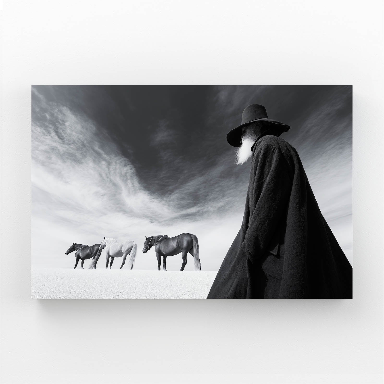 The balance of light and shadow evokes a powerful emotional response, while the monochromatic tones lend it a sense of depth and sophistication. Each detail — from the movement of the horses to the commanding figure observing them — tells a story of freedom, balance, and purpose.