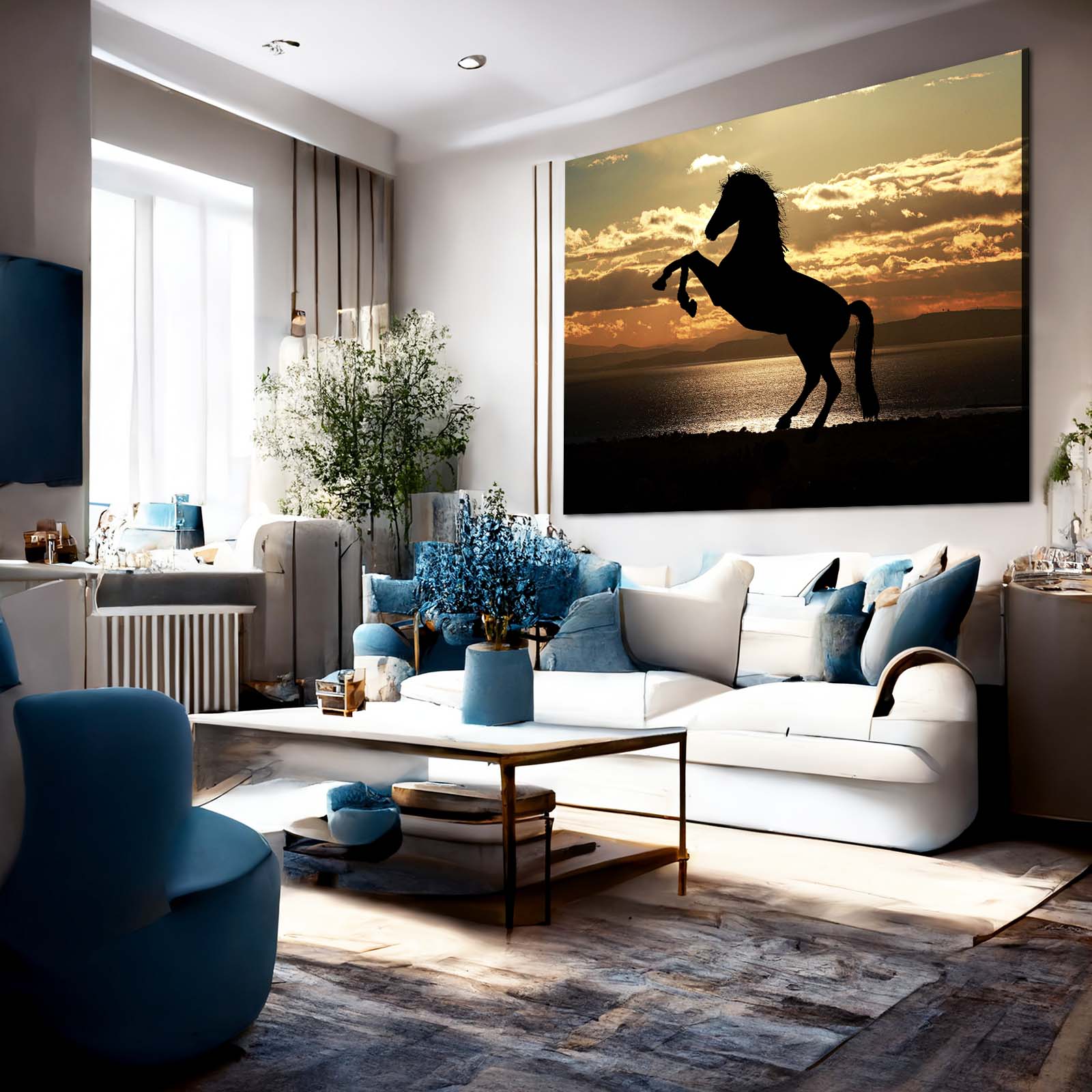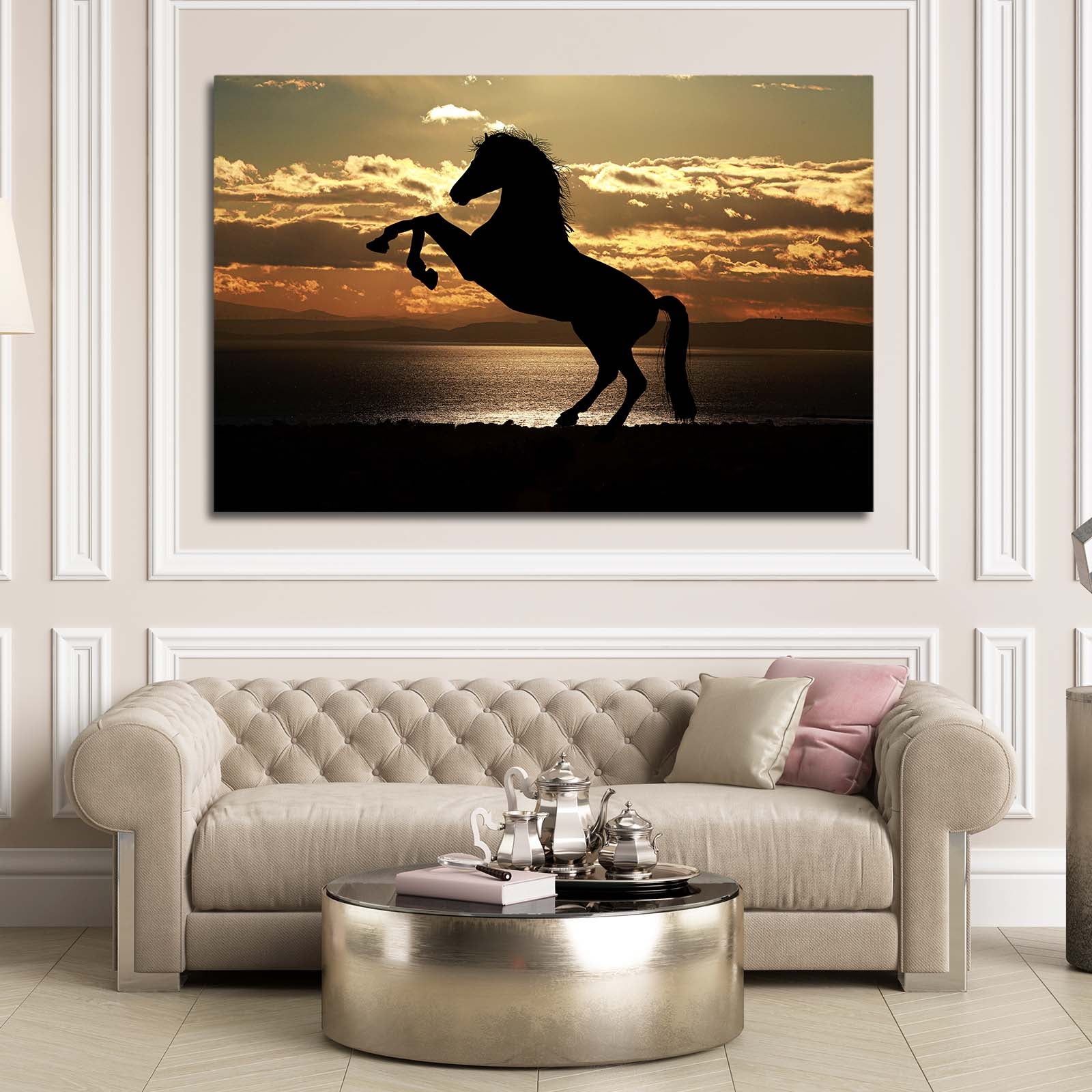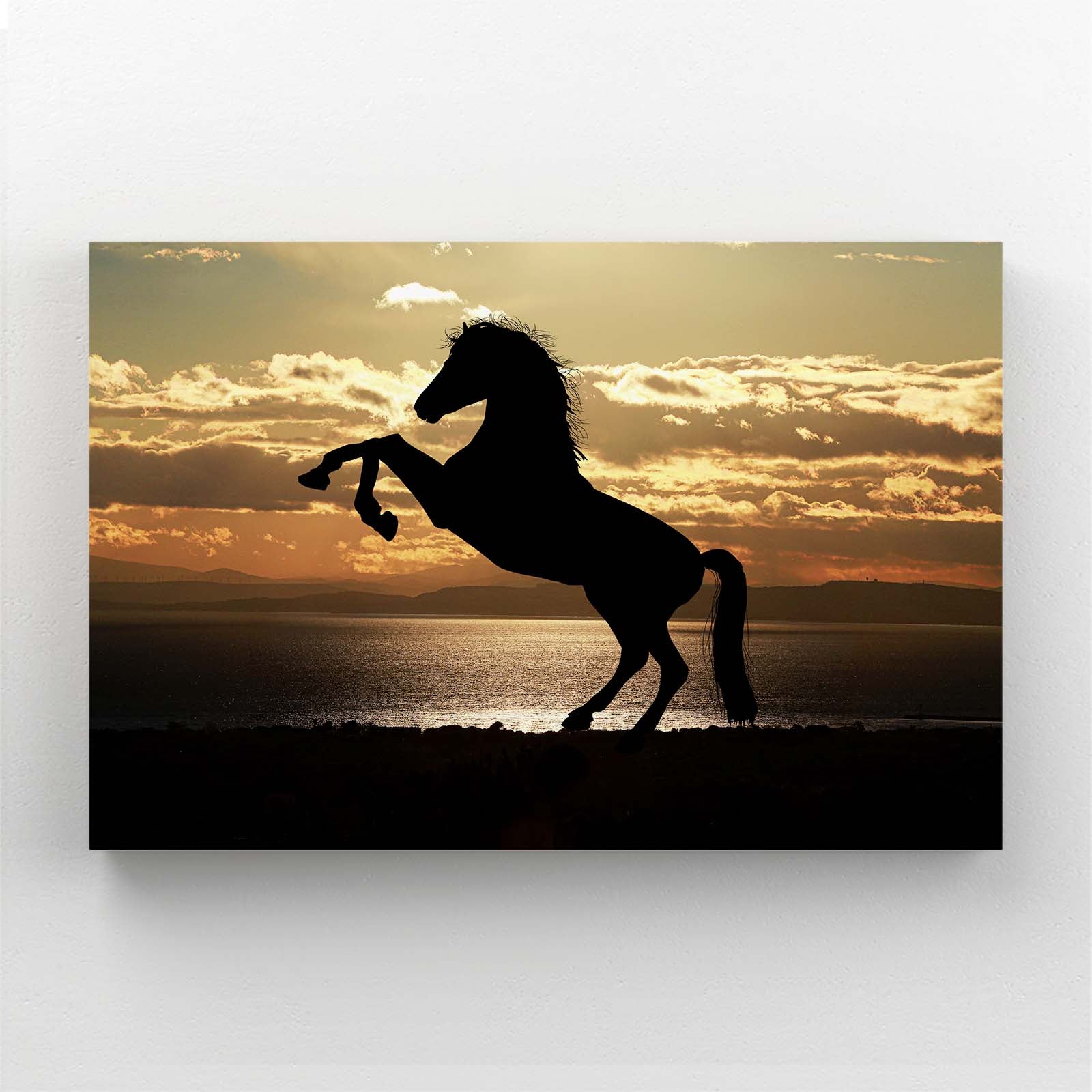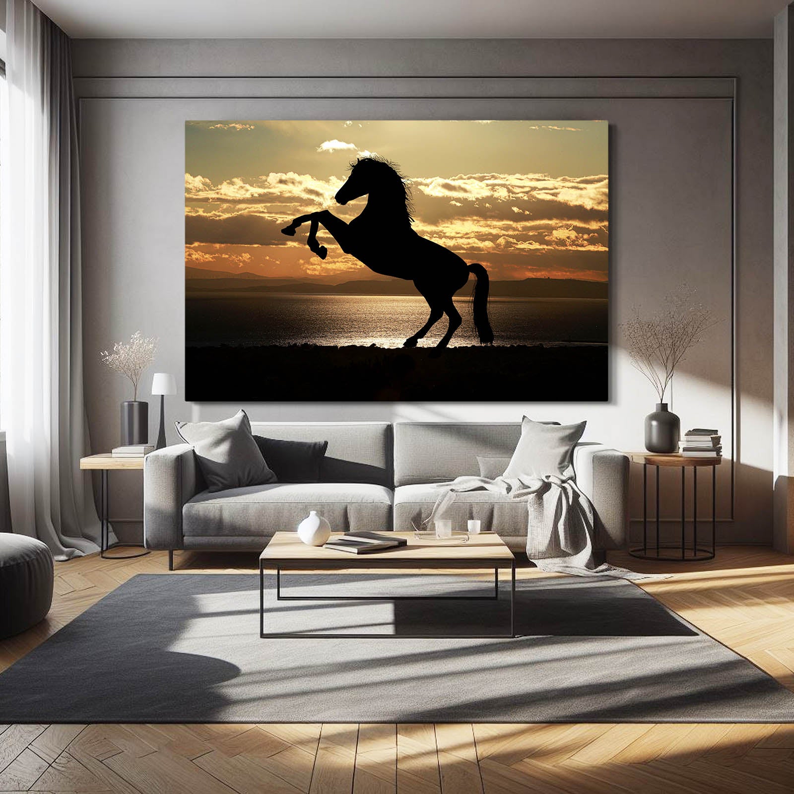 The bold contrast between the black horse and the glowing sky makes it a perfect addition to modern, minimalistic, or nature-inspired home decor. Ideal for your living room or office, this piece serves as both a conversation starter and a statement of elegance and grace.