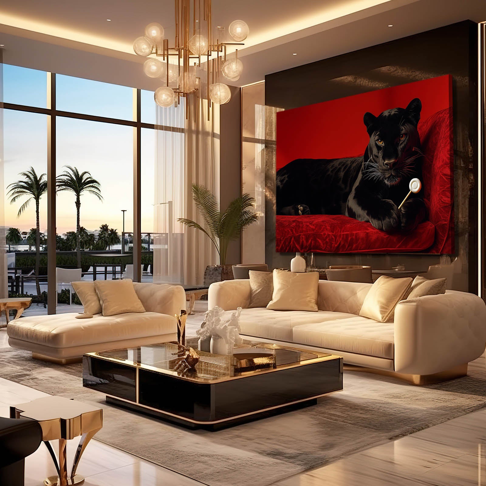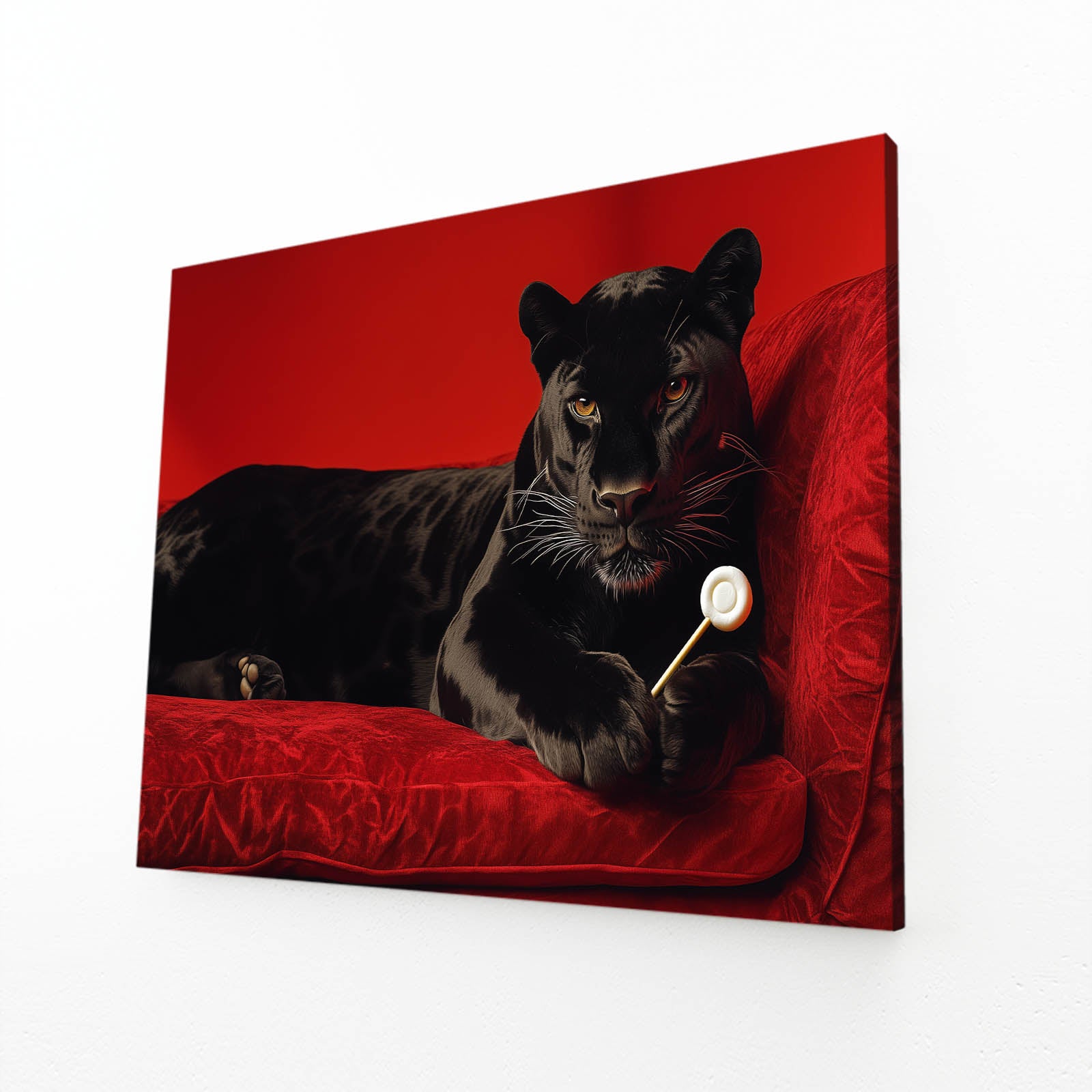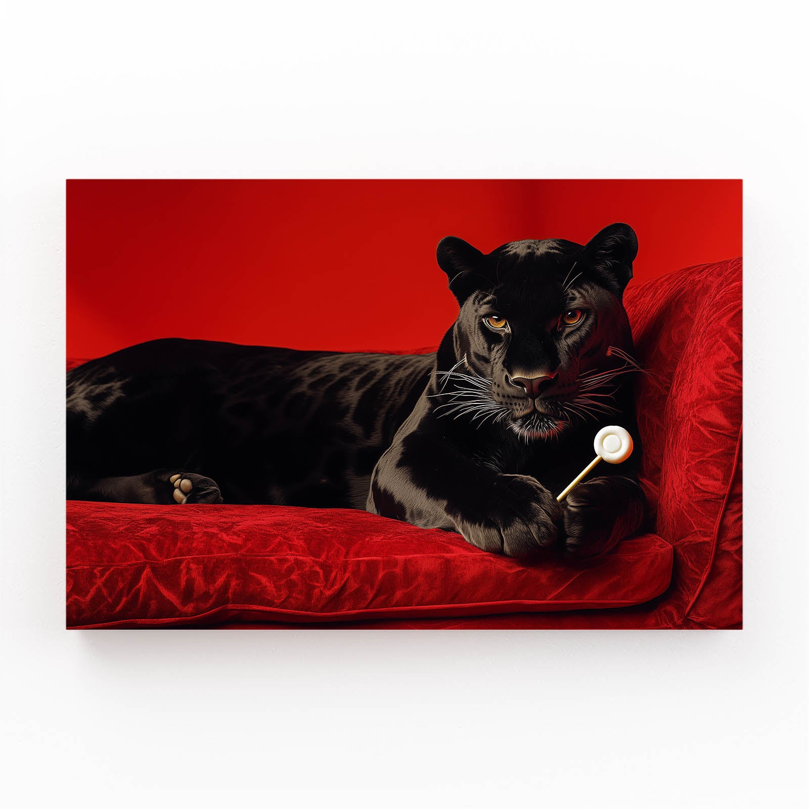 The Leopard Wall Art Black effortlessly blends the beauty of the wild with a striking sense of elegance. Featuring a powerful black leopard resting on a plush red velvet sofa, this artwork embodies strength, luxury, and style. The intense gaze of the leopard and the vibrant red background create a captivating focal point that commands attention in any space.