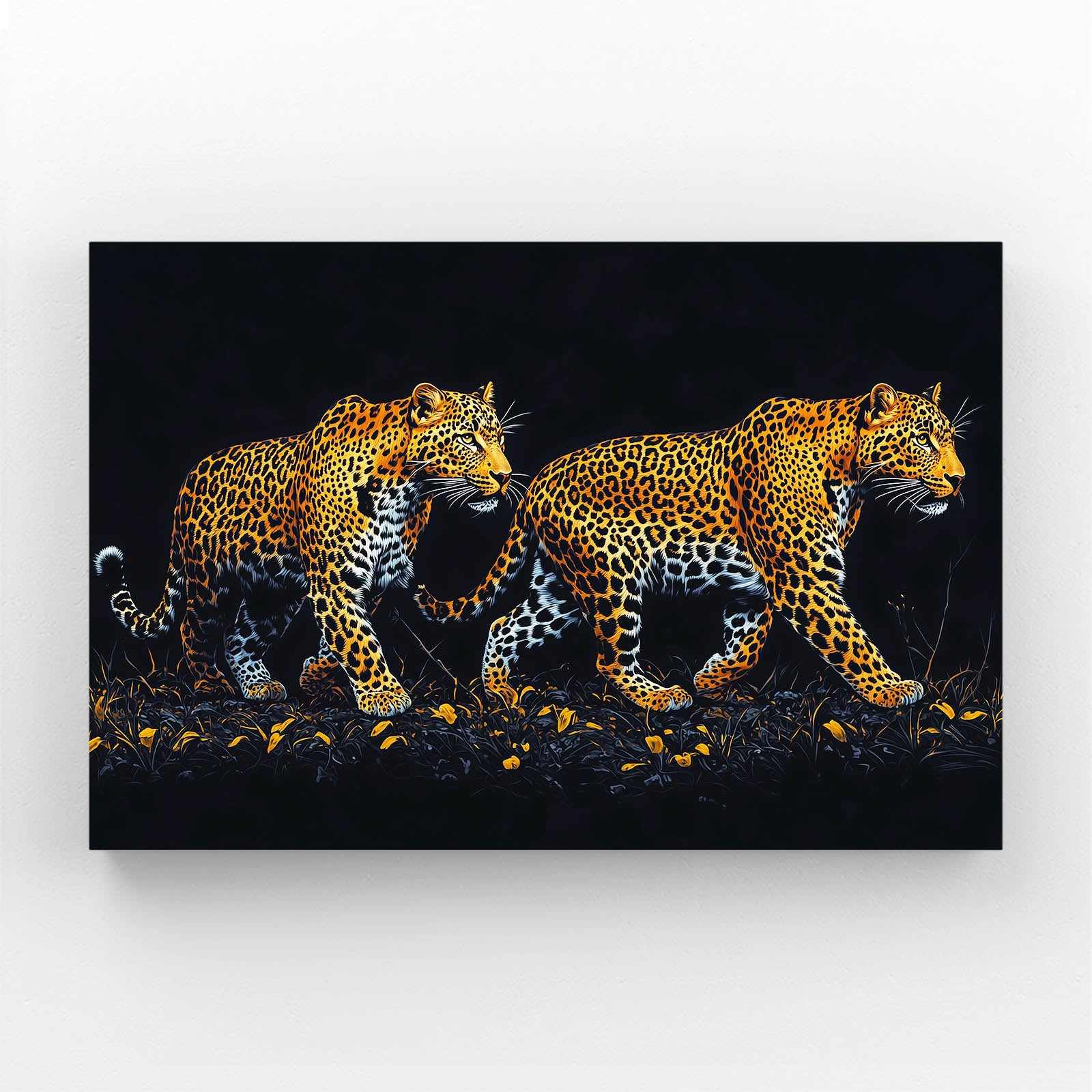 The Leopards Wall Art showcases the incredible elegance and strength of two majestic leopards in a beautifully crafted design. Set against a dark backdrop with vibrant yellow flowers, this artwork captures the intensity and grace of these wild creatures as they stride confidently through nature. The captivating gaze of each leopard and the striking contrast of colors make this a must-have piece for any home.