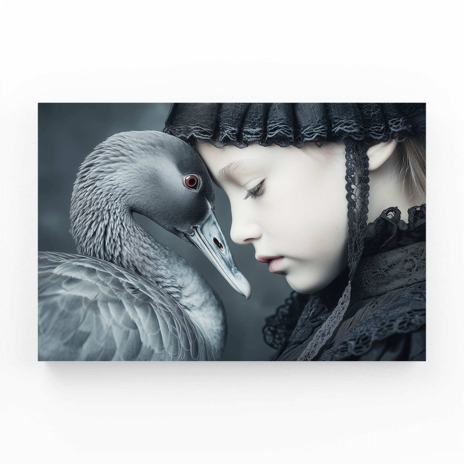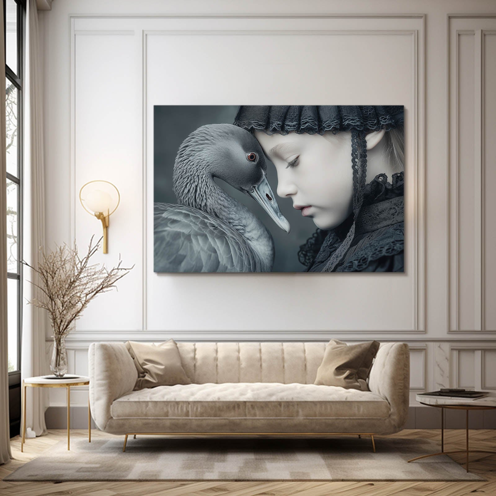 The soft light and elegant textures bring a sense of purity and serenity, while the tender pose between the girl and the bird evokes trust, peace, and silent understanding. Every detail, from the lace dress to the soft feathers, reflects timeless artistry and emotional depth.