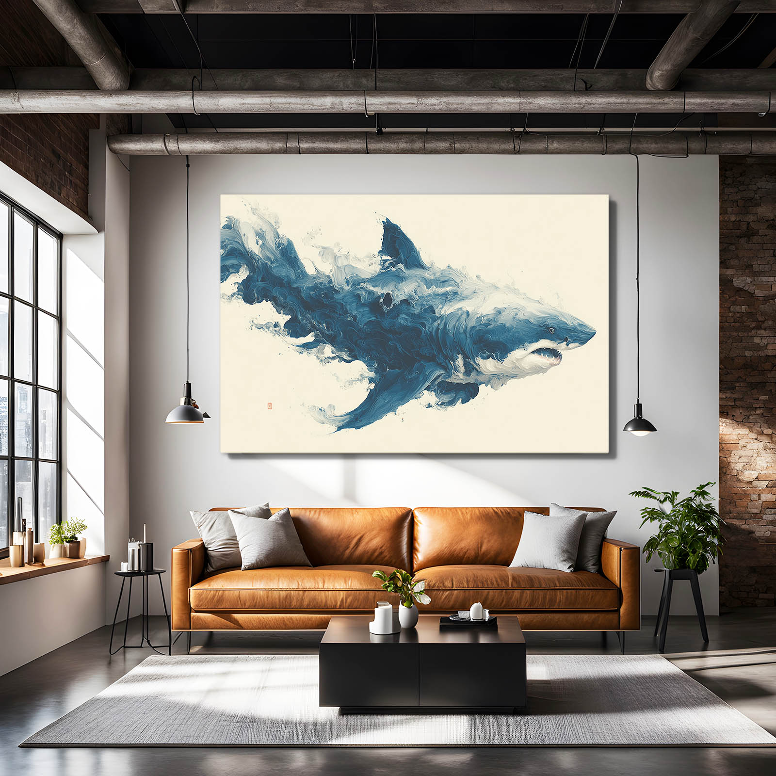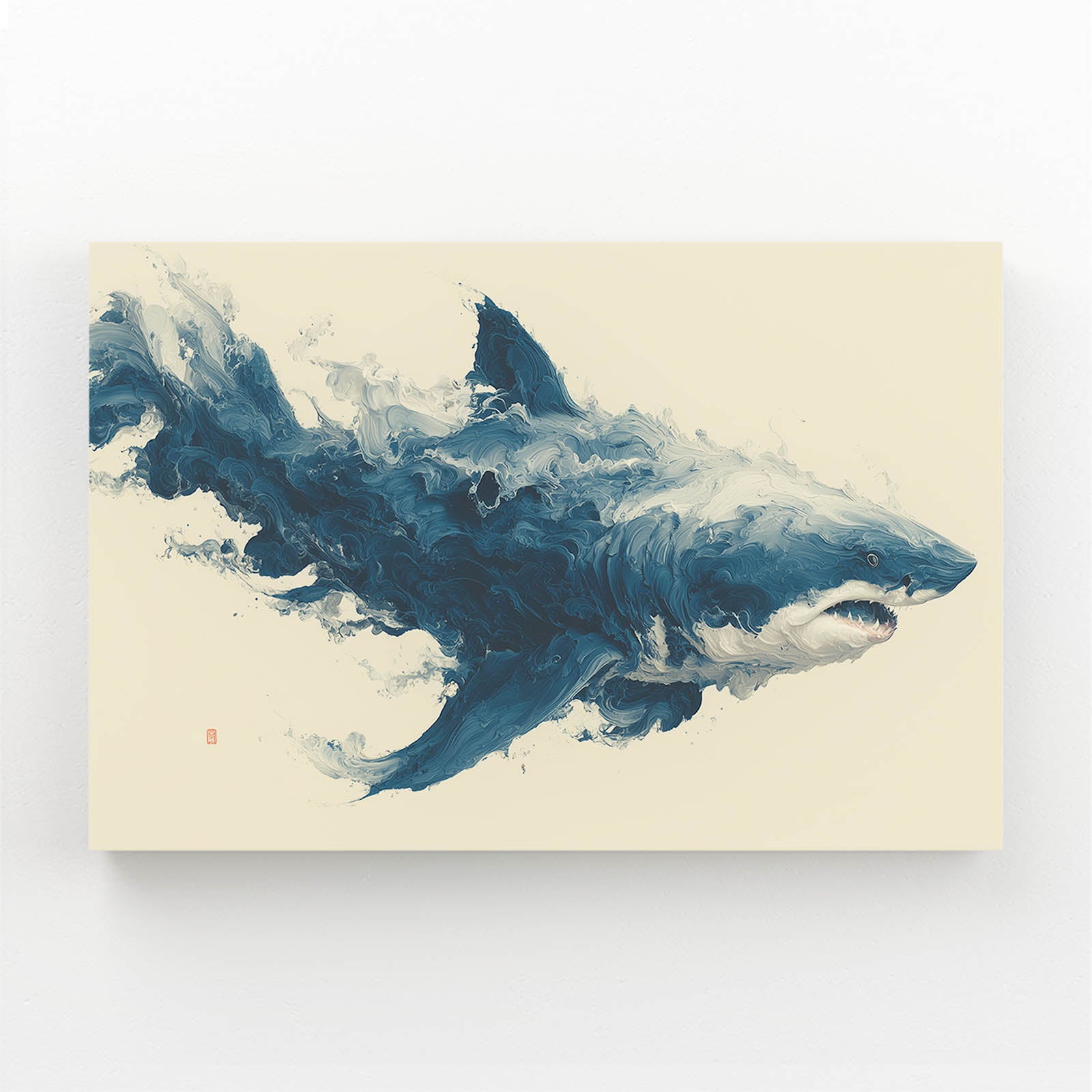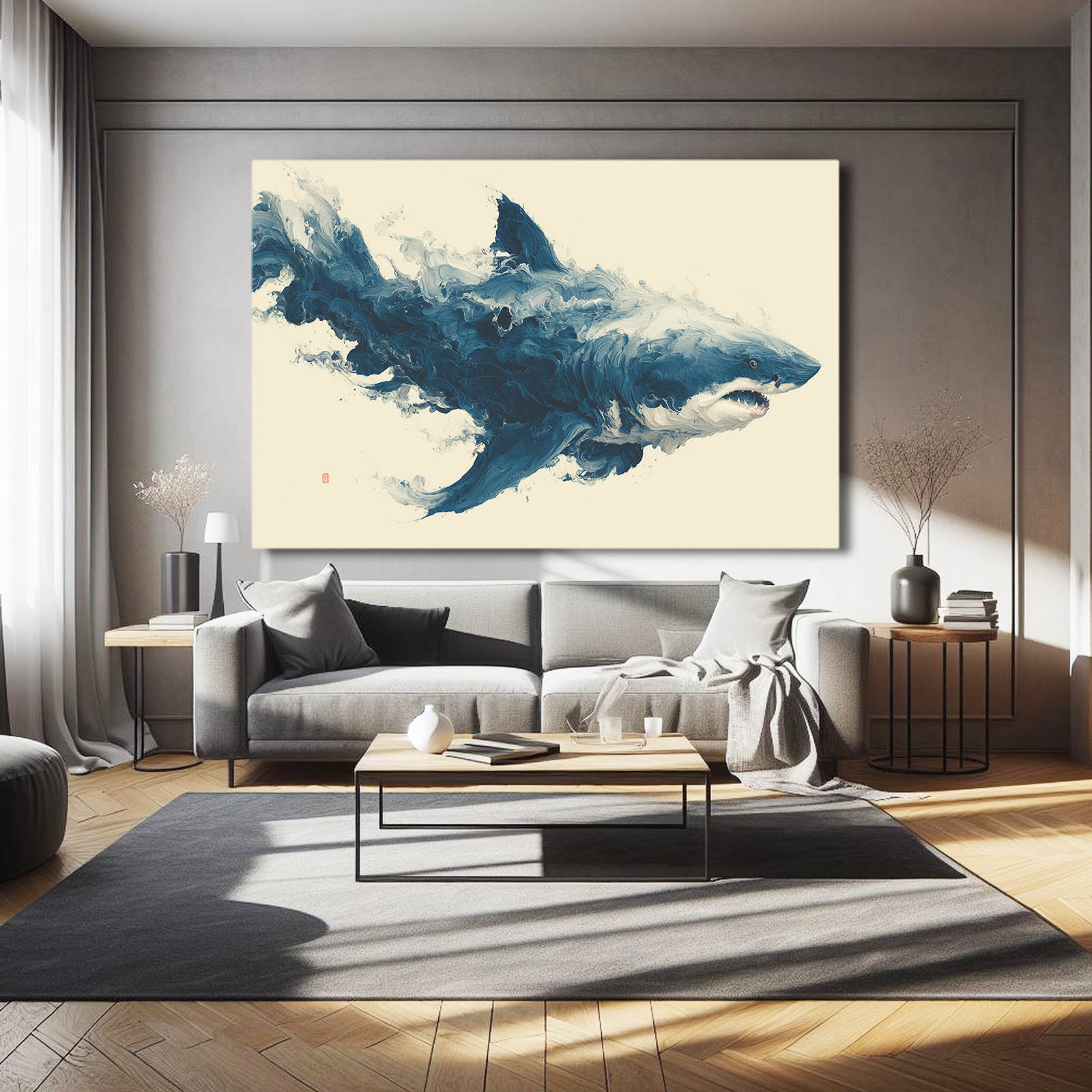 This composition immediately immerses the viewer in a sense of motion, strength, and balance, creating an emotional connection at first glance. The Abstract Shark Wall Art emerges through sweeping forms that feel alive and intentional, guiding the eye naturally across the space. Its presence is bold yet refined, making the atmosphere feel confident and elevated. The visual flow invites curiosity and sustained attention.