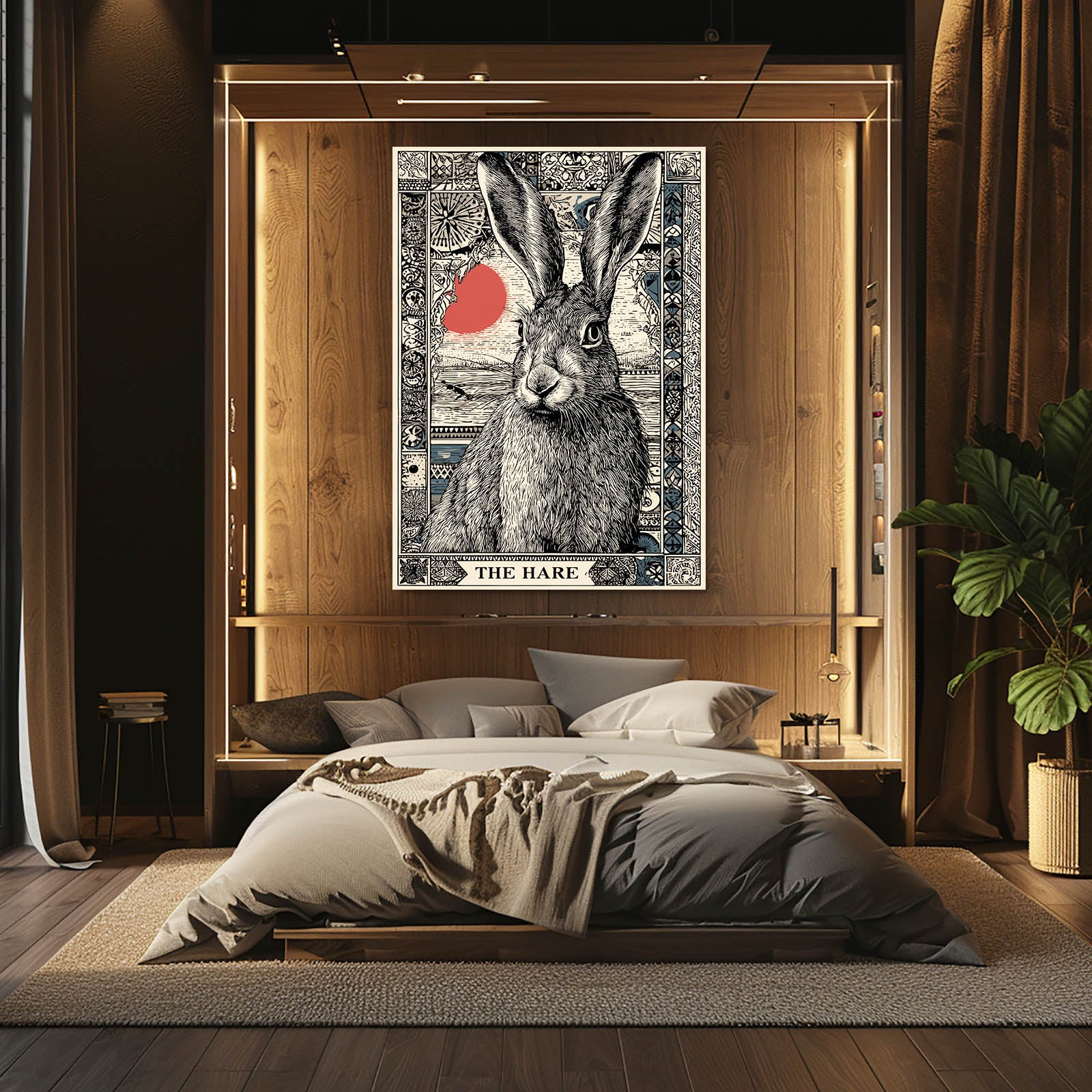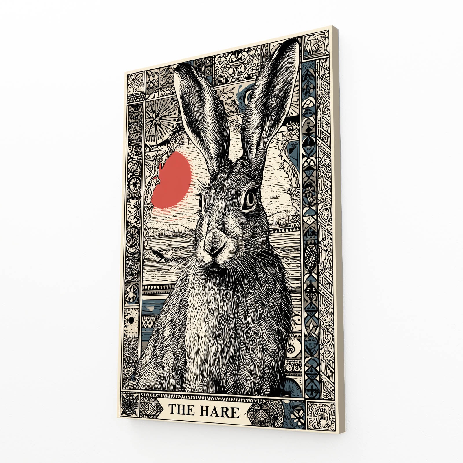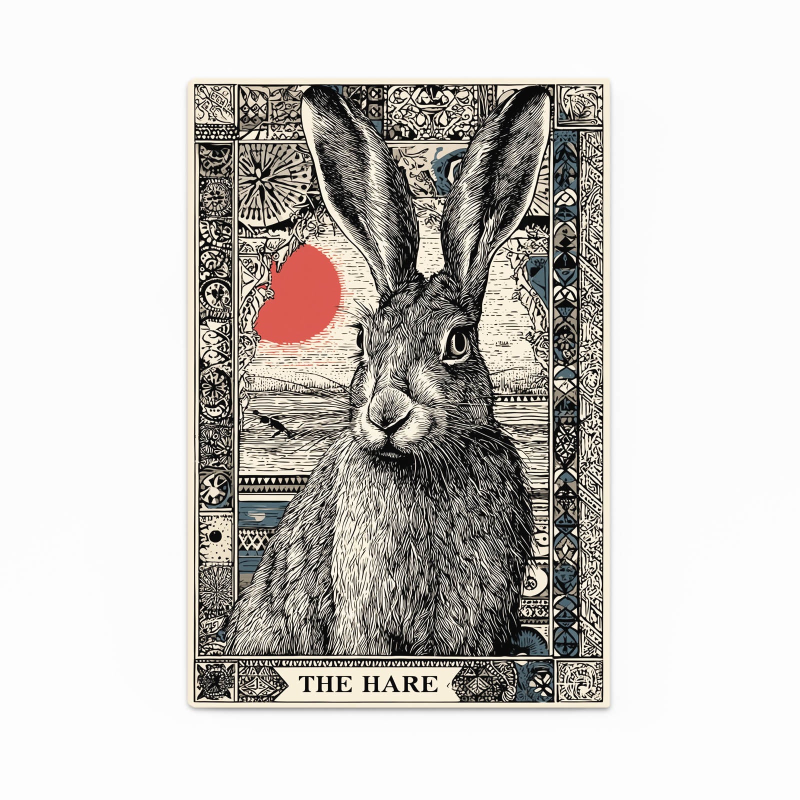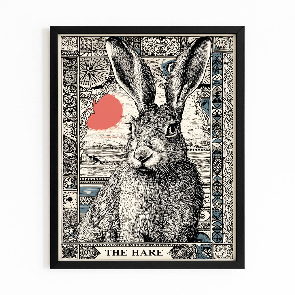 The artwork displays a beautifully illustrated hare surrounded by intricate border details, enhanced by a delicate red accent that draws the eye. Its refined lines, expressive posture, and balanced composition add a touch of warmth and character to your room. This design naturally promotes a sense of comfort, serenity, and visual storytelling.