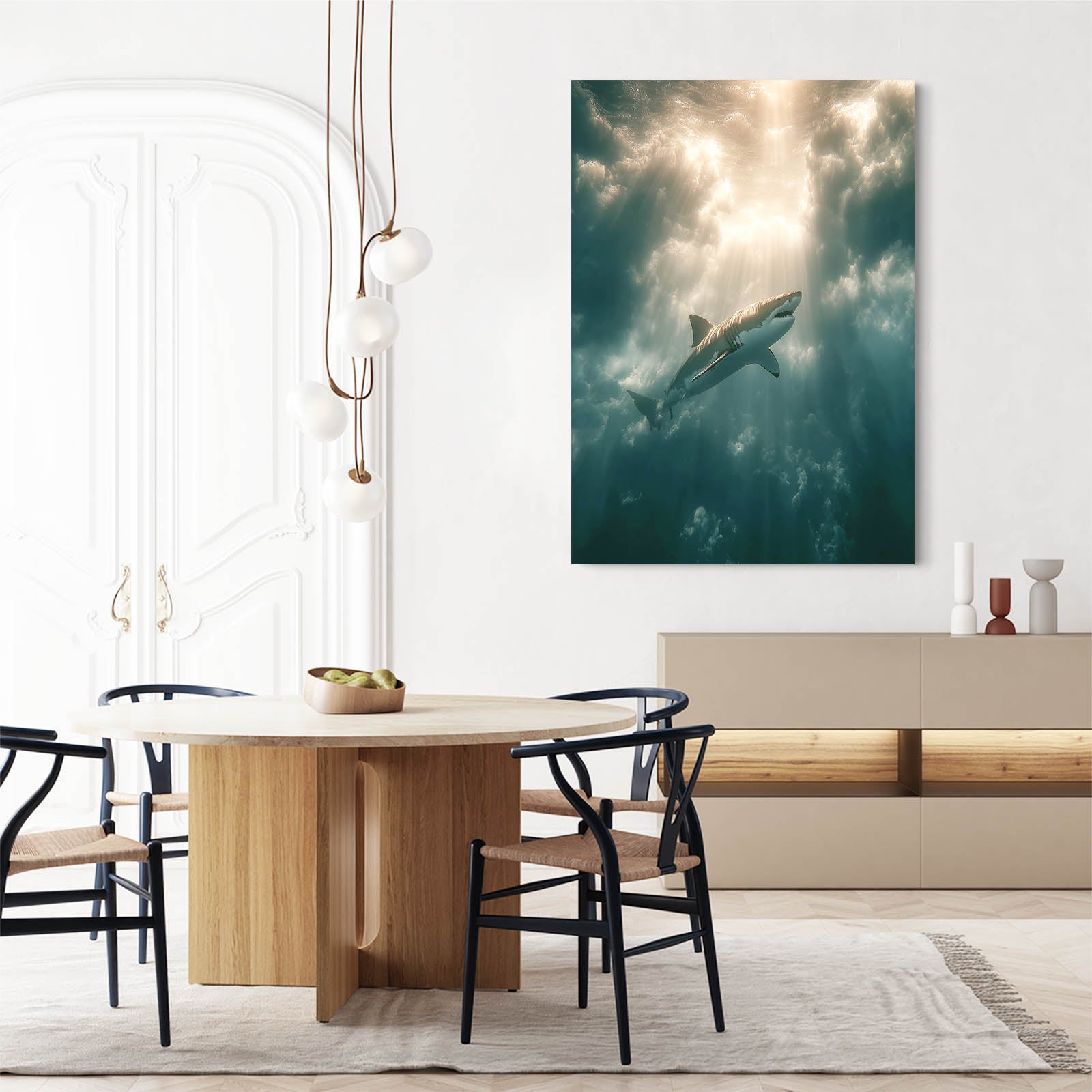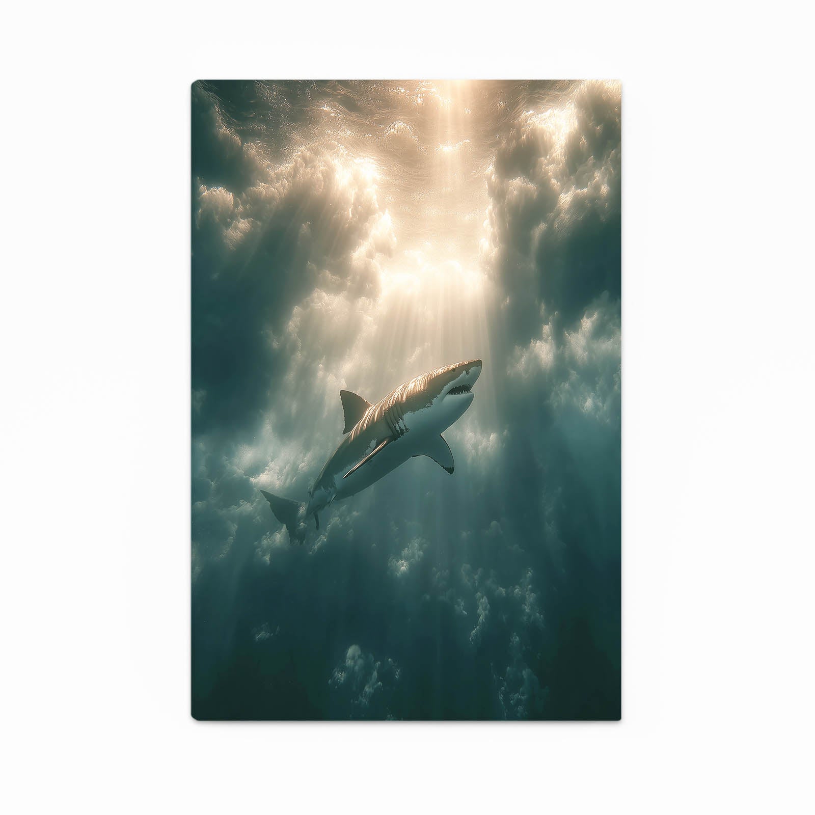Early in the experience, Photography Shark Canvas reveals a dramatic underwater moment where light rays, deep ocean tones, and powerful presence come together naturally. The upward movement of the shark creates a feeling of hope, strength, and quiet determination, guiding the viewer’s eye toward the light above. This visual journey subtly activates curiosity and emotional connection.