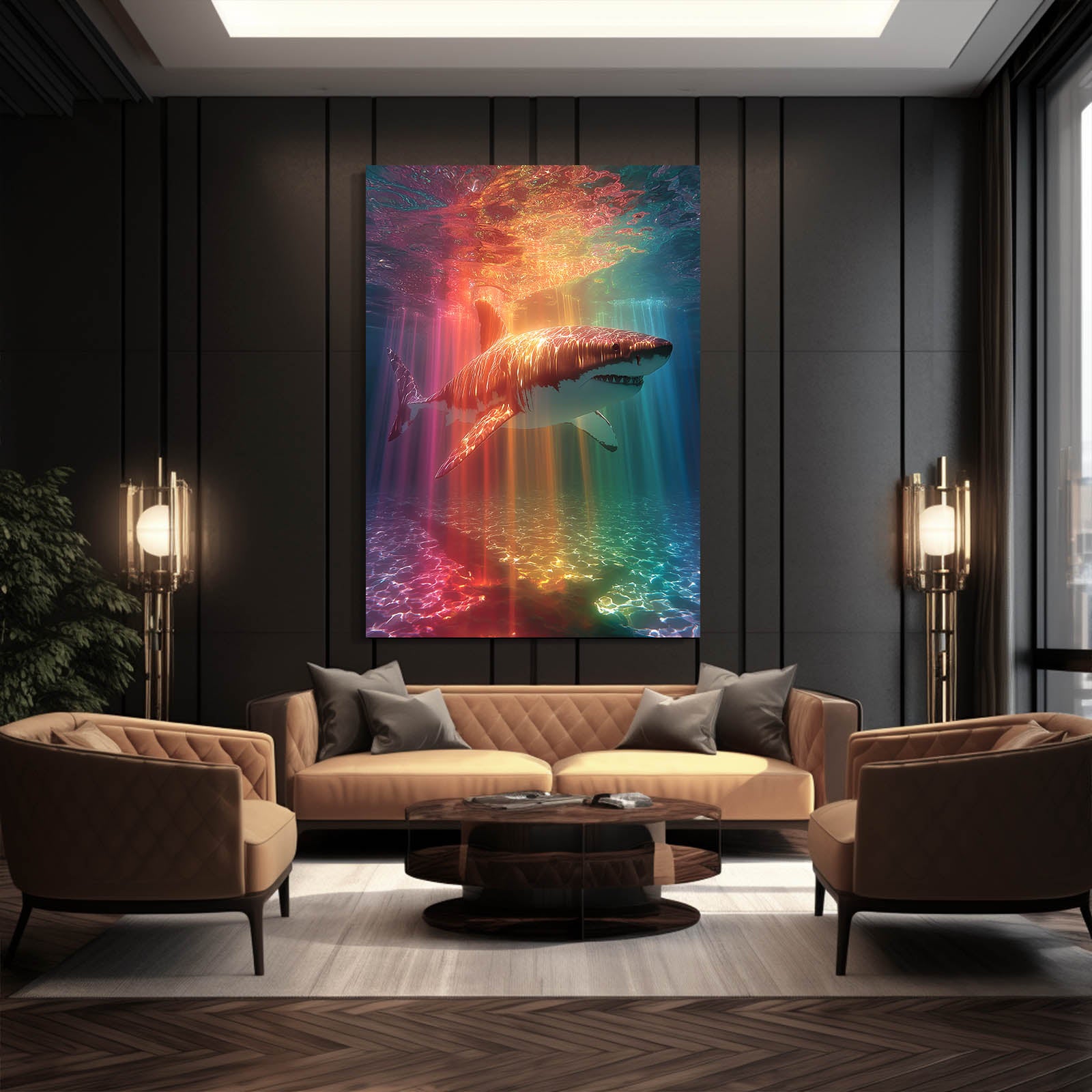 Early in the visual journey, Rainbow Shark Art instantly captivates with radiant light beams flowing through deep water, creating a sense of freedom, energy, and calm confidence. The shark glides effortlessly through a luminous underwater world, allowing the viewer to mentally step into a peaceful yet powerful moment. This artwork naturally activates curiosity and emotional connection.