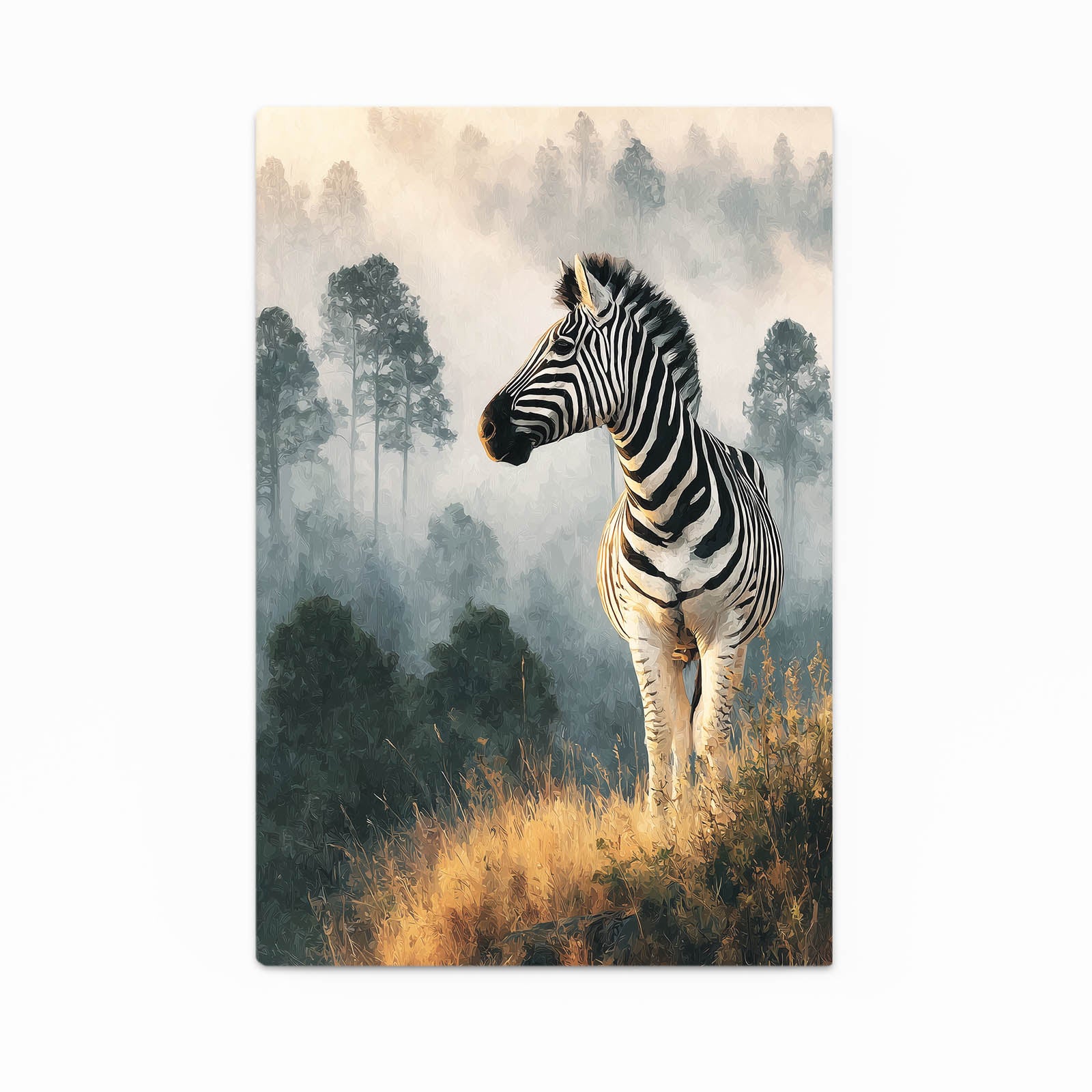 Soft misty forest hues, warm golden grass, and gentle light contrasts work together to create a soothing visual flow. The zebra stands confidently within its environment. This harmony makes the artwork feel timeless and calming.