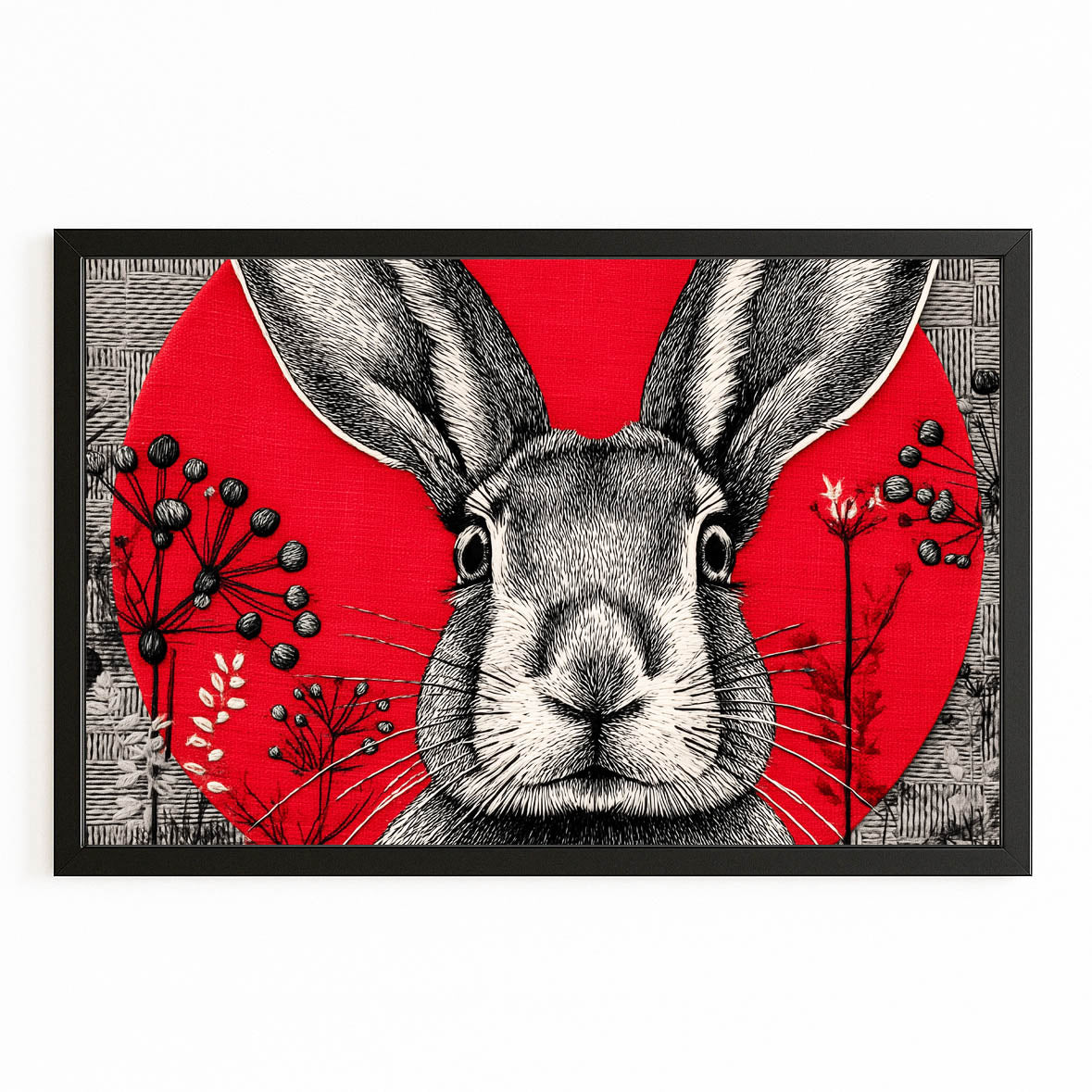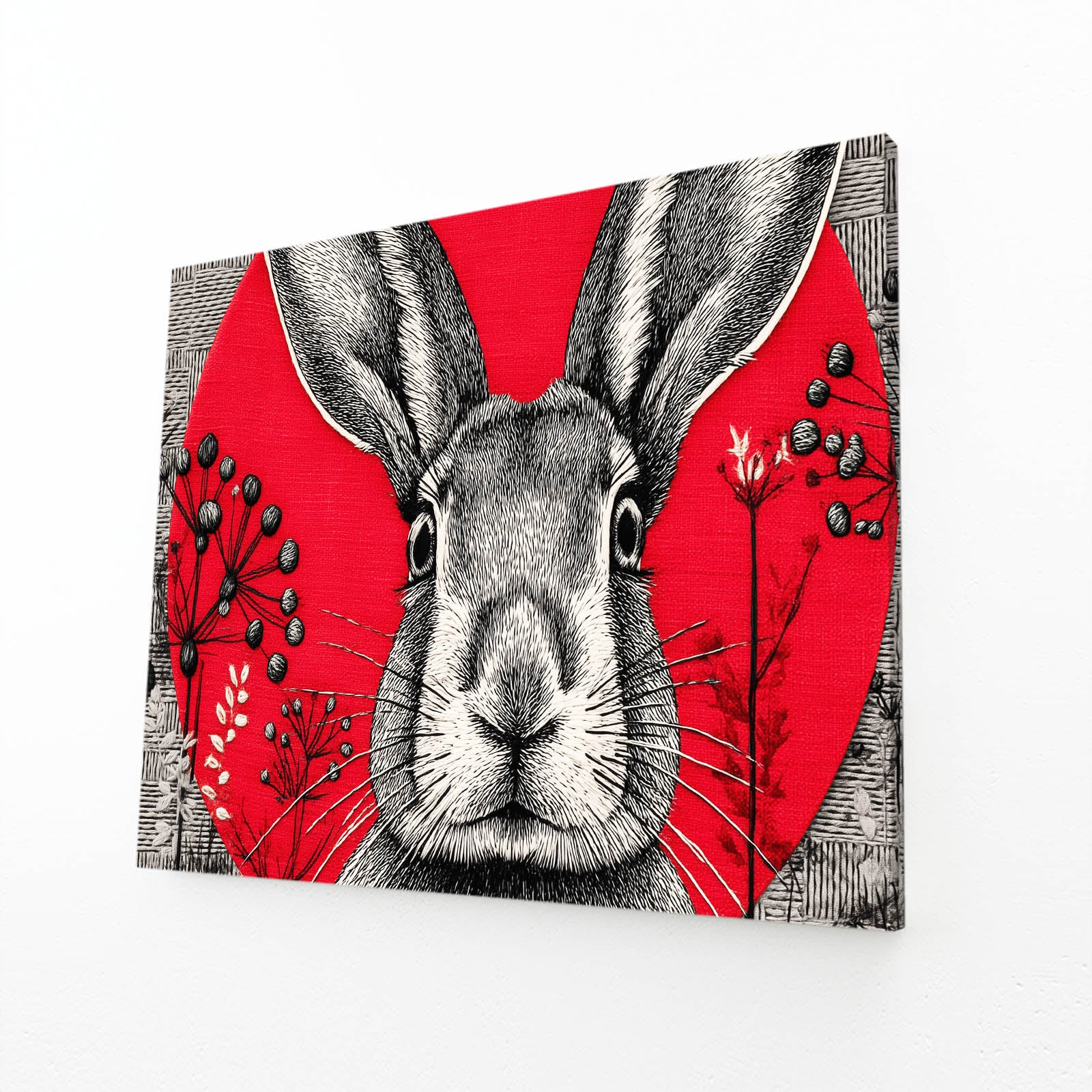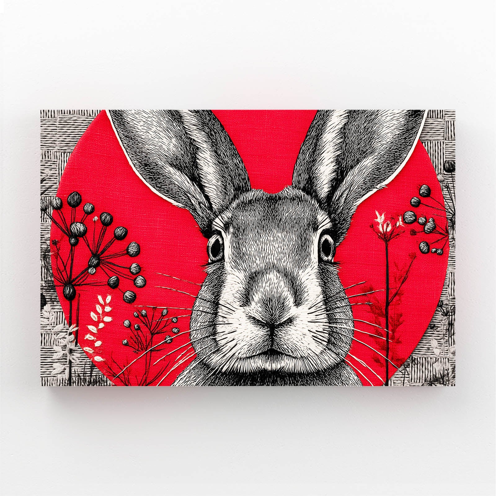 The striking red backdrop combined with the detailed black linework creates a powerful balance of contrast and elegance. The rabbit’s attentive expression, paired with the delicate botanical elements, brings a feeling of wonder, freshness, and creative charm. Its bold circular composition adds focus and visual harmony to any room.