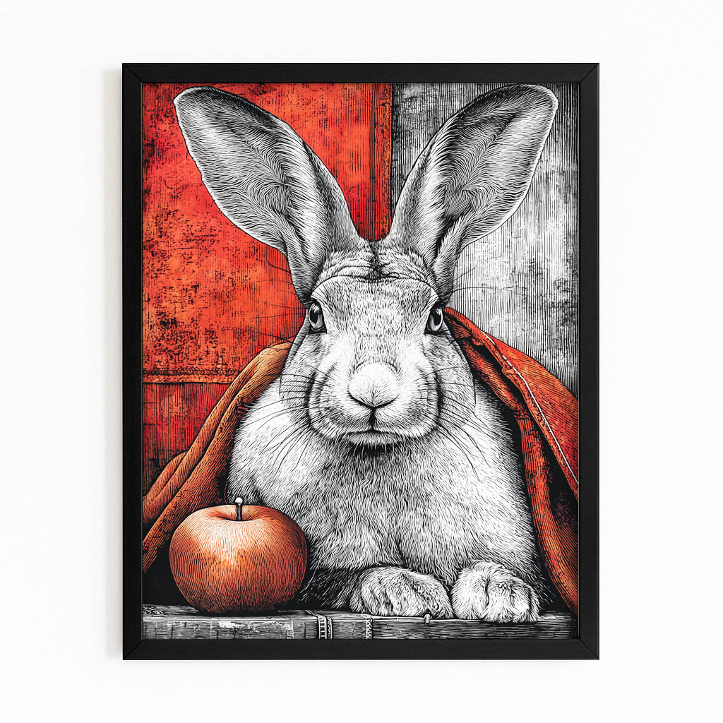 The bold mix of deep red, rich grey, and detailed black outlines creates a powerful contrast that feels both elegant and expressive. The rabbit’s poised posture, soft shading, and thoughtful composition invite a sensation of calm, balance, and gentle charm. The added apple detail enriches the scene with symbolism and visual interest, making it a standout piece.